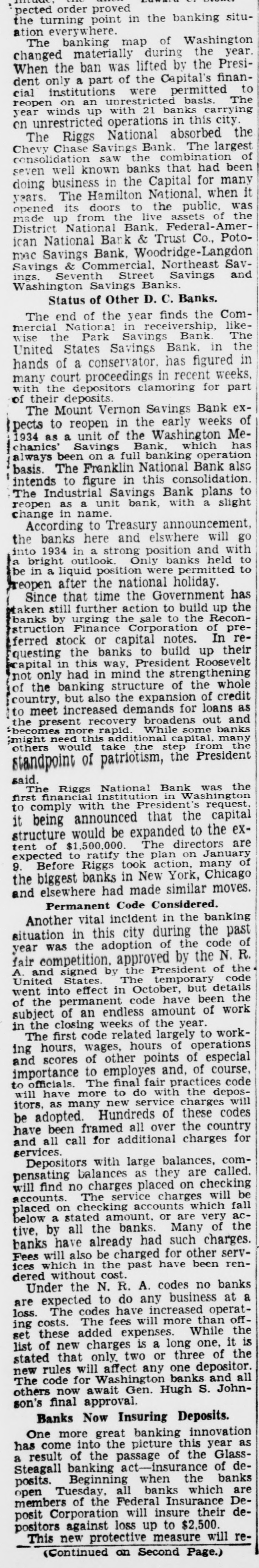 order the proved the point banking pecteuring ation of The the the Presithe ban When a the finanto year city the The Riggs largest had been that banks for many doing Capital it when National. was the public.f the AmerFederalCo., PotoTrust ican Bank, Langdon Savings & SavSavings Northeast and ings. Savings Banks of Banks. D.C. Other Status the of Comthe finds end The likeThe Bank Savings in the Bank Savings has of figured in weeks. recent for part Bank The Savings Vernon Mount of the in early to weeks reopen pects Meof the as 1934 Savings chanics full been opera always Bank The basis. Franklin in this to intends to The Bank plans a with unit slight bank, reopen in change to cement, Treasury According will go and 'here the banks in with and into 1934 to held to in be the holiday. after heopen has the time that Since to the up still build action taken further to the by the Reconurging banks of prestruction In reor stock Finance pital up to their build banks goosevelt capital ,not only Romening of the structure the questing ferred the this way, mind the strengt of the of whole credit country, as for to loans out and broadens While banks some many apital, ;might the the step would others the of President patriotism, standpoint said. the was Riggs to the that capital being exthe to are the many took Riggs action. in New York, the Chicago banks similar had moves. made Code in the vital Conside banking Another the past city this incidenduring of of situation the code R. adoption N. the by fair of the by and code United in into went temporary details the code the an October have been of work amount the of in year. the to workfirst The largely ing wages. hours, of of other and points scores of subject closing of code weeks related hours of operations especial of to and, special employes The code final importance the to with will have more as itors, many of these chargesodes be adopted the all Hundredover country been framed have for for all call and charges additional large with they balances, called. comensating on no find will Checking placed be will fall which placed checking or acare very stated of the Many banks. such charges. banks be will also Fees in the past which ices cost. by a have all already the charged had have for other been serv- renwithout no A. R. N. banks codes at are business The expected operatwill The While dered Under the to have do any increase more off- the set it one, expenses of list new charges the or two that stated loss. ing costs. these added three of one will deposit new rules all and for banks code S. JohnHugh Gen. The now others final son's approval. Now Deposits. Banks Insuring great banking innovati as this year has picture the of Glassact banking steagall the when One come more into the the passa insurance of of banks deare Beginning which Tuesday, of Dethe Federal members dewill their insure posit to up loss $2,500. rewill This measure Continued positors new protective on Page.)