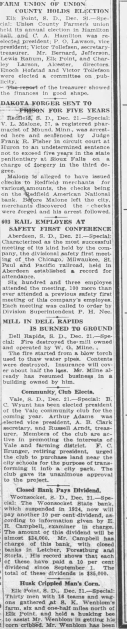 FARM UNION OF UNION COUNTY HOLDS ELECTION Elk Point, D., Dec. clal: Union County Farmer's union held its annual election in Hamilton hall, and C. Hamilton was reelected president: O. Lawson, vice president; Victor Tollefsen, secretary treasurer. Mr. Bernard, Jefferson Lewis Ranum, Elk Point, and Charley Larson, Alcester, directors. Enoch Hofstad and Victor Tollefson were elected committee on publicity of the treasurer showed the finances in good shape. DAKOTA FORGER SENT TO PRISON FOR FIVE YEARS S. D., Dec. V. L. Malone, 27, registered pharmacist of Mound, Minn., arrested here and sentenced by Judge Frank R. Fisher in circuit court at Huron to an undetermined sentence not to exceed five years in the state penitentiary at Sioux Falls on charge of forgery in the third degree. Malone is alleged to have issued checks to Redfield for the checks being on the Redfield American National bank. Before Malone left the city, merchants the checks were forged and his arrest followed. 603 RAIL EMPLOYES AT SAFETY FIRST CONFERENCE Aberdeen, S. D., Dec. 21.-Special: Characterized as the most successful meeting of its kind held by the company, the divisional safety first meeting of the Chicago, Milwaukee, St. Paul and Pacific held in Aberdeen established record for attendance. Six hundred and three employes the meeting, 100 more than ever previous safety first of this company employes Each was called to order by Division Superintendent P. H. Nee. MILL IN DELL RAPIDS IS BURNED TO GROUND Dell Rapids, S. D., Dec. 21.-Special: Fire owned and operated by W. G, Milne. The fire from blow torch used to thaw pipes. Contents were Insurance will COVer half the less. Mr. Milne already has business in building owned by him. Community, Club Elects. Vale, S. D., Dec. 21.-Special: B. Wyant has been elected president of the Vale community club for the coming year. Arthur Adams was elected vice president, B. Clark secretary, and Russell Arndt, treasurer. Members of the club are tive in promoting the interests of Vale and farming district. F. C. Brunger, retiring president, urged the club to purchase land near the city schools for the purpose of transforming it into city park. The club gave its unanlmous approval to the project. Closed Bank Pays Dividend. Woonsocket, S. D., Dec. 21.-Special: The Woonsocket State bank, which suspended in 1924, now will pay another 10 per cent dividend, ascording to information given by E. R. Campbell, examiner in charge. The amount of this dividend will be almost $34,000. Mr. Campbell has charge of this bank, with closed banks in Letcher, Forestburg and Storla. His record shows that each these have paid 10 per cent dividend since September The total of these dividends is $85,000. Husk Crippled Man's Corn. Elk Point, S. D., Dec. -Special Thirty men with 16 and wag. ons gathered at 8. K. Wenblom's farm, six and miles north of Elk Point, and held husking bee to assist Mr in getting his corn cribbed. Mr. Wenblom has been