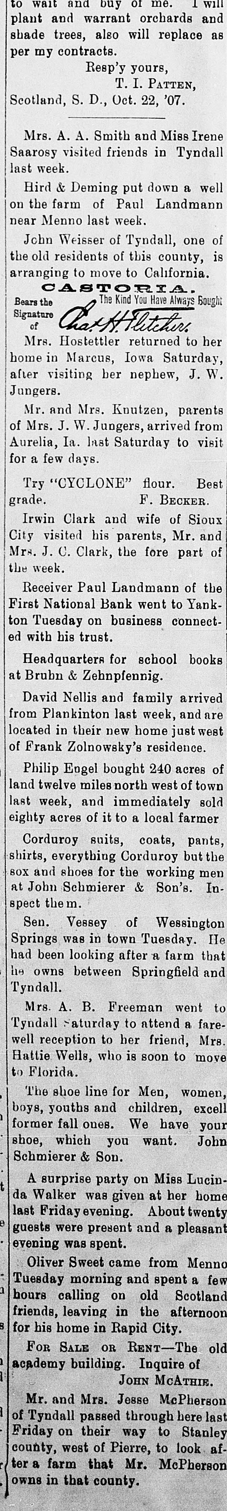 to wait and buy of me. I will plant and warrant orchards and shade trees, also will replace as per my contracts. Resp'y yours, T. I. PATTEN, Scotland, S. D., Oct. 22, '07. Mrs. A. A. Smith and Miss Irene Saarosy visited friends in Tyndall last week. Hird & Deming put down a well on the farm of Paul Landmann near Menno last week. John Weisser of Tyndall, one of the old residents of this county, is arranging to move to California. Mrs. Hostettler returned to her home in Marcus, Iowa Saturday, after visiting her nephew, J. W. Jungers. Mr. and Mrs. Knutzen, parents of Mrs. J. W. Jungers, arrived from Aurelia, Ia. last Saturday to visit for a few days. Try "CYCLONE" flour. Best grade. F. BECKER. Irwin Clark and wife of Sioux City visited his parents, Mr. and Mrs. J. C. Clark, the fore part of the week. Receiver Paul Landmann of the First National Bank went to Yankton Tuesday on business connected with his trust. Headquarters for school books at Brubn & Zehnpfennig. David Nellis and family arrived from Plankinton last week, and are located in their new home just west of Frank Zolnowsky's residence. Philip Engel bought 240 acres of land twelve miles north west of town last week, and immediately sold eighty acres of it to a local farmer Corduroy suits, coats, pants, shirts, everything Corduroy but the sox and shoes for the working men at John Schmierer & Son's. Inspect them. Sen. Vessey of Wessington Springs was in town Tuesday. He had been looking after a farm that he owns between Springfield and Tyndall. Mrs. A. B. Freeman went to Tyndall Saturday to attend a farewell reception to her friend, Mrs. Hattie Wells, who is soon to move to Florida. The shoe line for Men, women, boys, youths and children, excell former fall ones. We have your shoe, which you want. John Schmierer & Son. A surprise party on Miss Lucinda Walker was given at her home last Friday evening. About twenty guests were present and a pleasant evening was spent. Oliver Sweet came from Menno Tuesday morning and spent a few hours calling on old Scotland friends, leaving in the afternoon for his home in Rapid City. FOR SALE OR RENT-The old academy building. Inquire of JOHN MCATHIE. Mr. and Mrs. Jesse McPherson of Tyndall passed through here last Friday on their way to Stanley county, west of Pierre, to look after a farm that Mr. McPherson owns in that county.