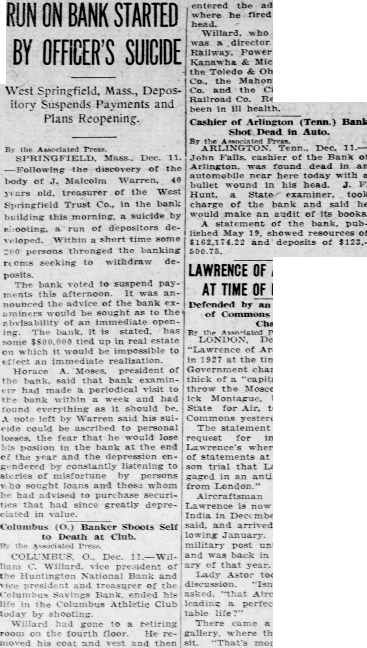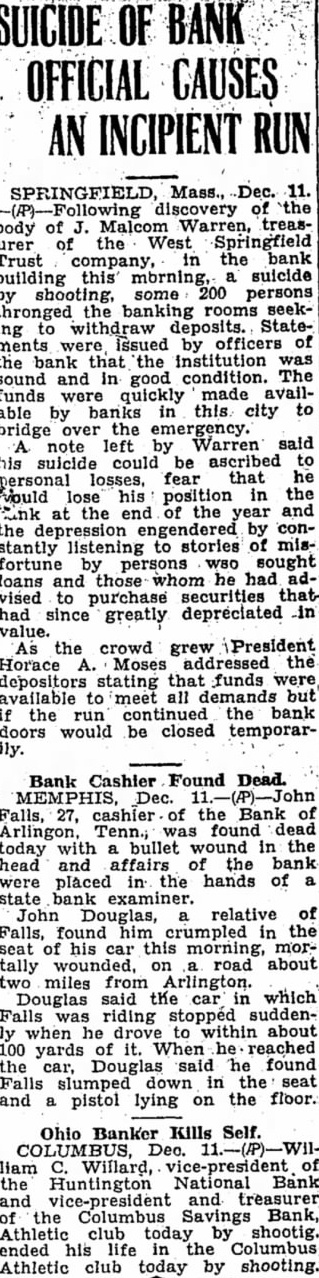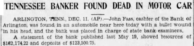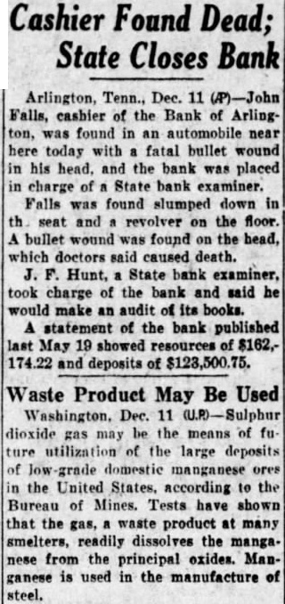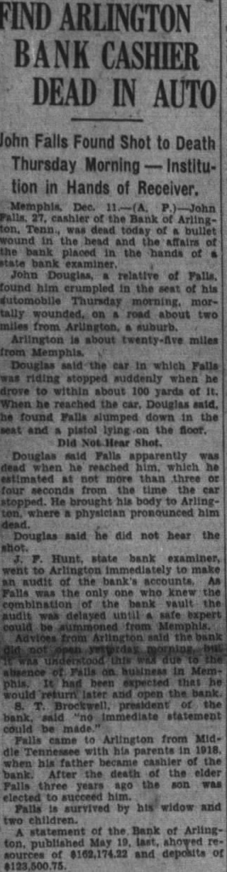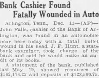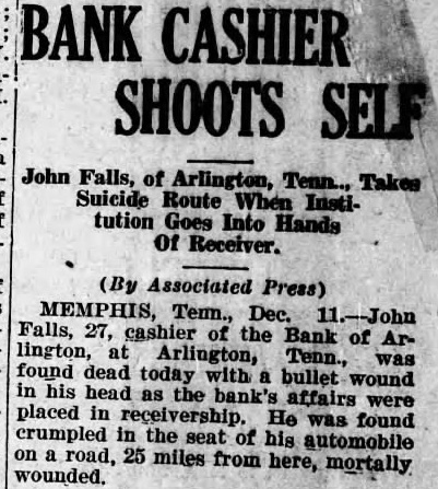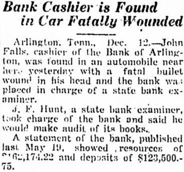 Reasons for the sudden suicide of Mr. Falls, who was buried yesterday in the Arlington Cemetery, have not appeared thus far. He shot himself on the old Brownsvill highway, two miles west of Arlington, 8:30 o'clock Thursday morning, just half hour before he with the bank directors, was to have met with Mr. Hunt. Mr. Hunt made an audit of the bank last Saturday and at that time found there was not sufficient cash reserve on hand. He ordered Mr. Falls and the directors to increase their cash reserve by proximately $7,700 or close the bank. Under the law, they had 30 days in which to meet this requirement. Mr. Falls was elected cashier of the bank ago when his father, Falls, died. The nior Falls president and cashier and his son assistant cashier. The bank was one-man institution so far as its conduct was concerned, and the younger Falls had complete charge at the time of his death.