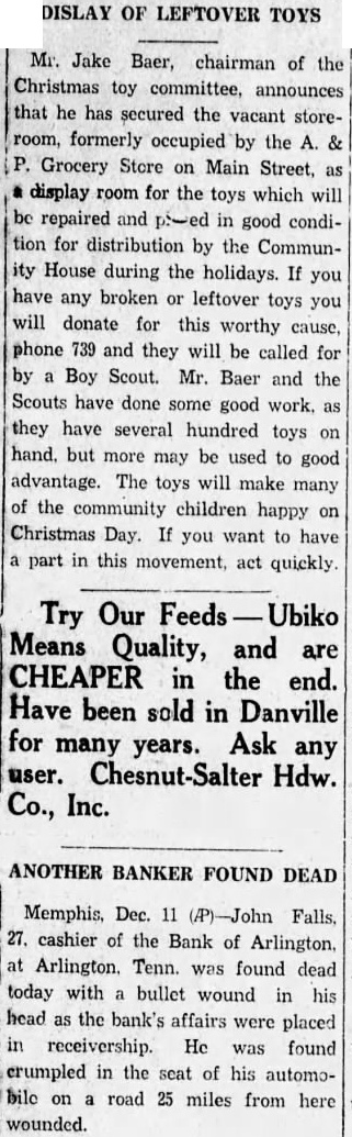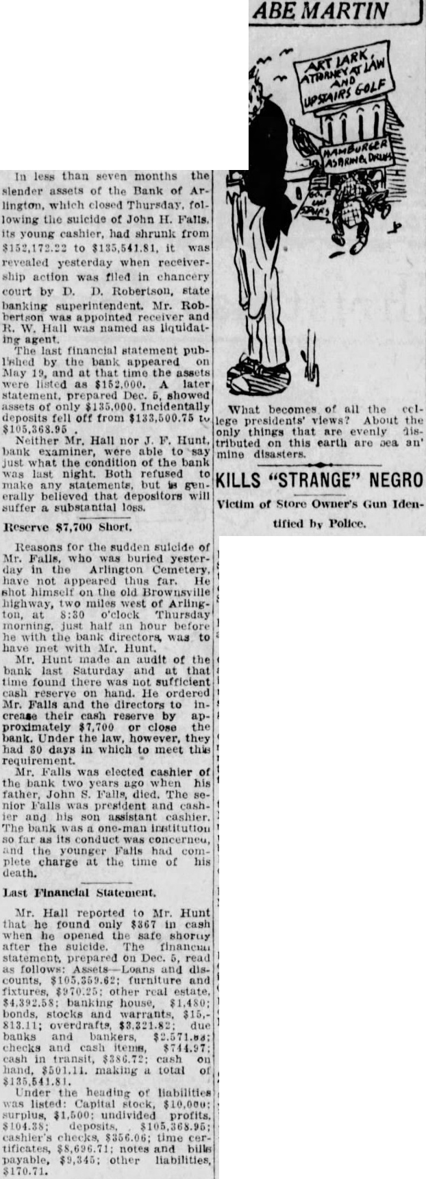 In less than seven months the slender assets of the Bank of Arlington, which closed Thursday. following the suicide of John H. Falls. its young cashier, had shrunk from $152,172.22 to $135,541.81, it was revealed yesterday when receivership action was filed in chancery court by D. D. Robertson, state banking superintendent. Mr. Robbertson was appointed and R. W. Hall was named as liquidating agent. last financial statement pubEshed by the bank appeared on May 19, and at that time the assets were listed as $152,000. later statement. prepared Dec. showed assets of only $135,000. Incidentally What becomes of all the ecldeposits fell off from $133,500.75 lege presidents' views? About $105,368.95 things that only evenly Neither Mr. Hall nor F. Hunt. tributed on this earth are sea an' bank examiner, were able to disasters. mine just what the condition of the bank was last night. Both refused to KILLS "STRANGE" NEGRO make any statements, but is generally believed that depositors will Victim of Store Owner's Gun Idensuffer substantial loss. tified by Police. Reserve $7,700 Short.