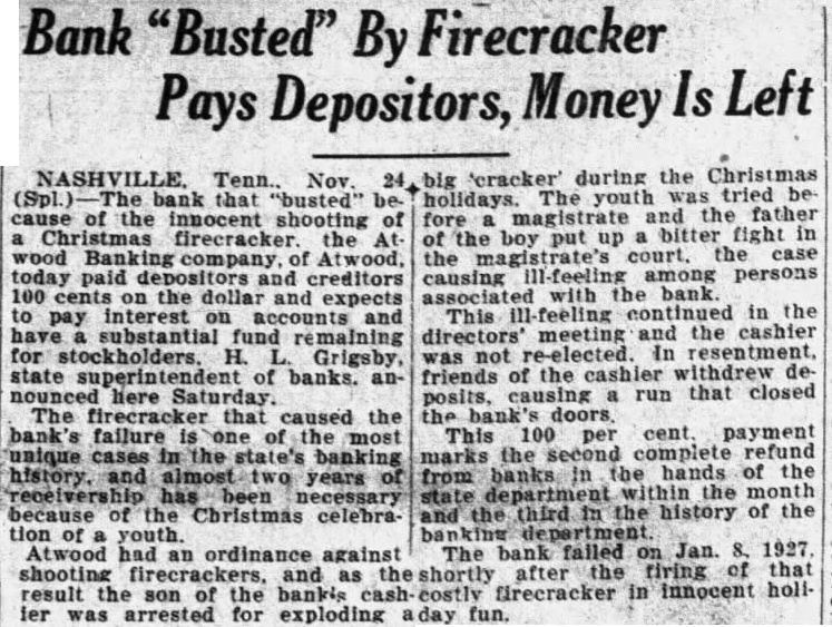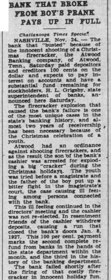 Bank "Busted" By Firecracker Pays Depositors, Money Is Left NASHVILLE. Tenn. Nov. (Spl.) The bank that "busted" because of the innocent shooting of a Christmas firecracker. the At wood Banking company, of Atwood, today paid depositors and creditors 100 cents on the dollar and expects to pay interest on accounts and have substantial fund remaining for stockholders. H. Grigsby, state superintendent of banks. announced here Saturday. The firecracker that caused the bank's failure is one of the most unique cases in the banking history. and almost two years or receivership has been because of the Christmas celebration of youth. Atwood had an ordinance against shooting firecrackers, and as the ier was arrested for exploding aday fun. 24, big 'cracker' during the Christmas holidays. The youth tried be fore magistrate and the father of the boy put up a bitter fight in the magistrate's court. the case causing ill-feeling among persons associated with the bank This ill-feeling continued in the directors' meeting and the cashier was not re-elected. In resentment. friends of the cashier withdrew deposits, causing a run that closed the bank This 100 per cent payment marks the second complete refund from banks in the hands of the state department within the month and the third in the history of the The bank failed on Jan. 8, 1927 after the firing of that shortly