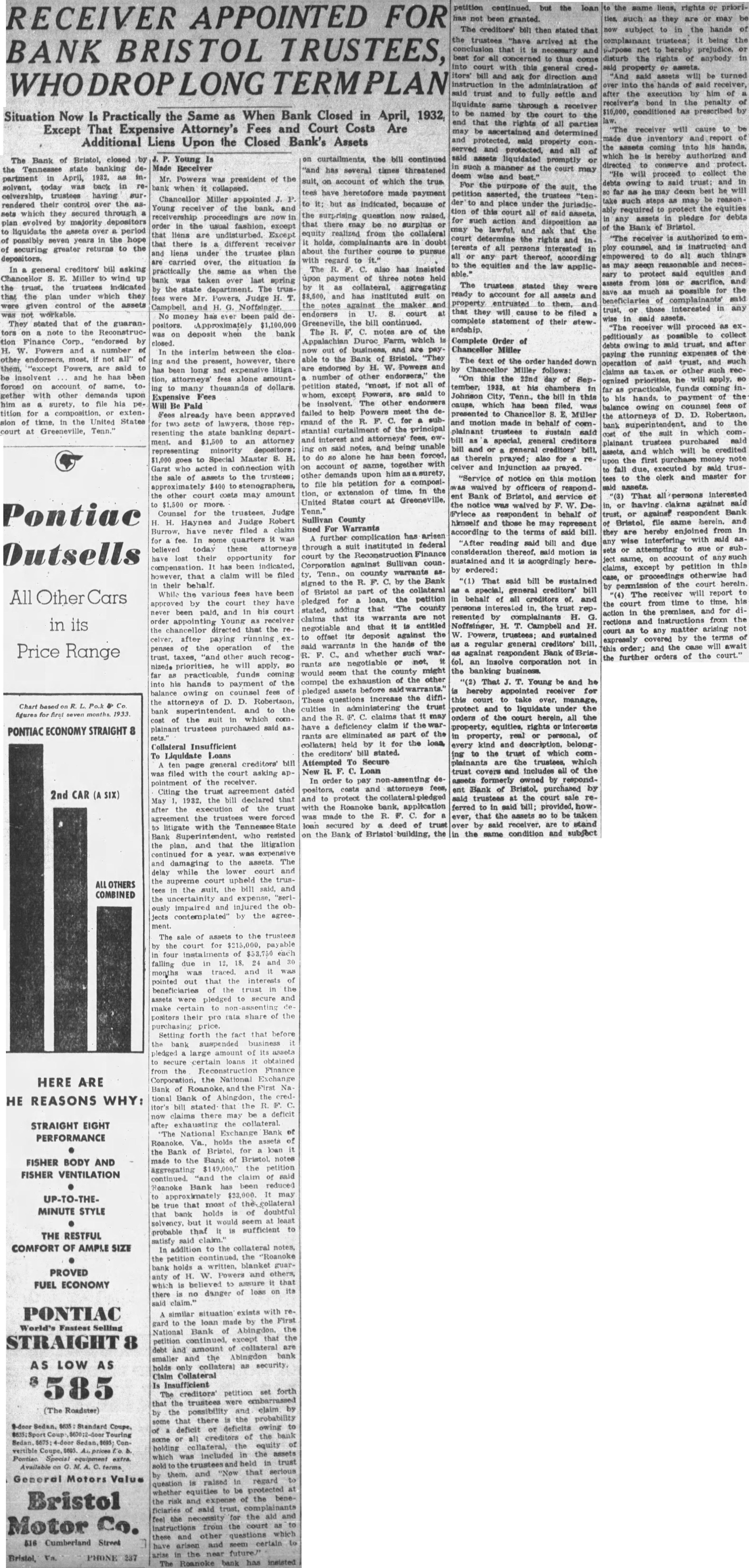 Mr. Powers was president of the bank when it collapsed. Chancellor Miller appointed Young receiver the bank, and receivership proceedings are now in order in the usual fashion, except that liens are undisturbed. Except that there is different receiver and liens under the trustee plan are carried over, the situation practically the same as when the bank taken over last spring by the state department. The truswere Mr. Powers, Judge H. Campbell, and H. G. Noffsinger. No money has ever been paid positors. Approximately was on deposit when the bank closed. In the interim between the closing and the present, however, there has been long and expensive litiga tion, attorneys' fees alone amounting to many thousands of Expensive Fees Will Be Paid Fees already have been approved for two sets of lawyers, those rep. resenting the state banking department. and $1,500 to an attorney representing minority depositors; $1,000 goes to Special Master S. H. Garst who acted in connection with the sale of assets to the trustees; approximately $400 to stenographers, the other court costs may amount $1,500 or more. Pontiac Counsel for the trustees, Judge H. Haynes and Judge Robert Burrow, have never filed claim for fee In some quarters was believed today these attorneys Outsells have lost their opportunity for compensation. It has been indicated. however, that claim will be filed their behalf. While the various fees have been All Other approved by the court they have never been paid, and in his court order appointing Young receiver in its the chancellor directed that the receiver, after paying running penses of the operation the Price Range trust. taxes, "and other such recognizede priorities, will apply. BO far practicable, funds coming into his hands to payment of the balance owing on counsel fees of the attorneys of D. D. Robertson, bank superintendent. and to the figures for months. cost of the suit which complainant trustees purchased said asPONTIAC ECONOMY STRAIGHT Collateral Insufficient To Liquidate Loans ten page general creditors' bill filed with the court asking appointment of the receiver. Citing the trust agreement dated 2nd CAR May 1932, the bill declared that after the of the trust agreement the trustees were forced to litigate with the State Bank who resisted the and that the litigation continued for year. expensive damaging to the assets. The delay while the lower court and the supreme court upheld the trusALL tees in the suit, the bill said, and COMBINED the uncertainity and expense, "serlously impaired and injured the objects contemplated" by the agreement.