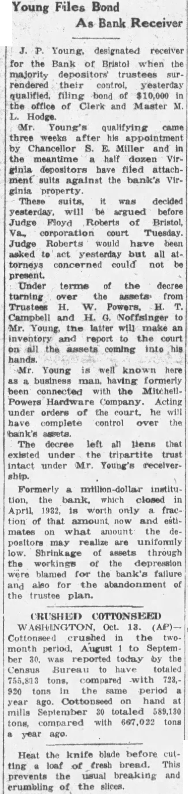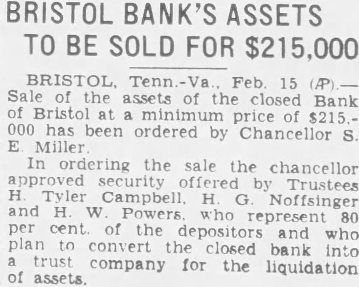 The sale of assets to the trustees by the court for $215,000, four instalments of $53,750 falling due 12, 18, and months was traced. and was pointed out that the interests of beneficiaries of the trust in the assets were pledged to secure and make certain to positors their pro rata share of the price. Setting forth the fact that before the bank suspended pledged large amount of assets secure certain loans obtained from the Reconstruction Finance Corporation, the National Exchange Bank of Roanoke, the First Na tional Bank of Abingdon, the credbill stated that the R. itor's may be deficit claims there after exhausting the collateral. "The National Exchange Bank of Roanoke, Va., holds the assets of Bank of Bristol, for loan the made to the Bank of Bristol. notes the petition aggregating "and the claim of said continued. Roanoke Bank has been reduced approximately $23,000. may true that most of that bank holds of doubtful solvency, but would seem at least probable that sufficient to satisfy said claim." In addition to the collateral notes, the petition continued. the "Roanoke bank holds written, blanket guarW. Powers and others, anty which believed to it that of loss on its there no danger said claim." exists with resimilar situation made by the First gard to the loan of the National Bank except that the petition continued, collateral are and amount Abingdon bank smaller and holds only as Claim Collateral Insufficient set forth The creditors' petition that the trustees were embarrassed by and claim the possibility there the probability some that deficits owing to deficit or of the bank or all creditors some the equity of holding collateral, the assets which included was trust the that serious by them. and raised regard question to be protected whether equities the the risk and ficiaries said trust, the and feel the from the court questions which these and other and seem certain have arisen arise the The on curtailments, the bill continued "and has several times threatened sult, on account of which the trus. tees have heretofore made payment to it: but as Indicated, because of the surprising question now raised. that there may be no surplus or equity realized from the collateral holds, complainants are in doubt about the further course to pursue with regard to The also has insisted upon payment of three notes held by collateral, aggregating $8,500, and has instituted suit on the notes against the maker and endorsers in court at Greeneville, the bill continued. The R. C. notes are of the Appalachian Duroc Farm, which now out of business, and are pay. able to the Bank of Bristol. "They are endorsed by H. Powers and number of other endorsers,' the petition stated, "most, if not all of whom, except Powers, are said to be insolvent. The other endorsers failed to help Powers meet the deof the R. C. for submand stantial curtailment of the principal and interest and fees, ow. notes, and being unable ing on said to do so alone he has been forced, together with on account of same, other demands upon surety. to file his petition for composition, extension of time, in the States court at Greeneville, United Tenn." Sullivan County Sued For Warrants further complication has arisen through suit instituted in federal court by the Reconstruction Finance Corporation against Sullivan county, Tenn., on county warrants assigned to the R. F. by the Bank of Bristol as part of the collateral loan, the petition pledged for stated, adding that "The county claims that its warrants are not negotiable and that it is entitled to offset its deposit against the said warrants in the hands of the R. C., and whether such warrants are negotiable or not, would seem that the county might compel the exhaustion of the other pledged assets before increase the diffiThese questions administering the trust culties and the R. claims that it may have deficiency claim if warrants are eliminated as part of the collateral held by it for the loan the creditors' bill stated. Attempted To Secure New R. F. C. Loan In order to pay depositors, costs and attorneys fees, and to protect the with the Roanoke bank, application made to the R. C. for was loan secured by deed of trust the Bank of Bristol building, the on petition but the loan has not been granted. The creditors' bill then stated that the trustees "have arrived at the conclusion that and best for all to thus come into court with this general creditors' bill and ask for direction and instruction in the administration of said trust and to fully settle and liquidate same through receiver to be named by the court to the end that the rights of all parties may be ascertained and determined and protected, said property conserved and protected, and all of said assets liquidated promptly or in such manner as the court may deem wise and best." For the purpose of the suit, the petition asserted, the trustees "tender to and place under the jurisdiction of this court all said assets, for such action and disposition as may be lawful. and ask that the court determine the rights and interests of all interested in all or any part thereof, according to the equities and the law applicable.