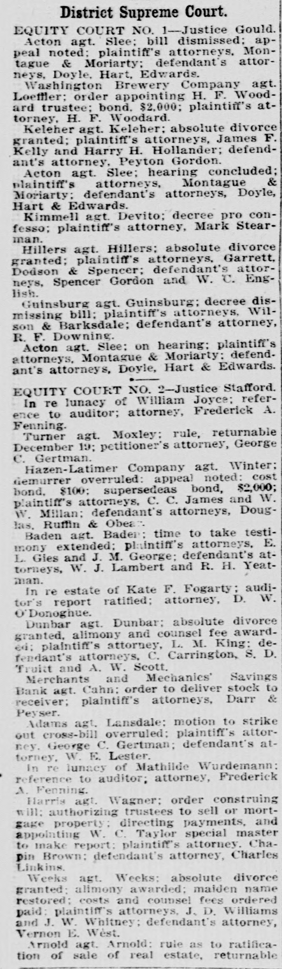 District Supreme Court. EQUITY COURT NO. 1-Justice Gould. Acton agt. Slee; bill dismissed; appeal noted: plaintiff's attorneys, Montague & Moriarty: defendant's attorneys, Doyle, Hart, Edwards. Washington Brewery Company agt. Loeffler: order appointing H. F. Woodard trustee; bond. $2,000; plaintiff's attorney, H. F. Woodard. Keleher agt. Keleher: absolute divorce granted; plaintiff's attorneys, James F. Kelly and Harry H. Hollander; defendant's attorney. Peyton Gordon. Acton agt. Slee: hearing concluded; plaintiff's attorneys, Montague & Moriarty: defendant's attorneys, Doyle, Hart & Edwards. Kimmell agt. Devito; decree pro confesso; plaintiff's attorney, Mark Stearman. Hillers agt. Hillers; absolute divorce granted; plaintiff's attorneys, Garrett, Dodson & Spencer; defendant's attorneys, Spencer Gordon and W. C. English. Guinsburg agt. Guinsburg: decree dismissing bill; plaintiff's attorneys, Wilson & Barksdale; defendant's attorney, R. F. Downing. Acton agt. Slee: on hearing: plaintiff's attorneys, Montague & Moriarty: defend. ant's attorneys, Doyle, Hart & Edwards. EQUITY COURT NO. 2-Justice Stafford. In re lunacy of William Joyce; reference to auditor; attorney, Frederick A. Fenning. Turner agt. Moxley: rule, returnable December 19; petitioner's attorney, George €. Gertman. Hazen-Latimer Company agt. Winter; demurrer overruled: appeal noted: cost bond, $100; supersedeas bond, $2,000; plaintiff's attorneys, C. C. James and W. W. Millan; defendant's attorneys, Douglas, Ruffin & Obean Baden agt. Baden: time to take testimony extended: plaintiff's attorneys, E. L. Gies and J. M. George: defendant's attorneys, W. J. Lambert and R. H. Yeatman. In re estate of Kate F. Fogarty: auditor's report ratified; attorney, D. W. O'Donoghue. Dunbar agt. Dunbar; absolute divorce granted, alimony and counsel fee awarded; plaintiff's attorney, L. M. King: defendant's attorneys, C. Carrington, S. D. Truitt and A. W. Scott. Merchants and Mechanics' Savings Bank agt. Cahn: order to deliver stock to receiver; plaintiff's attorneys, Darr & Peyser. Adams agt. Lansdale: motion to strike out cross-bill overruled: plaintiff's attorney. George C. Gertman; defendant's attorney, W. E. Lester. In re lunacy of Mathilde Wurdemann: reference to auditor; attorney, Frederick A. Fenning. Harris agt. Wagner; order construing will; authorizing trustees to sell or mortgage property; directing payments, and appointing W. C. Taylor special master to make report; plaintiff's attorney. Chapin Brown: defendant's attorney, Charles Linkins. Weeks agt. Weeks: absolute divorce granted: alimony awarded: maiden name restored; costs and counsel fees ordered paid: plaintiff's attorneys, J. D. Williams and J. W. Whitney; defendant's attorney, Vernon E. Wèst. Arnold agt. Arnold: rule as to ratification of sale of real estate, returnable