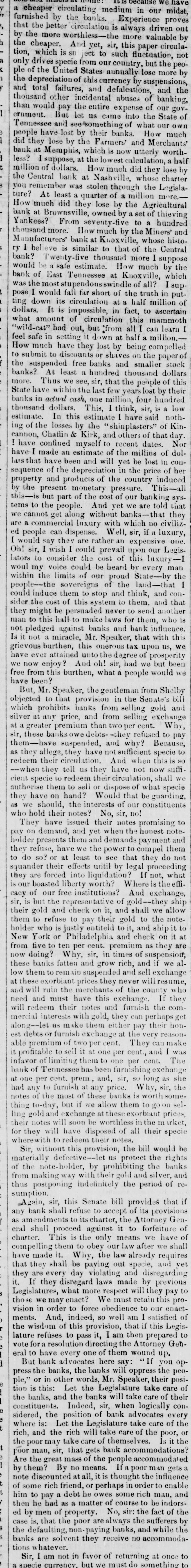 furnished by the banks. Experience driven out the better circulation is always valuable that more worthless- the more circulaby the And yet, sir, this paper not the cheaper. which is su ect to such fluctuation, the tion, drives specie from our country, but more peo- by ple of only the United States annually lose suspensions, depreciation of this currency by and the the total failures, and defalcations, of banking, thousand and other incidental abuses of our govlet us into came than would pay the entire expense the State of ernment. But and see something of what our much own Tennessee have lost by their banks. How Merchants' people lose by the Farmers' and worthbauk did they at Memphis, which now calculation, utterly half suppose, at the lowest lose million less? of dollars. How much did whose they charter by was remember the Central bank at stolen Nashville, through the Legislature? you At least quarter of million Agricultural did they lose by the How much at Brownsvill owned by set of thieving hundred bank From seventy-five to a Yankees? How much by the Miners' histo- and thousand more. bank at Knoxville, whose Manufacturers' believe is similar to that of the suppose Central bank? ry `wenty five thousand more much by the would be safe estimate. How which bank of East Tennessee at Knoxville, all? I supthe most stupendous windle of truth in putwas I would fall far short of the million of pose circulation at half ting down its impossible, in fact, to ascertain dollars. amount It is of circulation this mammoth learn what had out, but *from all I can "wild-cat" safe in setting down at half million. feel How much have they lost by being compelled paper of submit to discounts or shaves on the stock least hundred to the suspended free banks and thousand smaller dollars banks? Thus At we see, sir, that the people of their this more. have within the last few years lost hundred by banks State actual cash, one million, four low thousand dollars. This, think, sir, nothIn this estimate have said Kinestimate. of the losses by the shinplasters" that of ing Chaffin & Kirk, and other of Nor of an estimate cannon, have confined myself to recent the millins dates. of dolhave that made have been and will yet be lost in of con- her of the depreciation in the price induced sequence property and products of the country This-al by the present monetary pressure banking systhis-is but part of the cost of our told that tems to the people. along without And yet banks- we are they cannot commercial get luxury with which no luxury civilized people can dispense. Well, sir, if would say they are rather an LegisOh! sir, wish could prevail upon this laxury our consider the cost of lators woul my to voice could be heard by State-by every man the within the limits of our proud land-that people--the sovereigns of the and could induce them to stop and think, and that sider the cost of this system to them. they might be persuaded never to send who is this hall to make laws for them, man to against banks and bank influe not pledged miracle, Mr. Speaker, that with this Is it not : burthen, this onerous tax upon us, we grievous ever attained unto the degree of prosperity been have now enjoy And oh! sir, had we but free we from this burthen, what people would have been? But, Mr. Speaker, the gentlema from Shelby objected to that provision in the Senate's and which prohibits banks from selling gold silver at any price, and from selling exchange Why, greater premium than two per cent. these banks debts- -they refused to pay sir, them-have suspended, and why Because, as they allege they have not sufficient specie this redeem their And when --when they tell us they have not now specie to redeem their circulation, shall authorise cient them sell or dispose of what specie they have on hand? Would that be guarding, should, the interests of our constituents as who hold their notes? No. sir, no! to They have issued their notes promising demand, and yet when the honest holder presents them and demands payment them they refuse, have the power to compel do so? or at least to see that they do to squander their effects until by legal proceeding what are forced into liquidation? If not, they is our boasted liberty worth? Where cacy of our free institutions? And exchange, the of gold--they ship their gold and check on it, and shall we allow them to refuse to pay their gold to the holder who is justly entiteld to it, and ship New York or Philadelphia and check from five to ten per cent. premium as they are now doing? Why, sir, in times of suspension, these banks fatten and grow rich, and we low them suspended and sell exchange at exorbiant prices they never will resume, and ruin the merchants of the county they need and must have this exchange If will redeem their notes and furnish the mercial with gold, they can perhaps either us them pay the at est debts able They premium it profitable of per infavor limiting furnishing Why, furnish price. banks these of notes thing to-day, allow them to ling soon the their for they will have disposed of all their redeem their Sir, without this provision, the bill would be materially defective us protect the of the -holder, by prohibiting the banks from making way with their and thus postponing indefinitely the period of resumption Again, sir, this Senate bill provides that if any bank shall refuse to accept of its provisions as amendments to charter, the Attorney General shall proceed against it to forfeiture of of charter. This the only means we have compelling them to obey our law af have made it. Why, the law already requires that they shall be paying out specie, and vet they are every day violating and disregarding it. If they disregard laws made by previous to Legislatures, what more respect will they pay those we may enact? We must retain this provision in order to force obedience to our enactments. And, indeed, so well am satisfied of the wisdom of this provision, that if this Legislature refuses to pas