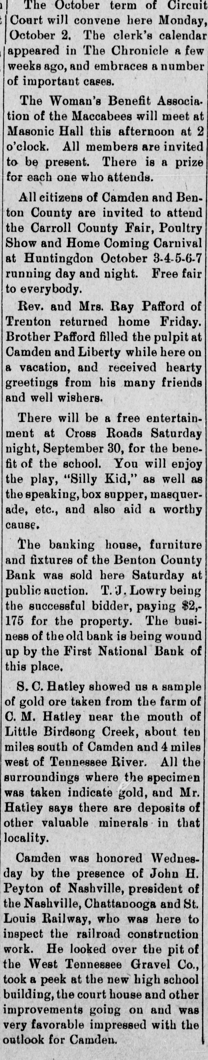 The October term of Circuit Court will convene here Monday, October 2. The clerk's calendar appeared in The Chronicle a few weeks ago, and embraces a number of important cases. The Woman's Benefit Associa. tion of the Maccabees will meet at Masonic Hall this afternoon at 2 o'clock. All members are invited to be present. There is a prize for each one who attends. All eitizens of Camden and Benton County are invited to attend the Carroll County Fair, Poultry Show and Home Coming Carnival at Huntingdon October 3-4-5-6-7 running day and night. Free fair to everybody. Rev. and Mrs. Ray Pafford of Trenton returned home Friday. Brother Pafford filled the pulpit at Camden and Liberty while here on a vacation, and received hearty greetings from his many friends and well wishers. There will be a free entertainment at Cross Roads Saturday night, September 30, for the benefit of the school. You will enjoy the play, "Silly Kid," as well as the speaking, box supper, masquerade, etc., and also aid a worthy cause. The banking house, furniture and fixtures of the Benton County Bank was sold here Saturday at public auction. T.J. Lowry being the successful bidder, paying $2,175 for the property. The business of the old bank is being wound up by the First National Bank of this place. S. C. Hatley showed us a sample of gold ore taken from the farm of C. M. Hatley near the mouth of Little Birdsong Creek, about ten miles south of Camden and 4 miles west of Tennessee River. All the surroundings where the specimen was taken indicate gold, and Mr. Hatley says there are deposits of other valuable minerals in that locality. Camden was honored Wednesday by the presence of John H. Peyton of Nashville, president of the Nashville, Chattanooga and St. Louis Railway, who was here to inspect the railroad construction work. He looked over the pit of the West Tennessee Gravel Co., took a peek at the new high school building, the court house and other improvements going on and was very favorable impressed with the outlook for Camden.