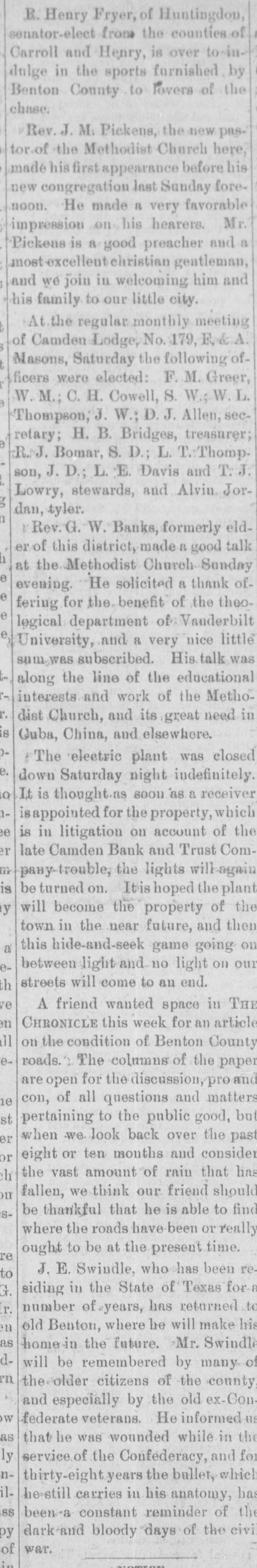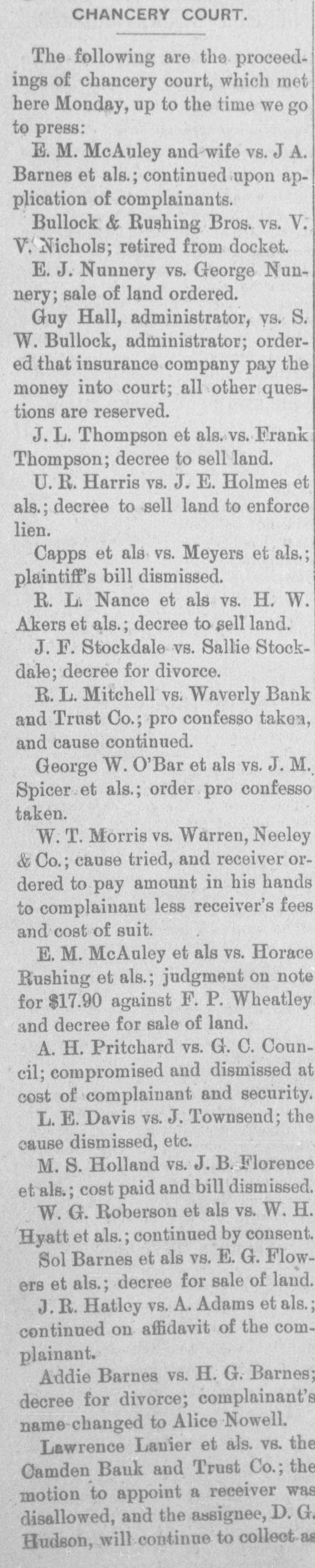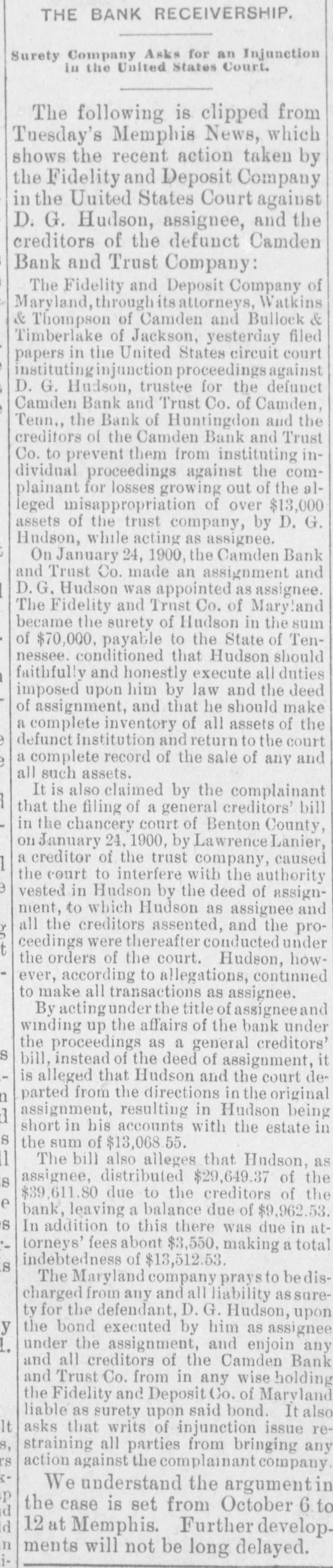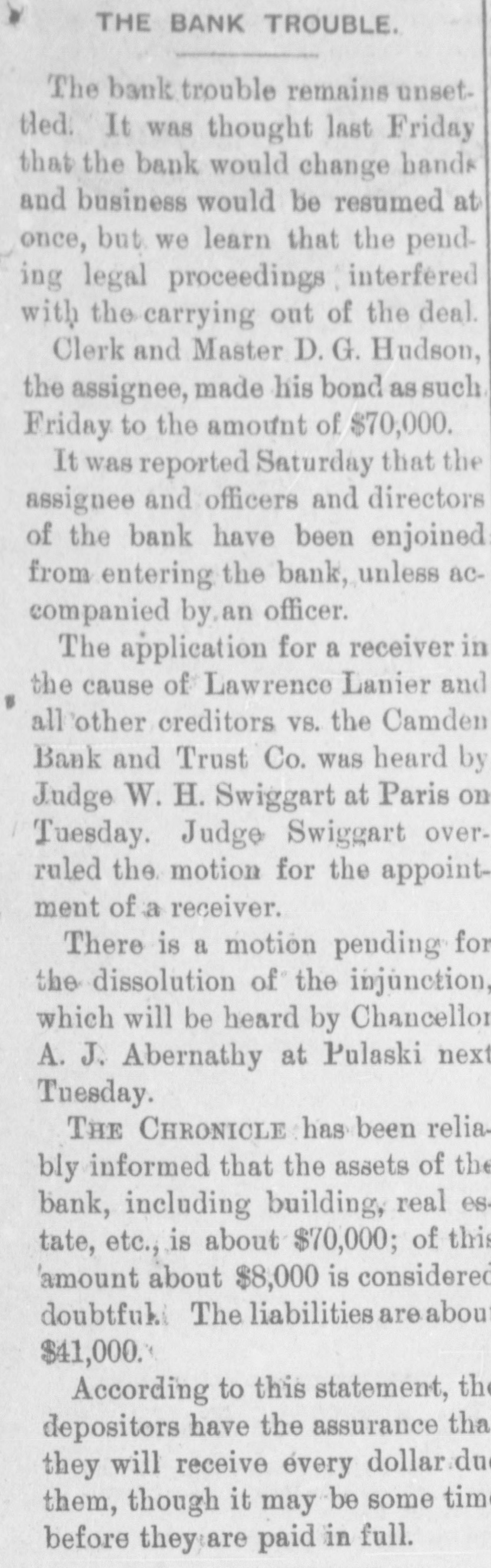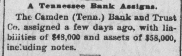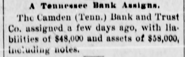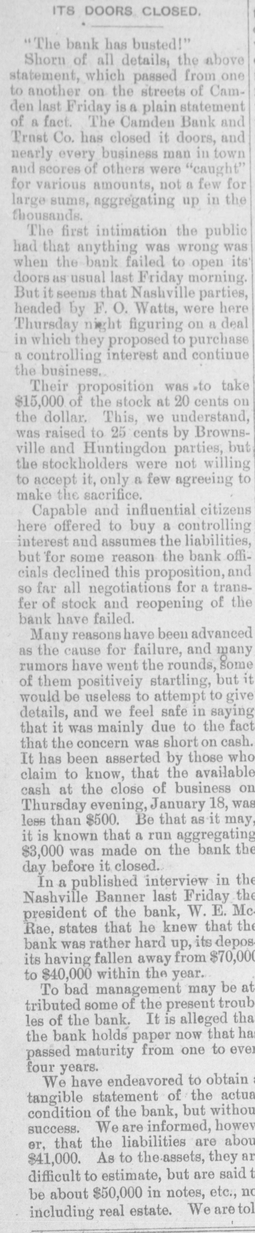 ITS DOORS CLOSED. 'The bank has busted!" Shorn of all details, the above statement, which passed from one to another on the streets of Camden last Friday is a plain statement of a fact. The Camden Bank and Trust Co. has closed it doors, and nearly every business man in town and scores of others were "caught" for various amounts, not a few for large sums, aggregating up in the thousands. The first intimation the public had that anything was wrong was when the bank failed to open its doors as usual last Friday morning. But it seems that Nashville parties, headed by F. O. Watts, were here Thursday night figuring on a deal in which they proposed to purchase a controlling interest and continue the business. Their proposition was .to take $15,000 of the stock at 20 cents on the dollar. This, we understand, was raised to 25 cents by Brownsville and Huntingdon parties, but the stockholders were not willing to accept it, only a few agreeing to make the sacrifice. Capable and influential citizens here offered to buy a controlling interest and assumes the liabilities, but for some reason the bank officials declined this proposition, and SO far all negotiations for a transfer of stock and reopening of the bank have failed. Many reasons have been advanced as the cause for failure, and many rumors have went the rounds, some of them positiveiy startling, but it would be useless to attempt to give details, and we feel safe in saying that it was mainly due to the fact that the concern was short on cash. It has been asserted by those who claim to know, that the available cash at the close of business on Thursday evening, January 18, was less than $500. Be that as it may it is known that a run aggregating $3,000 was made on the bank the day before it closed. In a published interview in the Nashville Banner last Friday the president of the bank, W. E. Mc Rae, states that he knew that the bank was rather hard up, its depos its having fallen away from $70,000 to $40,000 within the year. To bad management may be at tributed some of the present troub les of the bank. It is alleged tha the bank holds paper now that ha passed maturity from one to ever four years. We have endeavored to obtain tangible statement of the actua condition of the bank, but withou success. We are informed, howey or, that the liabilities are abou $41,000. As to the assets, they ar difficult to estimate, but are said be about $50,000 in notes, etc., no including real estate. We are tol