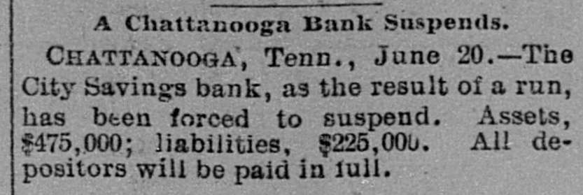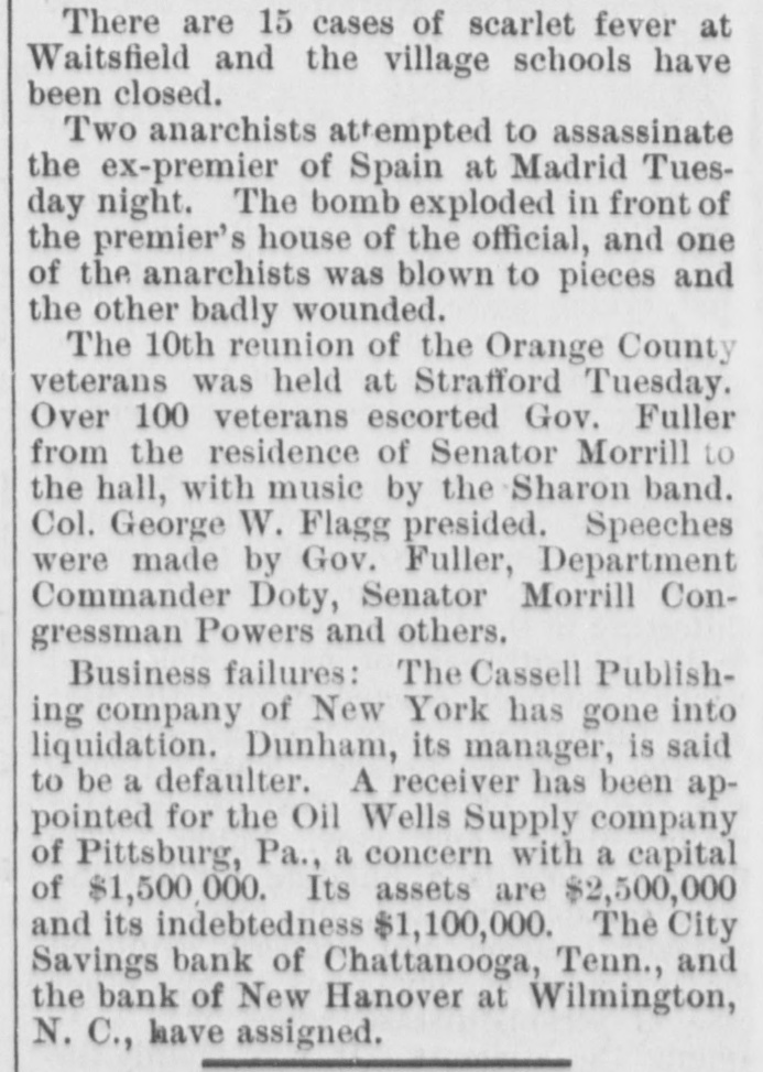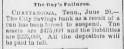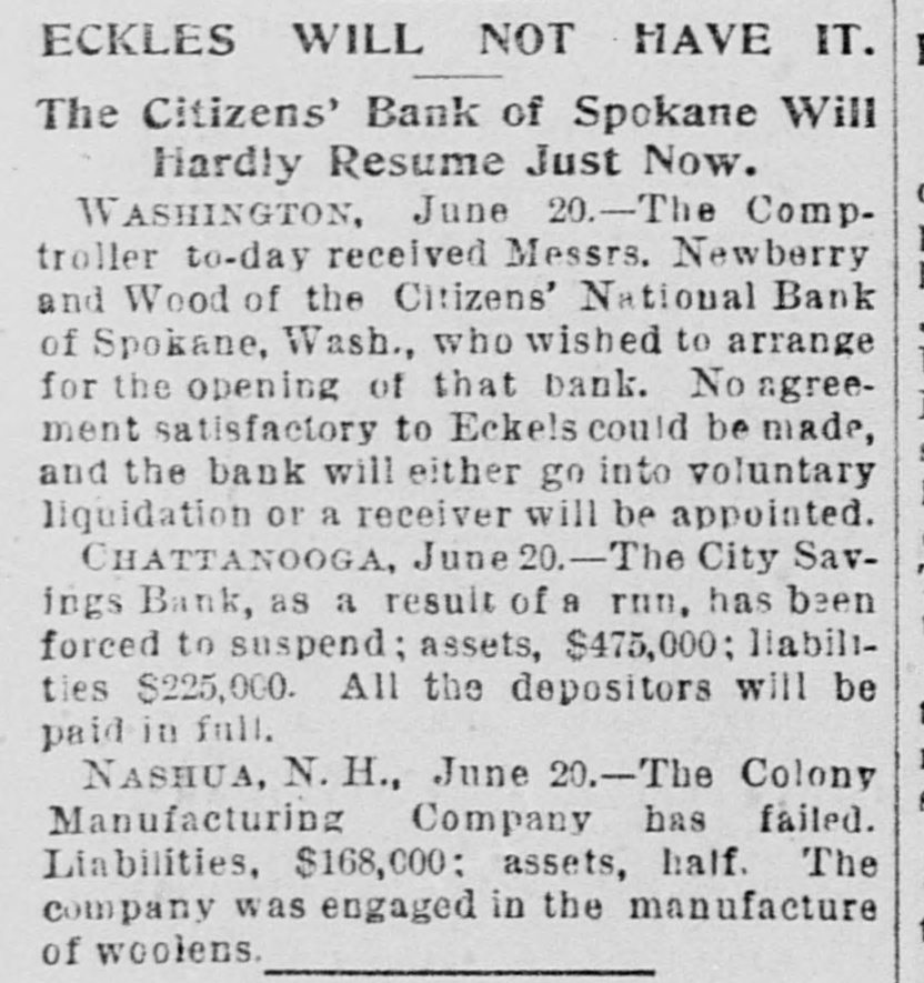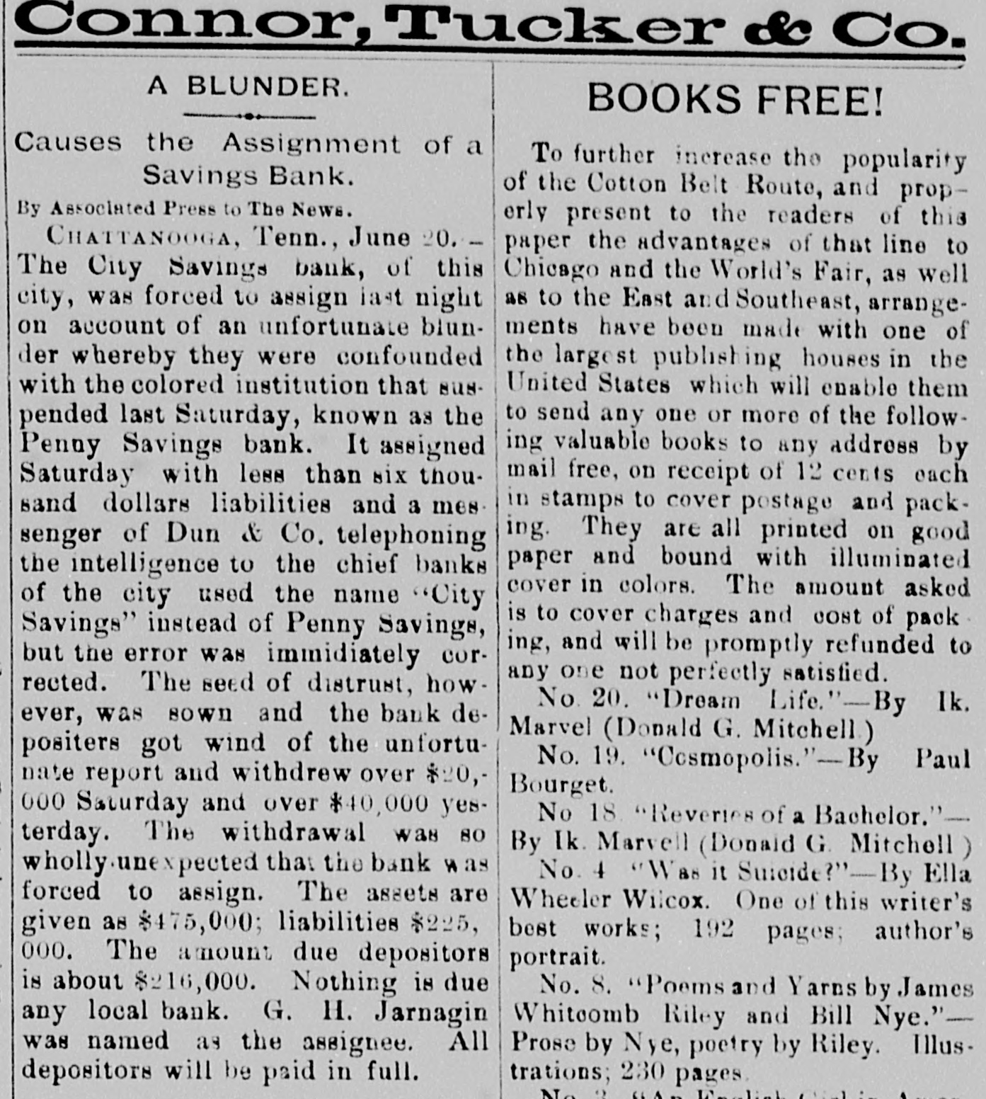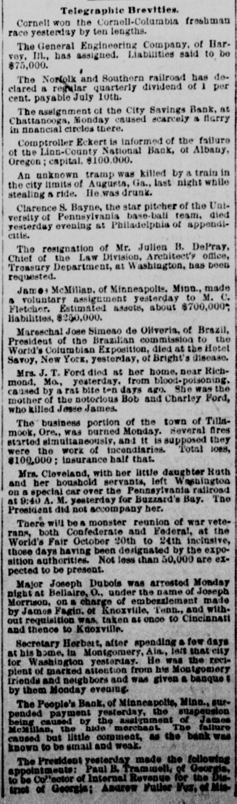 Telegraphic Brevities. Cornell won the Cornell-Columbia freshman race yesterday by ten lengths. The General Engineering Company, of Harvey, IiI., has assigned. Liabilities said to be $75,000. The Norfolk and Southern railroad has declared a regular quarterly dividend of 1 per cent. payable July 10th. The assignment of the City Savings Bank, at Chattanooga, Monday caused scarcely a nurry in nnancial circles there. Comptroller Eckert is informed of the failure of the Lion-County National Bank, of Albany, Oregon; capital, $100,000. An unknown tramp was killed by a train in the city limits of Augusta, Ga., last night while stealing & ride. He was drunk. Clarence S. Bayne, the star pitcher of the Untversity of Pennsylvania base-ball team. died yesterday evening at Philadelphia of appendicitis. The resignation of Mr. Julien B. DePray, Chief of the Law Division, Architect's office, Treasury Department, at Washington, has been requested. James McMilian. of Minneapolis. Minn., made a voluntary assignment yesterday to M. C. Fletcher. Estimated assets, about $700,000, liabilities, $250,000. Mareschal Jose Simeao de Oliveria, of Brazil, President of the Brazilian commission to the World's Columbian Exposition, died at the Hotel Savoy, New York, yesterday, of Bright's disease. Mrs. J. T. Ford died at her home. near Richmond. Mo., yesterday. from blood-poisoning, caused by a rat bite ten days ago. She was the mother of the notecious Bob and Charley Ford, who killed Jesse James. The business portion of the town of Tillamook, Ore., was burned Monday. Several fires started simultaneously, and It is supposed they were the work of incendiaries. Total loes, $100,000; insurance half that. Mrs. Cleveland, with her little daughter Ruth and her houshold servants, left Washington on a special car over the Pennsylvania railroad at 9:40 A. M. yesterday for Buzzard's Bay. The President did not accompany her. There will be a monster reunion of war veterans, both Confederate and Federal, at the World's Fair October 20th to 24th inclusive, those days having been designated by the exposition authorities. Not less than 50,000 are expected to be present. Major Joseph Dubois was arrested Monday night at Bellaire, O., under the name of Joseph Morrison. on a charge of embezzlement made by James Fagin. of Knoxviile, Tenn., and with. out requisition was taken as once to Cincinnati and thence to Knoxville. Secretary Herbert, after spending a few days at his home, in Montgomery, Ala., left that city for Washington yesterday. He was the reciplent of marked attention from his Montgomery friends and neighbors and was given a banque 8 by them Monday evening. The People's Bank, of Minneapolis, Mino., surpended payment yesterday, the suspension being caused by the assignment of James McMillan, the hide merchant The failure caused but little comment, as the bank was known to be small and weak. The President yesterday made the following appointments: Paul B. Trammell, of Georgia, to be Collector of Internal Revenue for the Diatrics of Georgia; Andrew Fuller Yus, of Mis-