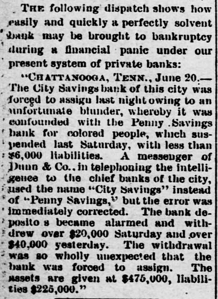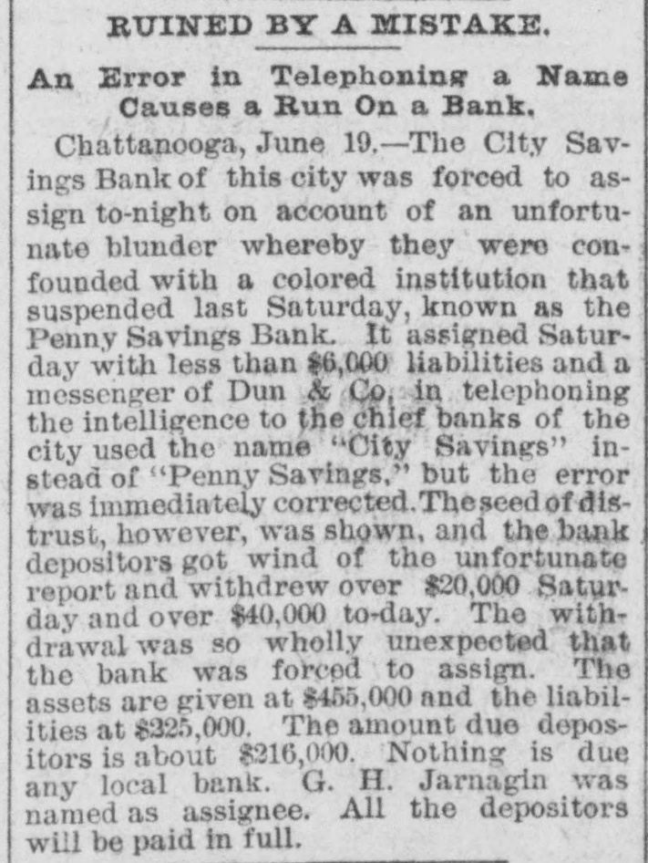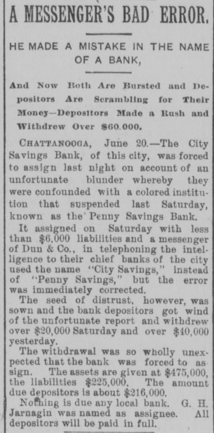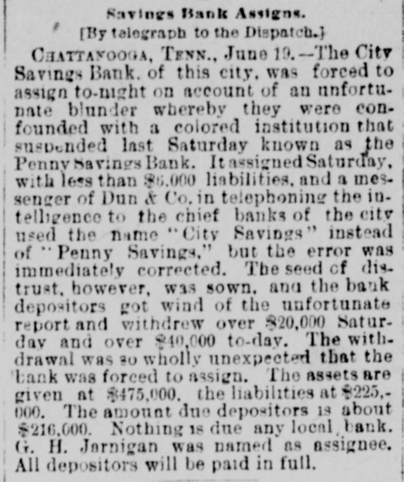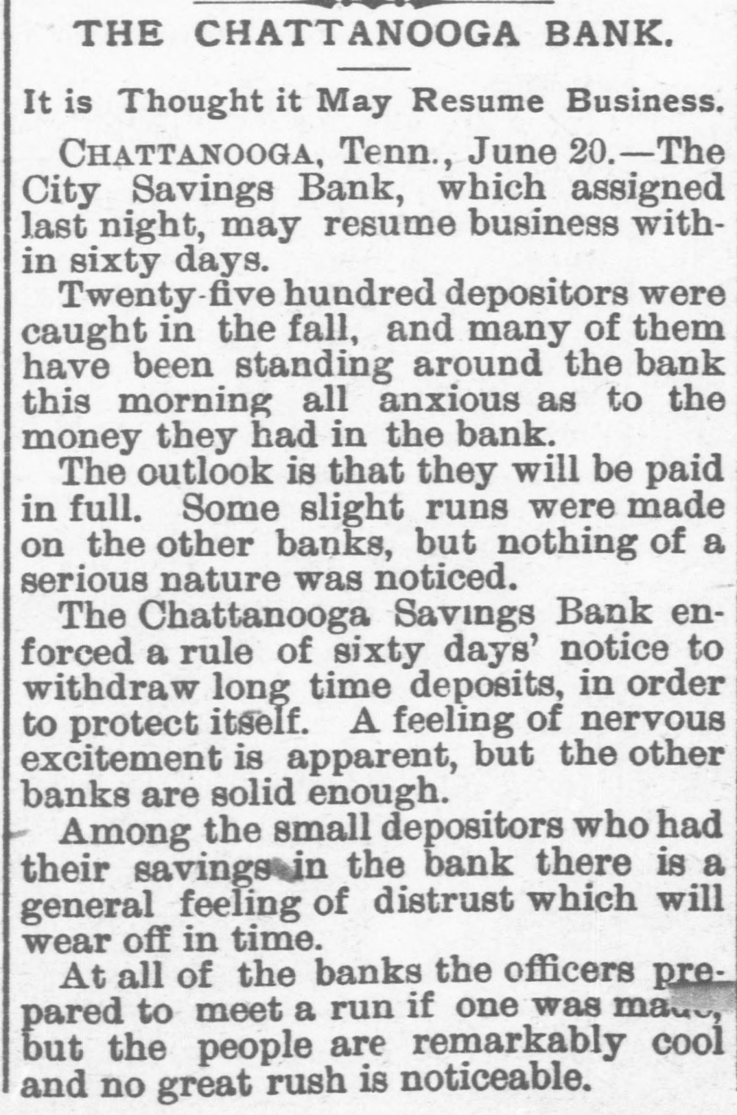 Telegraphic Brevities. Cornell won the Cornell-Columbia freshman race yesterday by ten lengths. The General Engineering Company, of Harvey, IiI., has assigned. Liabilities said to be $75,000. The Norfolk and Southern railroad has declared a regular quarterly dividend of 1 per cent. payable July 10th. The assignment of the City Savings Bank, at Chattanooga, Monday caused scarcely a nurry in nnancial circles there. Comptroller Eckert is informed of the failure of the Lion-County National Bank, of Albany, Oregon; capital, $100,000. An unknown tramp was killed by a train in the city limits of Augusta, Ga., last night while stealing & ride. He was drunk. Clarence S. Bayne, the star pitcher of the Untversity of Pennsylvania base-ball team. died yesterday evening at Philadelphia of appendicitis. The resignation of Mr. Julien B. DePray, Chief of the Law Division, Architect's office, Treasury Department, at Washington, has been requested. James McMilian. of Minneapolis. Minn., made a voluntary assignment yesterday to M. C. Fletcher. Estimated assets, about $700,000, liabilities, $250,000. Mareschal Jose Simeao de Oliveria, of Brazil, President of the Brazilian commission to the World's Columbian Exposition, died at the Hotel Savoy, New York, yesterday, of Bright's disease. Mrs. J. T. Ford died at her home. near Richmond. Mo., yesterday. from blood-poisoning, caused by a rat bite ten days ago. She was the mother of the notecious Bob and Charley Ford, who killed Jesse James. The business portion of the town of Tillamook, Ore., was burned Monday. Several fires started simultaneously, and It is supposed they were the work of incendiaries. Total loes, $100,000; insurance half that. Mrs. Cleveland, with her little daughter Ruth and her houshold servants, left Washington on a special car over the Pennsylvania railroad at 9:40 A. M. yesterday for Buzzard's Bay. The President did not accompany her. There will be a monster reunion of war veterans, both Confederate and Federal, at the World's Fair October 20th to 24th inclusive, those days having been designated by the exposition authorities. Not less than 50,000 are expected to be present. Major Joseph Dubois was arrested Monday night at Bellaire, O., under the name of Joseph Morrison. on a charge of embezzlement made by James Fagin. of Knoxviile, Tenn., and with. out requisition was taken as once to Cincinnati and thence to Knoxville. Secretary Herbert, after spending a few days at his home, in Montgomery, Ala., left that city for Washington yesterday. He was the reciplent of marked attention from his Montgomery friends and neighbors and was given a banque 8 by them Monday evening. The People's Bank, of Minneapolis, Mino., surpended payment yesterday, the suspension being caused by the assignment of James McMillan, the hide merchant The failure caused but little comment, as the bank was known to be small and weak. The President yesterday made the following appointments: Paul B. Trammell, of Georgia, to be Collector of Internal Revenue for the Diatrics of Georgia; Andrew Fuller Yus, of Mis-