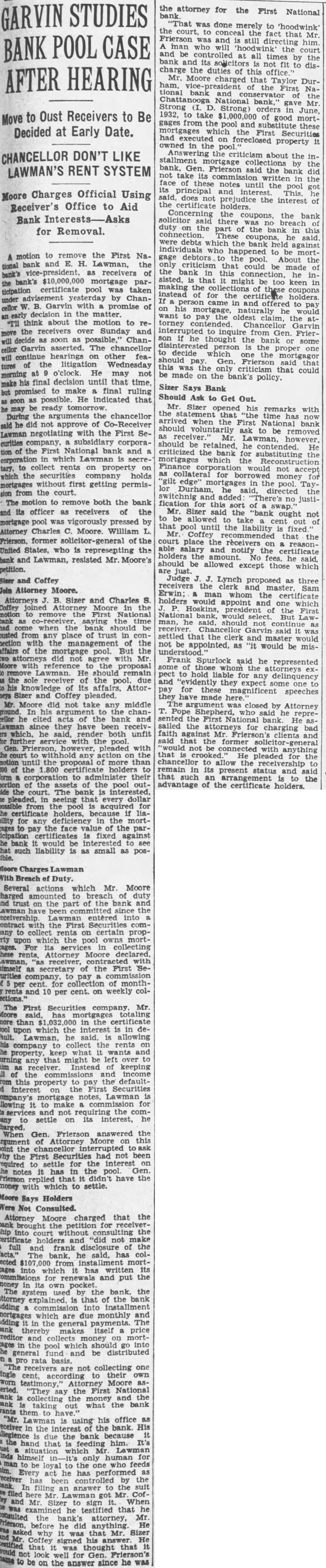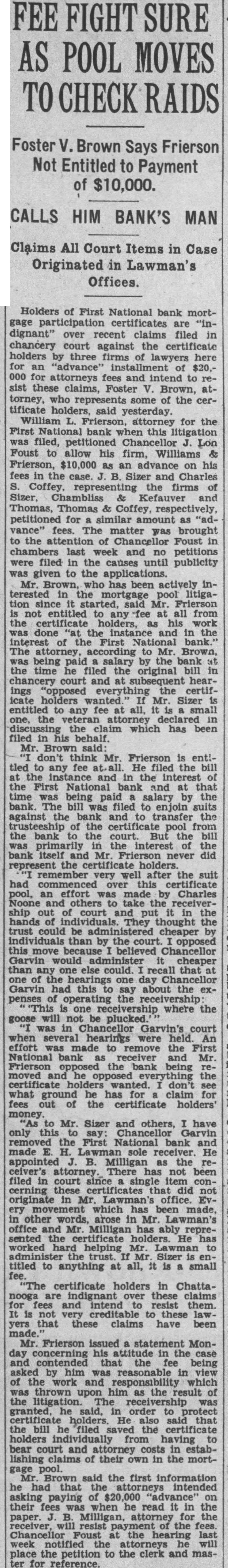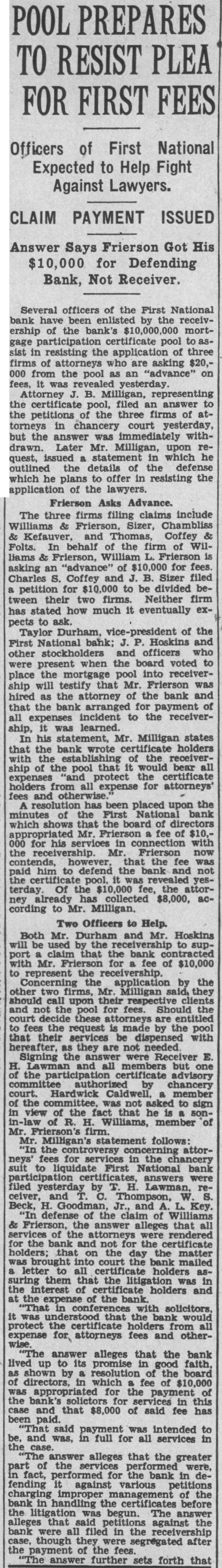Frierson Asks Advance. The three firms filing claims include Sizer, Chambliss Kefauver, Thomas, Coffey & Folts. In behalf of the firm of Williams & Frierson, William Frierson is asking an "advance" of for fees. Charles S. Coffey and J. B. Sizer filed petition for $10,000 to be divided between their two firms. Neither firm has stated how much it eventually expects to Taylor Durham, vice-president of the First National bank; Hoskins and other stockholders and officers who were present when the board voted to place the mortgage pool into receivership will testify that Mr. Frierson was hired the attorney of the bank and that the bank arranged for payment of all expenses incident to the receivership, learned. In his statement, Mr. Milligan states that the bank wrote certificate holders establishing of the receivership the pool that bear all expenses protect the certificate holders all expense for attorneys' and resolution has been placed upon the minutes First National bank which shows that board of directors Mr. fee of $10,for his in connection with the Frierson however, that the fee was paid him defend the bank and not pool, was revealed yesterday. Of the $10,000 fee, the attorney collected $8,000, according to Mr. Milligan.