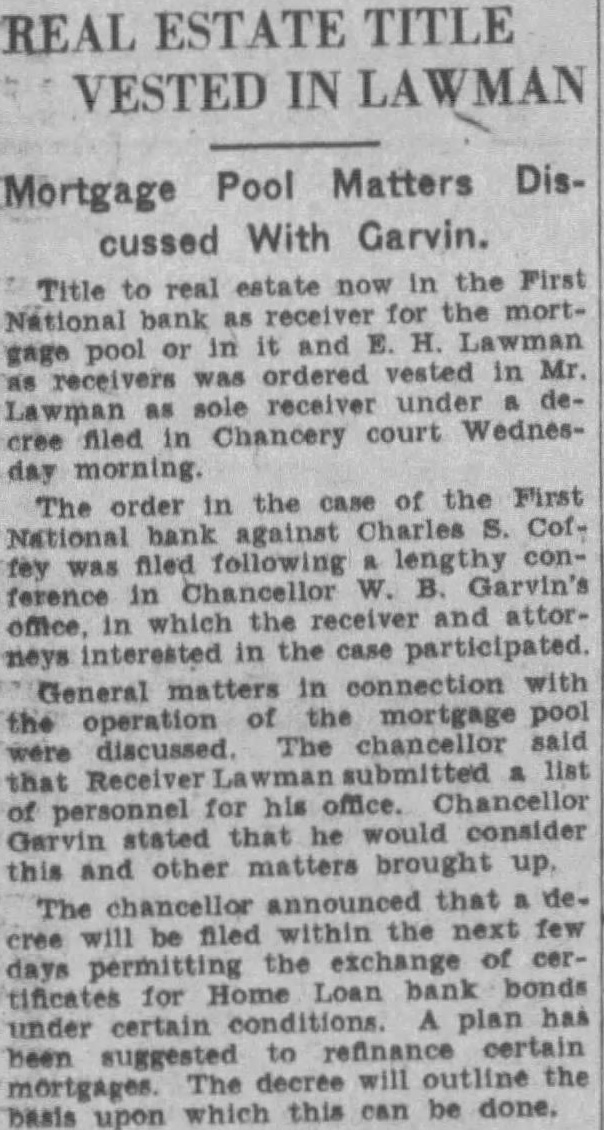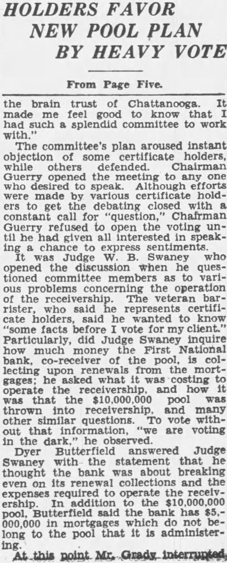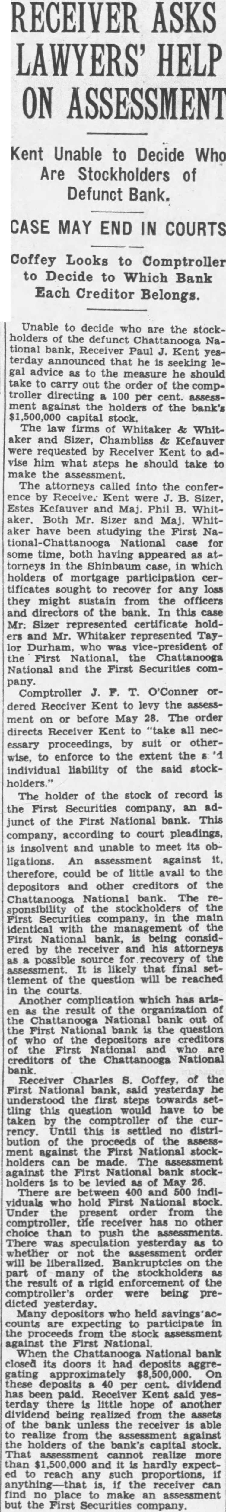 Frierson Asks Advance. The three firms filing claims include Sizer, Chambliss Kefauver, Thomas, Coffey & Folts. In behalf of the firm of Williams & Frierson, William Frierson is asking an "advance" of for fees. Charles S. Coffey and J. B. Sizer filed petition for $10,000 to be divided between their two firms. Neither firm has stated how much it eventually expects to Taylor Durham, vice-president of the First National bank; Hoskins and other stockholders and officers who were present when the board voted to place the mortgage pool into receivership will testify that Mr. Frierson was hired the attorney of the bank and that the bank arranged for payment of all expenses incident to the receivership, learned. In his statement, Mr. Milligan states that the bank wrote certificate holders establishing of the receivership the pool that bear all expenses protect the certificate holders all expense for attorneys' and resolution has been placed upon the minutes First National bank which shows that board of directors Mr. fee of $10,for his in connection with the Frierson however, that the fee was paid him defend the bank and not pool, was revealed yesterday. Of the $10,000 fee, the attorney collected $8,000, according to Mr. Milligan.