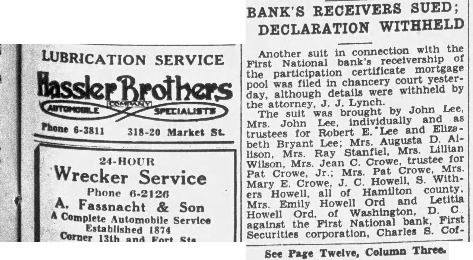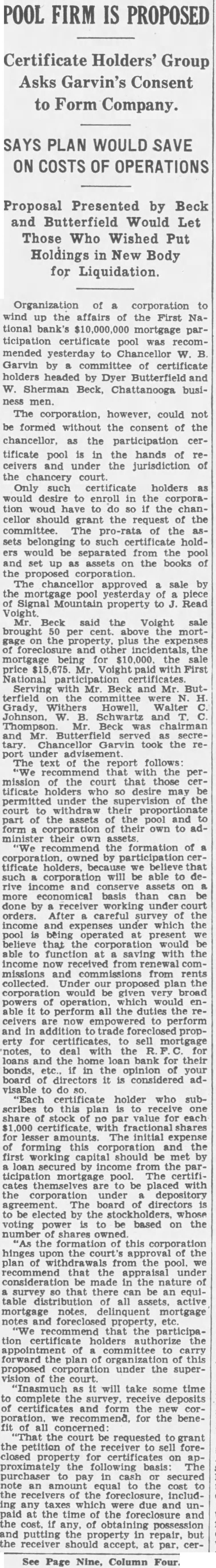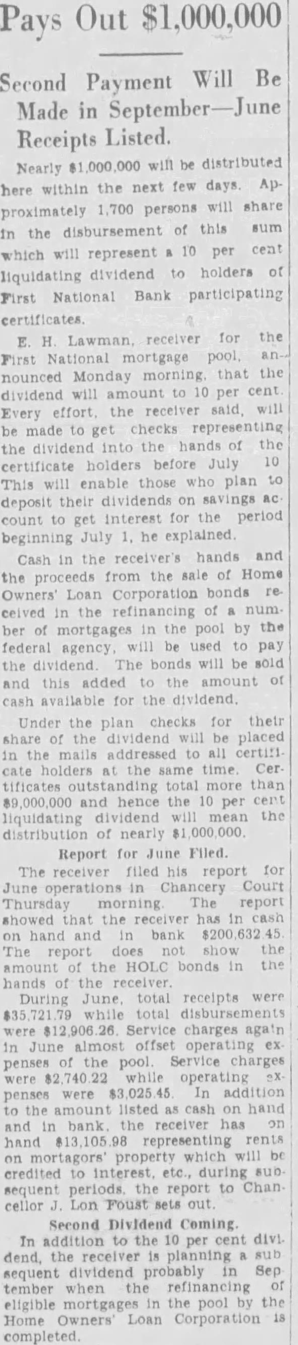 Two Officers to Help. Both Mr. Durham and Mr. Hoskins be by the to supthe bank Mr. Frierson of $10,000 to represent the Concerning the application by the other two Mr Milligan they should call upon their clients and not the pool for fees. Should the these attorneys are entitled to the request made by the that their services be with hereafter, they are not needed Signing the were Receiver E. Lawman and all members but one the participation certificate advisory committee authorized by chancery court. the to sign view of the that sonR. H. Williams, of Mr. firm. Mr. Milligan's statement follows: the controversy attorneys' for in the suit to First National bank answers were filed yesterday H. Lawman, receiver, and Thompson, Beck, H. Goodman, Jr., and Key. defense of the claim of Williams & Frierson, the answer alleges that all the were rendered for the bank and not for the certificate holders; the matter was brought into court the bank mailed letter to all certificate holders assuring them that the litigation was in the certificate holders of the bank. it was that the would protect the certificate from all expense for attorneys fees and otherwise. answer alleges that the bank lived up to its promise in faith, shown by resolution the board in which fee of $10,000 appropriated for the payment of the for this and that $8,000 of said fee has paid. "That said payment intended to and was, in full for all services the "The answer alleges that the greater of services were, fact, performed for the bank in defending against various petitions charging of the bank handling the certificates before the was begun. The answer alleges that said against the bank were all filed in the receivership though they were segregated after the payment the fees. "The answer further sets forth that