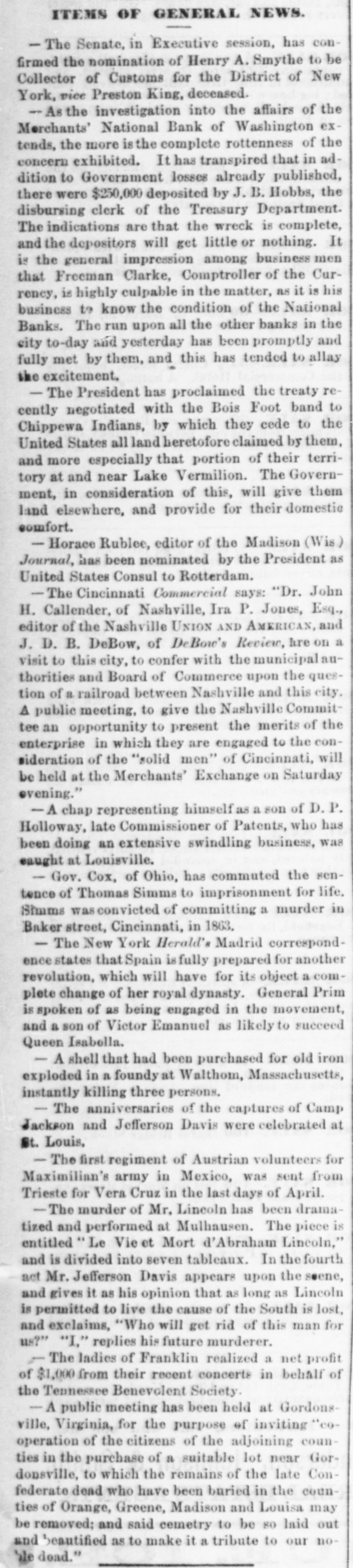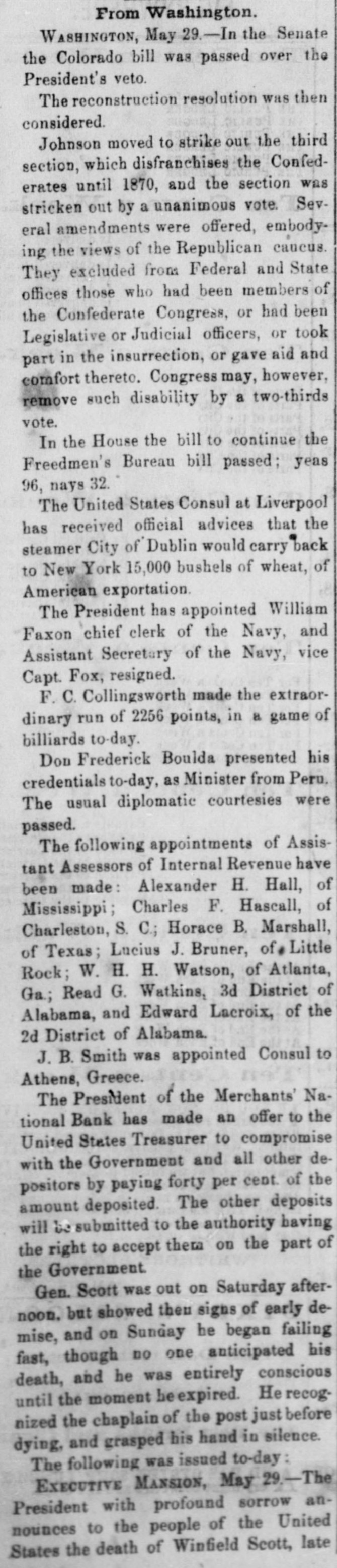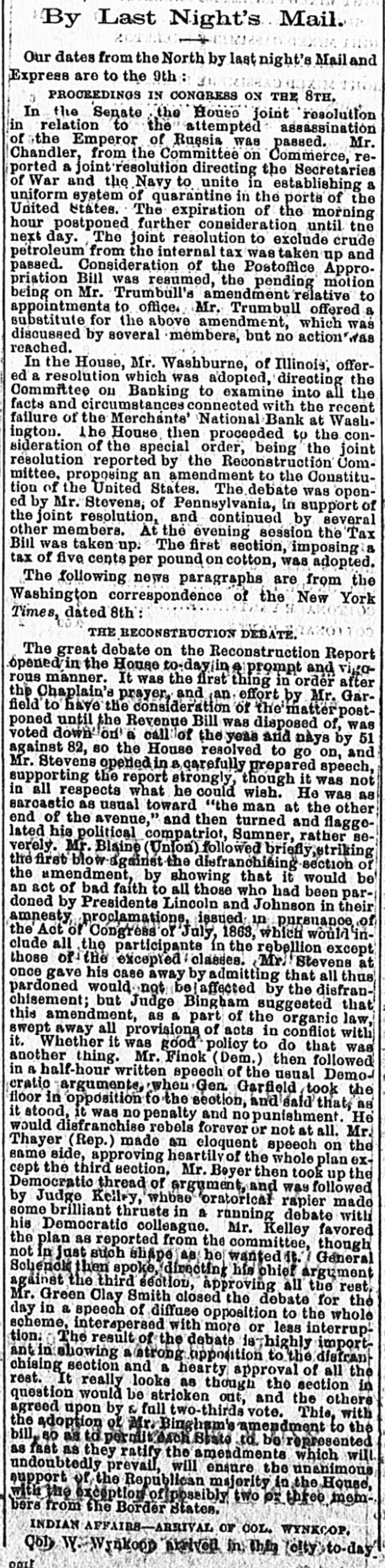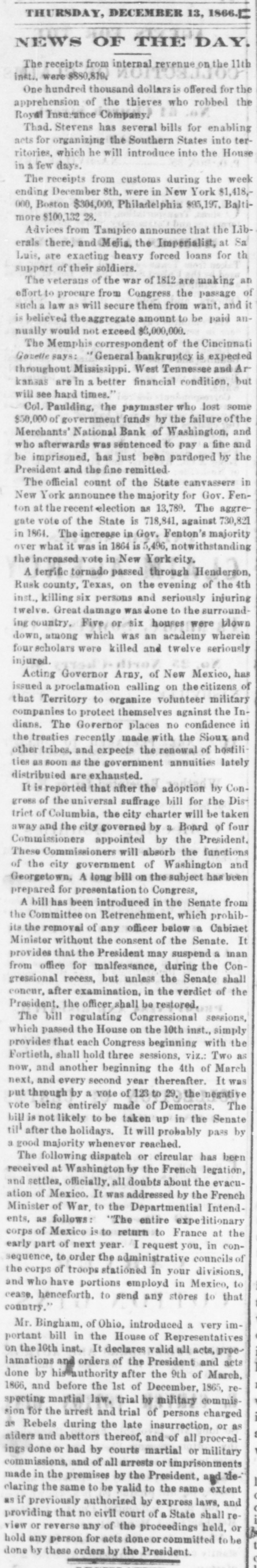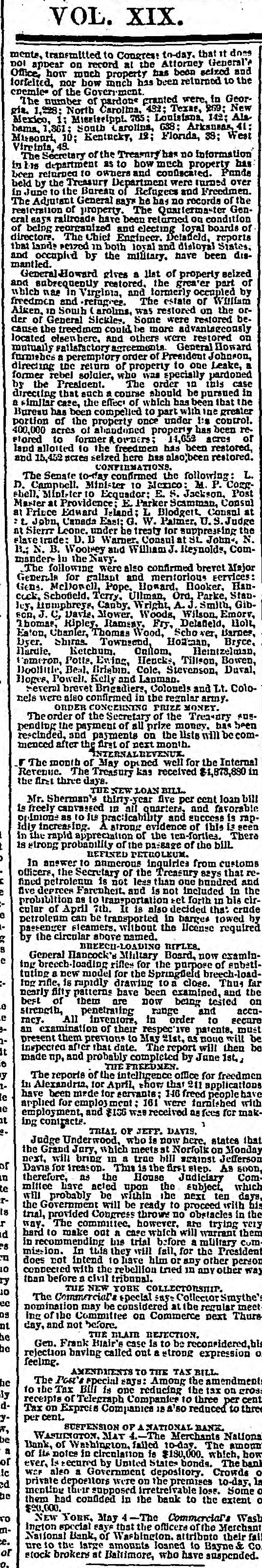 VOL. XIX. mente, transmitted to Congress to-day. that it does not appear on record at the Attorney General's Office how much property has been seized and forfeited nor bow much has been returned 10 the enemie* of the Government The number of pardons cranted were in Geor gia. 1.228: North Carolina. 432: Texas. 269: New Mexico. 1; Mississippi. 765: Louisiana 142: Ala bama, 1,361 South Carolina, 638: Arkansas. 41 Missouri, 10 Kentucky, 18; Florida, 38: West 49 Vircinia, The Sécretary of the Treasury has no information in his department as to bow much property has been returned to owners and conúscated. Pande held by the Treasury Department were turned over in June to the Barean of Refugees and Freedmen. The Adjutant General says he has no records of the resteration of property. The Quarterma-ter Gencral ease raitroads have been returned on condition of being reorganized and electing loyal boards of directors. The Chief Engineer. Delafield, reports that lands reized in both loyal and disloval States. and occupied by the military. have been dismantled. General Howard gives a list of property seized and subrequently restored, the greater part of which nas in Virginia, and formerly occupied by freedmen and refugres The estate of William Aiken. ID South arolins. was restored on the or der of General Sickles. Some were restored be. cause the treedmen could be more dvantageously located elsewhere, and others were restored on mutually Fatisfactory agreements General Howard furnishes a peremptory order of President Johnson, directing the return of property to one Leake, a former rebel soldier, who was specially pardoned by the Presigent. The order in this case directing that such a course should be pursued in a similar case, the effect of which has been that the Bureau has been compelled to part with the greater portion of the property once under Its control. 400,000 acres of abandoned property has been reof stored to former Morners: 14,053 acres land alloited to the freedmen has been restored. and 15, 432 acrea seized here has also,been restored. CONFURMATIONS The Senate 0-day confirmed the following L D. Campbell. Minister to Mexico M P. Corr Post shell, Minister to Ecquador Jackson. Master at Providence: E Parker Scamman. Consul at Prince Edward Island L Blodgett. Consol at John, Canada East G. W. Palmer. U.S. Judge Sierrr Leone, under treaty for suppressing the Flave trade: D. B Warner. Consul St John- N B.N.N. B. Wooleey and William Reynolds, Com mander lu the Navy. The following were also confirmed breret Major Generals for callapt and mentorious services Gens Mellowell, Pope, Howard, Booker. Han cock. Schofield. Terry. Ullman, Ord, Parke. Stan Jey, Ltumpbreys, Camby Wright, A. Smith. GibECN,J.C, Davis, Mower, Woods, Wilson Emory, Thomas, Ripley, Ramsay Fry. Delaneld, Holt, Eaton, Chanler, Thomas Wood, Schover, Barner Dyer. Shiras. Townsend, Ho2man. Bryce, Mardle, Ketchum, Callom Heintzelman, Comeron. Potts. Ering, Hencks Tilison, Bowen, Doolittle Beal, Briebin, Colc. Stevenson, Duval, lloges, Powell, Kelly and Lanman. Feveral brevet Brigadiers, Colonels and Lt. Colonels were also confirmed in the regular army ORDER CONCEUNING PRIZE MONEY The order of the Secretary of the Treasury aus. pending the payment of all prize money. has been rescinded. and payments on the lists will becommenced after the first of next month. INTERSALREVENUE The month of May opened well for the Internal Revenue. The Treasury kas received $1,873,880 the first three days. THE NEW LOAN BILL Mr. Sherman's thirty year five per cent loan bill is freely canvaseed in all quarters, and favorable practicability and enccess is rap Idly increasing strong evidence of this seen in the rapid appreciation of the ten-forties. There is etrong probability of the pa-sage of the bill. REFINED PETROLEUM. In answer to numerous inquiries from customs officers, the Secretary of the Treasury azys that fined petroleum is not less than one hundred and five deprees Farenheit, and is not included in the probabition as to transportation ret forth in his circular of April 7th. Ii is also decided that crade petroleum can be transported in barges towed by passenger steamers, without the License required by the circular above named. BREECU-LOADING RIFLES General Hancock Military Board. now examining breech-loading rifles for the purpose of enbet tuting a new model for the Springfield breech-load Ing rifle, is rapidly drawing to a close. Thu, far nearly fifty patterns have been examined. and the best of them are now being tested on e strength. penetrating range and accn. e racy. All inventore. in order to secure an examination of their respect 'ive patents, must present them previous to May 21st. as noue will be inspected after that date. The report will then be it made up, and probably completed by June 1st, 6 FREEDMEN THE The reports of the intelligence office for freedmen y 1. in Alexandria, for April, show that 2u applications have been mede for servants: freed people have le applied for employment 161 were fornished with e employment, and $136 was received as fees for mak it ing contracts TRIAL OF JEFF. DAVIS. Judge Underwood. who is now here. states that the Grand Jary, which meets at Norfolk on Monday next, will bring in a true bill against Jefferson of Davis for treason. This is the first eten. As soon, in therefore, as the House Judiciary Committee have acted upon the subject which te will probably be within the next ten days, the Government will be ready to proceed with his is trial, provided Congress throws no obstacles in the way. The committee, however. are trying very hard to make out a case which will warrant them d in recommending bus trial before a multary com e mission. In this they will fall, for the President 'a does not intend to have him any other person 10 connected with the rebellion tried in any other way tban before n civil tribunal. ry THE NEW YORK COLLECTORSTITP 10 The Commercial's special save Collector Smythe cc nomination