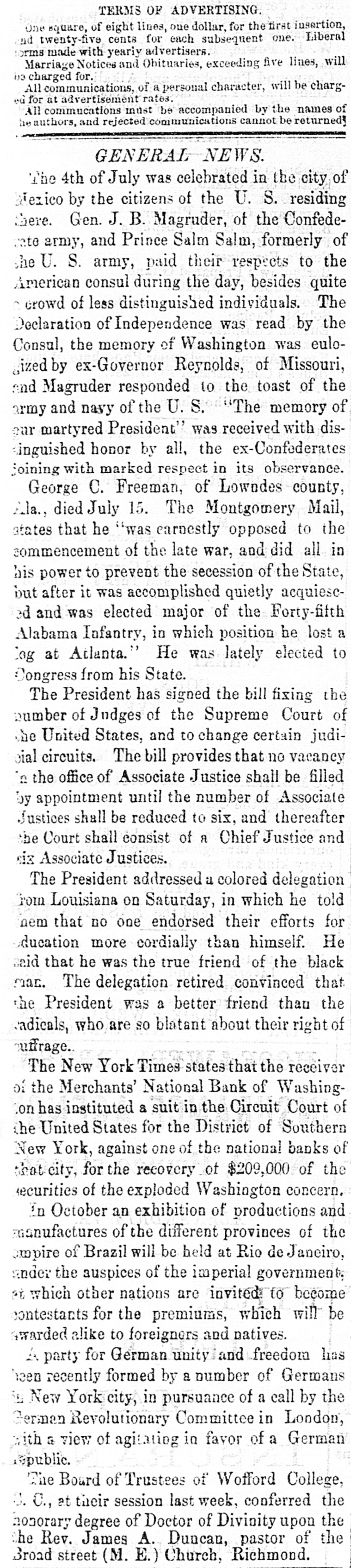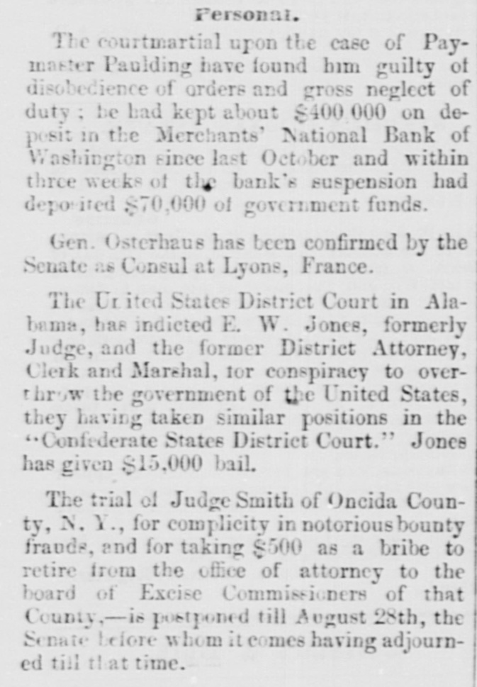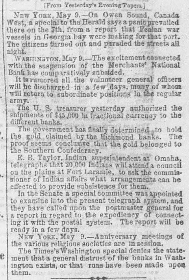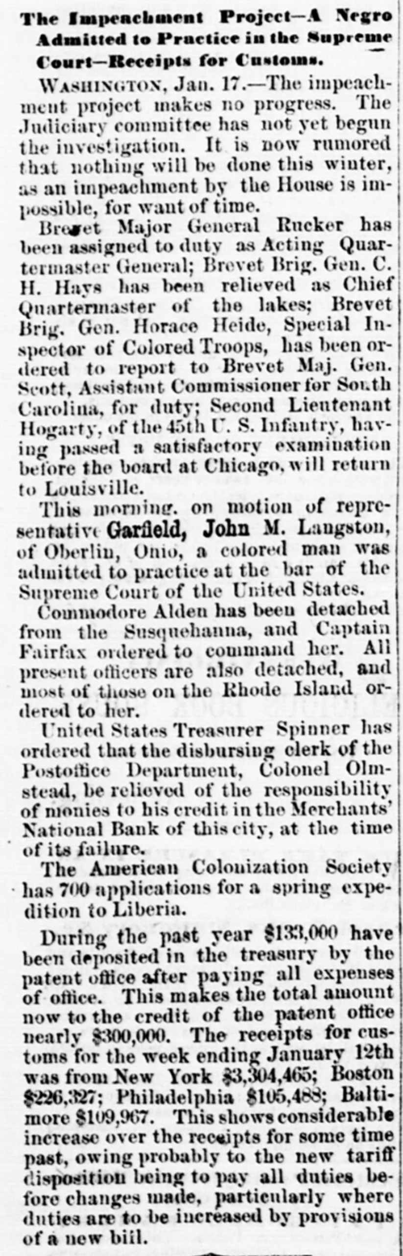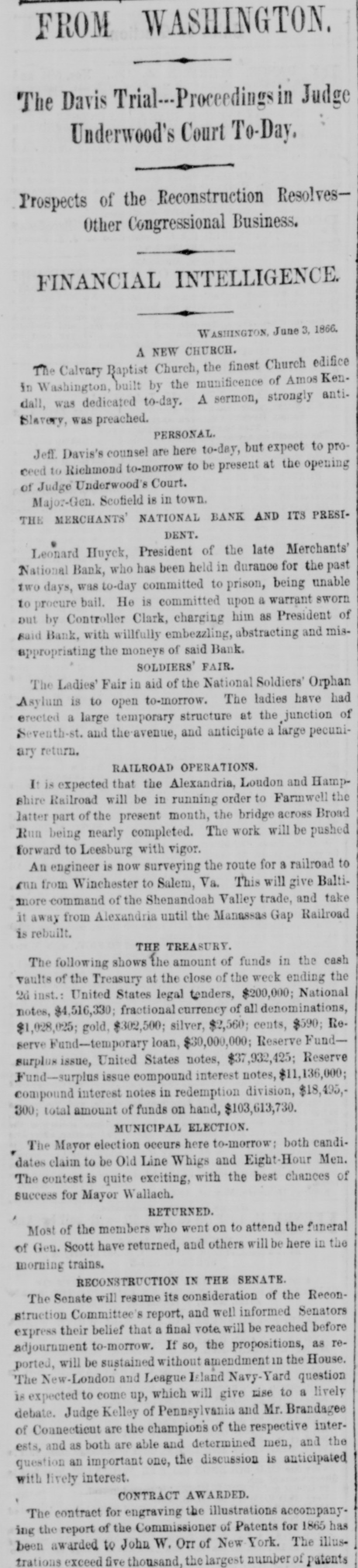 VOL. XIX. mente, transmitted to Congress to-day. that it does not appear on record at the Attorney General's Office how much property has been seized and forfeited nor bow much has been returned 10 the enemie* of the Government The number of pardons cranted were in Geor gia. 1.228: North Carolina. 432: Texas. 269: New Mexico. 1; Mississippi. 765: Louisiana 142: Ala bama, 1,361 South Carolina, 638: Arkansas. 41 Missouri, 10 Kentucky, 18; Florida, 38: West 49 Vircinia, The Sécretary of the Treasury has no information in his department as to bow much property has been returned to owners and conúscated. Pande held by the Treasury Department were turned over in June to the Barean of Refugees and Freedmen. The Adjutant General says he has no records of the resteration of property. The Quarterma-ter Gencral ease raitroads have been returned on condition of being reorganized and electing loyal boards of directors. The Chief Engineer. Delafield, reports that lands reized in both loyal and disloval States. and occupied by the military. have been dismantled. General Howard gives a list of property seized and subrequently restored, the greater part of which nas in Virginia, and formerly occupied by freedmen and refugres The estate of William Aiken. ID South arolins. was restored on the or der of General Sickles. Some were restored be. cause the treedmen could be more dvantageously located elsewhere, and others were restored on mutually Fatisfactory agreements General Howard furnishes a peremptory order of President Johnson, directing the return of property to one Leake, a former rebel soldier, who was specially pardoned by the Presigent. The order in this case directing that such a course should be pursued in a similar case, the effect of which has been that the Bureau has been compelled to part with the greater portion of the property once under Its control. 400,000 acres of abandoned property has been reof stored to former Morners: 14,053 acres land alloited to the freedmen has been restored. and 15, 432 acrea seized here has also,been restored. CONFURMATIONS The Senate 0-day confirmed the following L D. Campbell. Minister to Mexico M P. Corr Post shell, Minister to Ecquador Jackson. Master at Providence: E Parker Scamman. Consul at Prince Edward Island L Blodgett. Consol at John, Canada East G. W. Palmer. U.S. Judge Sierrr Leone, under treaty for suppressing the Flave trade: D. B Warner. Consul St John- N B.N.N. B. Wooleey and William Reynolds, Com mander lu the Navy. The following were also confirmed breret Major Generals for callapt and mentorious services Gens Mellowell, Pope, Howard, Booker. Han cock. Schofield. Terry. Ullman, Ord, Parke. Stan Jey, Ltumpbreys, Camby Wright, A. Smith. GibECN,J.C, Davis, Mower, Woods, Wilson Emory, Thomas, Ripley, Ramsay Fry. Delaneld, Holt, Eaton, Chanler, Thomas Wood, Schover, Barner Dyer. Shiras. Townsend, Ho2man. Bryce, Mardle, Ketchum, Callom Heintzelman, Comeron. Potts. Ering, Hencks Tilison, Bowen, Doolittle Beal, Briebin, Colc. Stevenson, Duval, lloges, Powell, Kelly and Lanman. Feveral brevet Brigadiers, Colonels and Lt. Colonels were also confirmed in the regular army ORDER CONCEUNING PRIZE MONEY The order of the Secretary of the Treasury aus. pending the payment of all prize money. has been rescinded. and payments on the lists will becommenced after the first of next month. INTERSALREVENUE The month of May opened well for the Internal Revenue. The Treasury kas received $1,873,880 the first three days. THE NEW LOAN BILL Mr. Sherman's thirty year five per cent loan bill is freely canvaseed in all quarters, and favorable practicability and enccess is rap Idly increasing strong evidence of this seen in the rapid appreciation of the ten-forties. There is etrong probability of the pa-sage of the bill. REFINED PETROLEUM. In answer to numerous inquiries from customs officers, the Secretary of the Treasury azys that fined petroleum is not less than one hundred and five deprees Farenheit, and is not included in the probabition as to transportation ret forth in his circular of April 7th. Ii is also decided that crade petroleum can be transported in barges towed by passenger steamers, without the License required by the circular above named. BREECU-LOADING RIFLES General Hancock Military Board. now examining breech-loading rifles for the purpose of enbet tuting a new model for the Springfield breech-load Ing rifle, is rapidly drawing to a close. Thu, far nearly fifty patterns have been examined. and the best of them are now being tested on e strength. penetrating range and accn. e racy. All inventore. in order to secure an examination of their respect 'ive patents, must present them previous to May 21st. as noue will be inspected after that date. The report will then be it made up, and probably completed by June 1st, 6 FREEDMEN THE The reports of the intelligence office for freedmen y 1. in Alexandria, for April, show that 2u applications have been mede for servants: freed people have le applied for employment 161 were fornished with e employment, and $136 was received as fees for mak it ing contracts TRIAL OF JEFF. DAVIS. Judge Underwood. who is now here. states that the Grand Jary, which meets at Norfolk on Monday next, will bring in a true bill against Jefferson of Davis for treason. This is the first eten. As soon, in therefore, as the House Judiciary Committee have acted upon the subject which te will probably be within the next ten days, the Government will be ready to proceed with his is trial, provided Congress throws no obstacles in the way. The committee, however. are trying very hard to make out a case which will warrant them d in recommending bus trial before a multary com e mission. In this they will fall, for the President 'a does not intend to have him any other person 10 connected with the rebellion tried in any other way tban before n civil tribunal. ry THE NEW YORK COLLECTORSTITP 10 The Commercial's special save Collector Smythe cc nomination