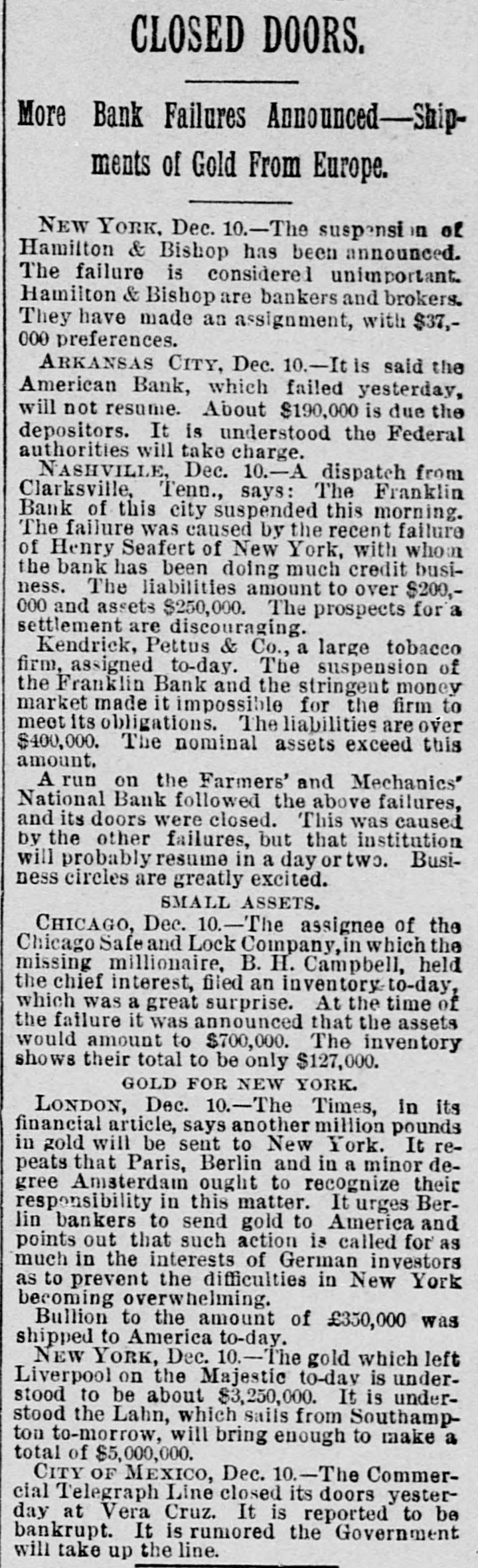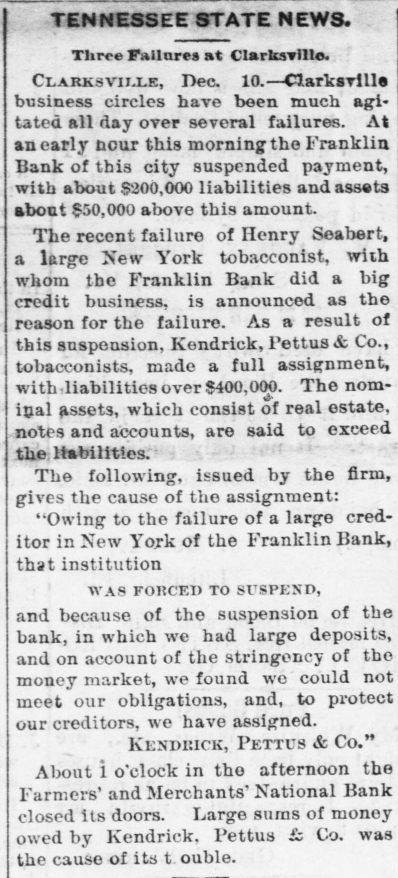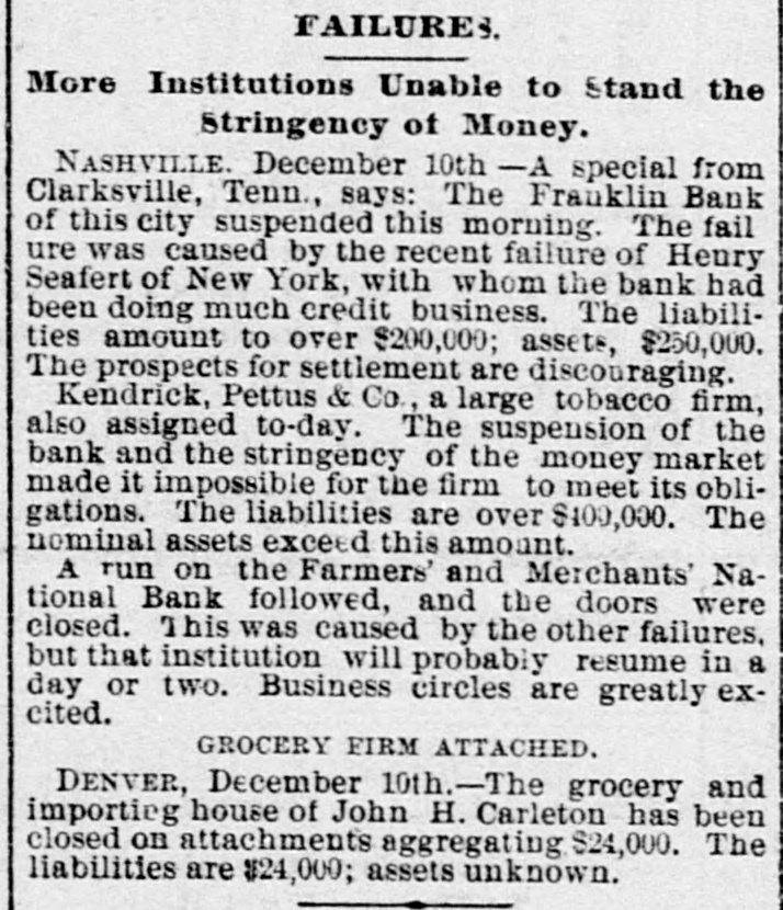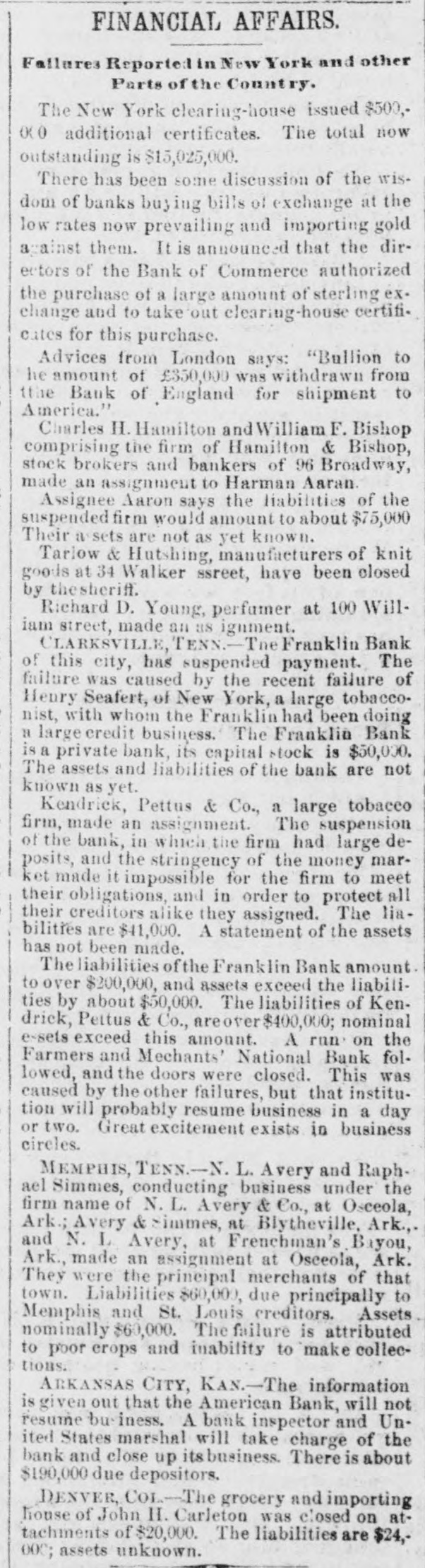 FINANCIAL AFFAIRS. Failures Reported in New York and other Parts of the Country. The New York clearing-house issued $500,000 additional certificates. The total now outstanding is $15,025,000. There has been some discussion of the wisdom of banks buying bills of exchange at the low rates now prevailing and importing gold against them. It is announced that the directors of the Bank of Commerce authorized the purchase of a large amount of sterling ex. change and to take out clearing-house certificates for this purchase. Advices from London says: "Bullion to he amount of £350,000 was withdrawn from the Bank of England for shipment to America." Charles H. Hamilton and William F. Bishop comprising the firm of Hamilton & Bishop, stock brokers and bankers of 96 Broadway, made an assignment to Harman Aaran. Assignee Aaron says the liabilities of the suspended firm would amount to about $75,000 Their assets are not as yet known. Tarlow & Hutshing, manufacturers of knit goods at 34 Walker ssreet, have been closed by thesheriff. Richard D. Young, perfumer at 100 William street, made an as ignment. CLARKSVILLE, TENN.-Tne Franklin Bank of this city, has suspended payment. The failure was caused by the recent failure of Henry Seafert, of New York, a large tobacconist, with whom the Franklin had been doing H large credit business. The Franklin Bank is a private bank, its capital stock is $50,000. The assets and liabilities of the bank are not known as yet. Kendrick, Pettus & Co., a large tobacco firm, made an assignment. The suspension of the bank, in which the firm had large deposits, and the stringency of the money market made it impossible for the firm to meet their obligations, and in order to protect all their creditors alike they assigned. The liabilities are $41,000. A statement of the assets has not been made. The liabilities of the Franklin Bank amount to over $200,000, and assets exceed the liabilities by about $50,000. The liabilities of Kendrick, Pettus & Co., areover $400,000; nominal e-sets exceed this amount. A run' on the Farmers and Mechants' National Bank followed, and the doors were closed. This was caused by the other failures, but that institution will probably resume business in a day or two. Great excitement exists in business circles. MEMPHIS, TENN.-N. L. Avery and Raphael Simmes, conducting business under the firm name of N. L. Avery & Co., at Osceola, Ark.; Avery & Simmes, at Blytheville, Ark.,. and N. L Avery, at Frenchman's Bayou, Ark., made an assignment at Osceola, Ark. They were the principal merchants of that town. Liabilities $60,000, due principally to Memphis and St. Louis creditors. Assets nominally $60,000. The failure is attributed to poor crops and inability to make collections. ARKANSAS CITY, KAN.-The information is given out that the American Bank, will not resume bu iness. A bank inspector and United States marshal will take charge of the bank and close up itsbusiness. There is about $190,000 due depositors. DENVER, CoL-The grocery and importing house of John H. Carleton was closed on attachments of $20,000. The liabilities are $24,000; assets unknown.
