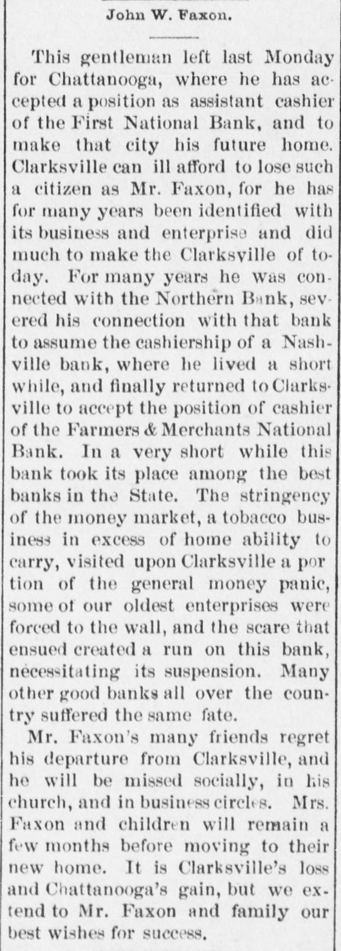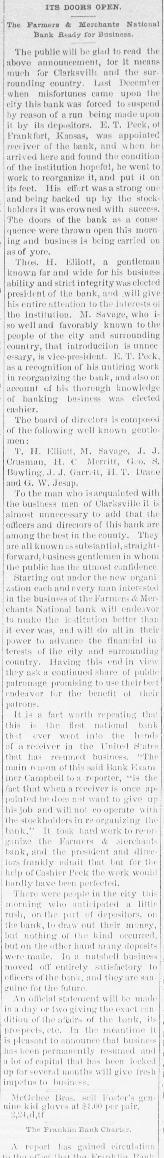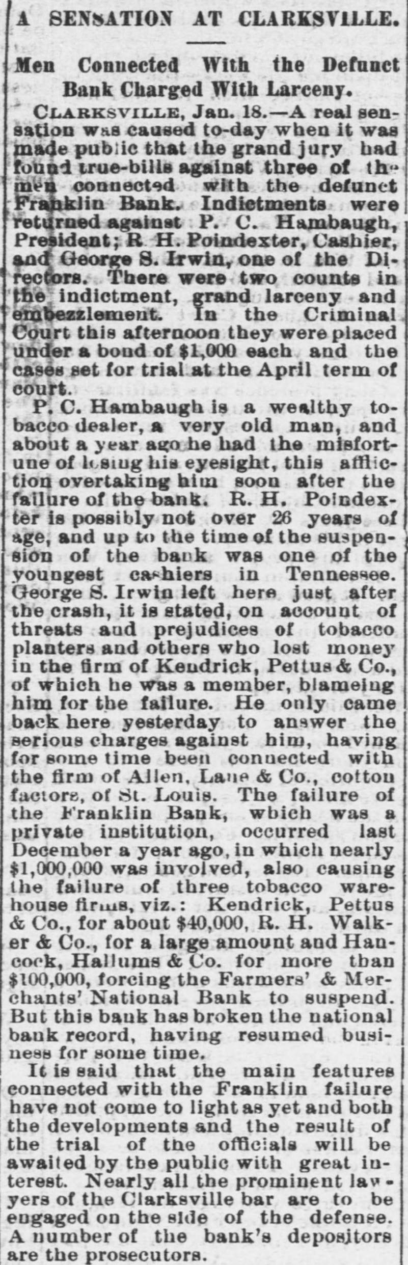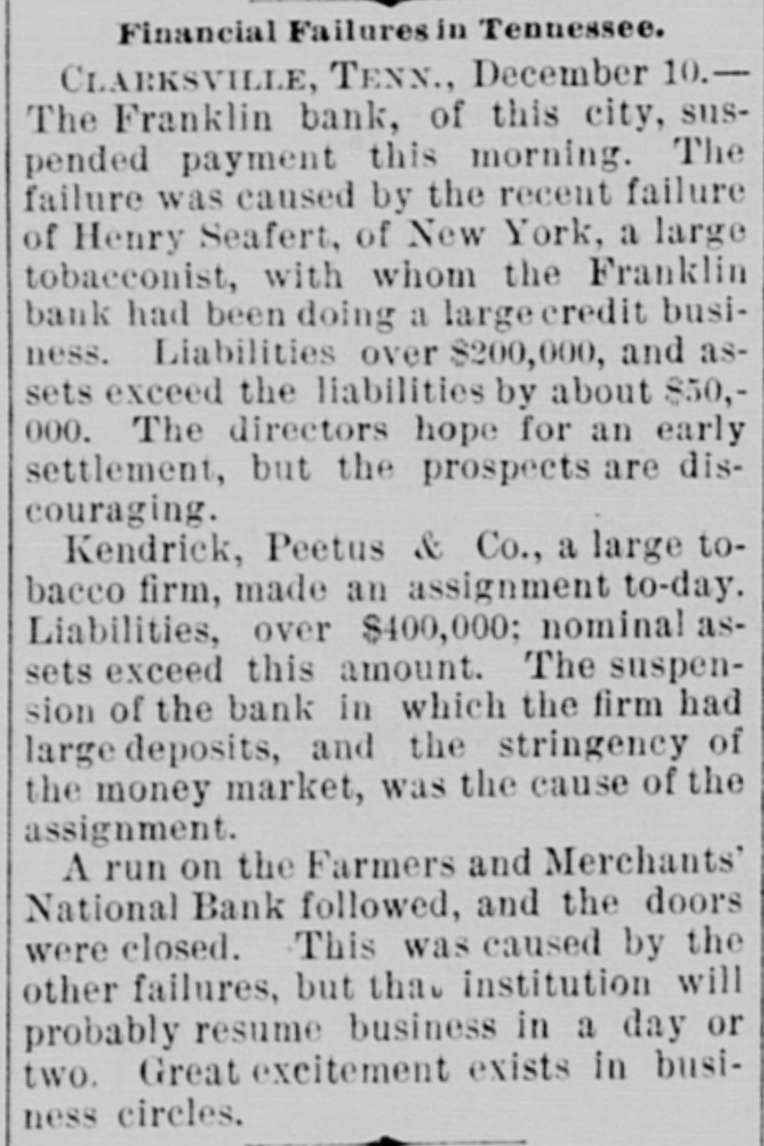 FINANCIAL AFFAIRS. Failures Reported in New York and other Parts of the Country. The New York clearing-house issued $500,000 additional certificates. The total now outstanding is $15,025,000. There has been some discussion of the wisdom of banks buying bills of exchange at the low rates now prevailing and importing gold against them. It is announced that the directors of the Bank of Commerce authorized the purchase of a large amount of sterling ex. change and to take out clearing-house certificates for this purchase. Advices from London says: "Bullion to he amount of £350,000 was withdrawn from the Bank of England for shipment to America." Charles H. Hamilton and William F. Bishop comprising the firm of Hamilton & Bishop, stock brokers and bankers of 96 Broadway, made an assignment to Harman Aaran. Assignee Aaron says the liabilities of the suspended firm would amount to about $75,000 Their assets are not as yet known. Tarlow & Hutshing, manufacturers of knit goods at 34 Walker ssreet, have been closed by thesheriff. Richard D. Young, perfumer at 100 William street, made an as ignment. CLARKSVILLE, TENN.-Tne Franklin Bank of this city, has suspended payment. The failure was caused by the recent failure of Henry Seafert, of New York, a large tobacconist, with whom the Franklin had been doing H large credit business. The Franklin Bank is a private bank, its capital stock is $50,000. The assets and liabilities of the bank are not known as yet. Kendrick, Pettus & Co., a large tobacco firm, made an assignment. The suspension of the bank, in which the firm had large deposits, and the stringency of the money market made it impossible for the firm to meet their obligations, and in order to protect all their creditors alike they assigned. The liabilities are $41,000. A statement of the assets has not been made. The liabilities of the Franklin Bank amount to over $200,000, and assets exceed the liabilities by about $50,000. The liabilities of Kendrick, Pettus & Co., areover $400,000; nominal e-sets exceed this amount. A run' on the Farmers and Mechants' National Bank followed, and the doors were closed. This was caused by the other failures, but that institution will probably resume business in a day or two. Great excitement exists in business circles. MEMPHIS, TENN.-N. L. Avery and Raphael Simmes, conducting business under the firm name of N. L. Avery & Co., at Osceola, Ark.; Avery & Simmes, at Blytheville, Ark.,. and N. L Avery, at Frenchman's Bayou, Ark., made an assignment at Osceola, Ark. They were the principal merchants of that town. Liabilities $60,000, due principally to Memphis and St. Louis creditors. Assets nominally $60,000. The failure is attributed to poor crops and inability to make collections. ARKANSAS CITY, KAN.-The information is given out that the American Bank, will not resume bu iness. A bank inspector and United States marshal will take charge of the bank and close up itsbusiness. There is about $190,000 due depositors. DENVER, CoL-The grocery and importing house of John H. Carleton was closed on attachments of $20,000. The liabilities are $24,000; assets unknown.
