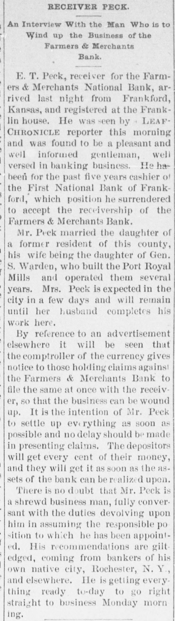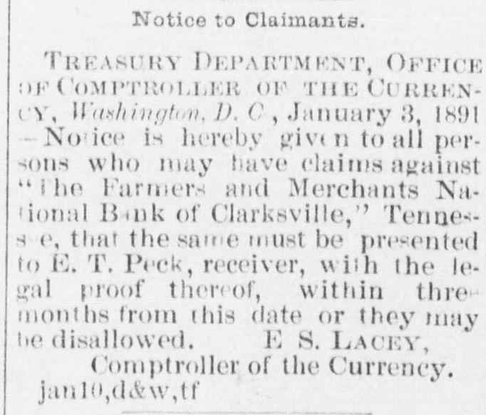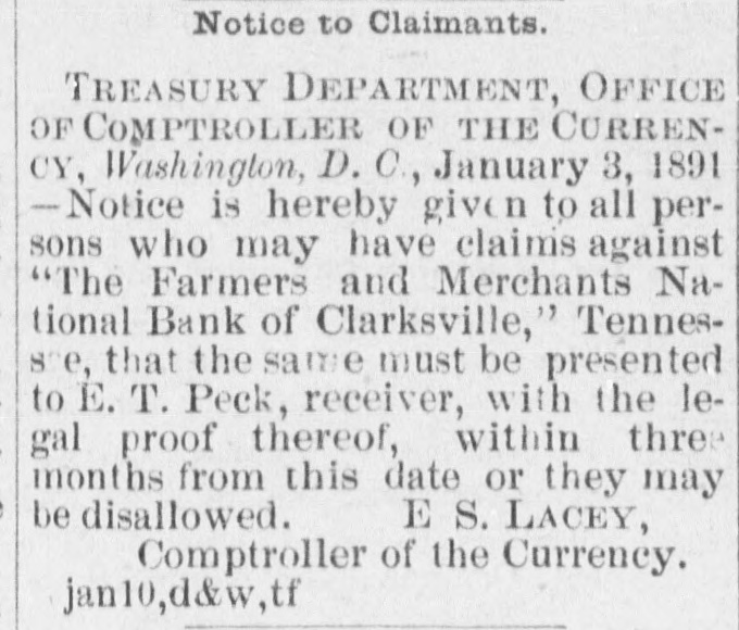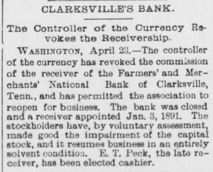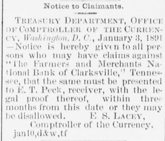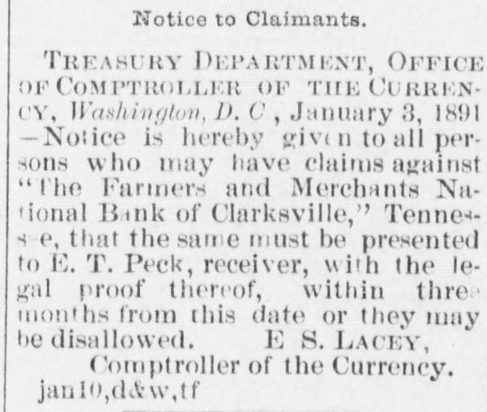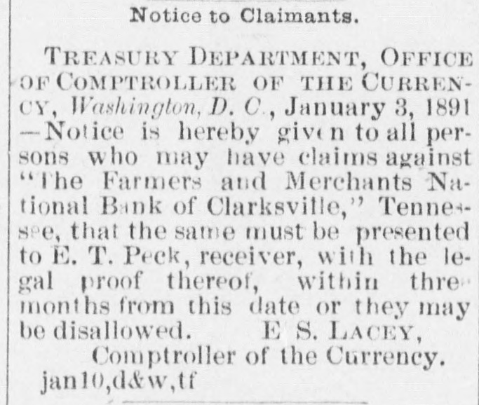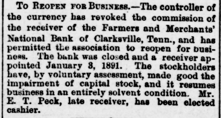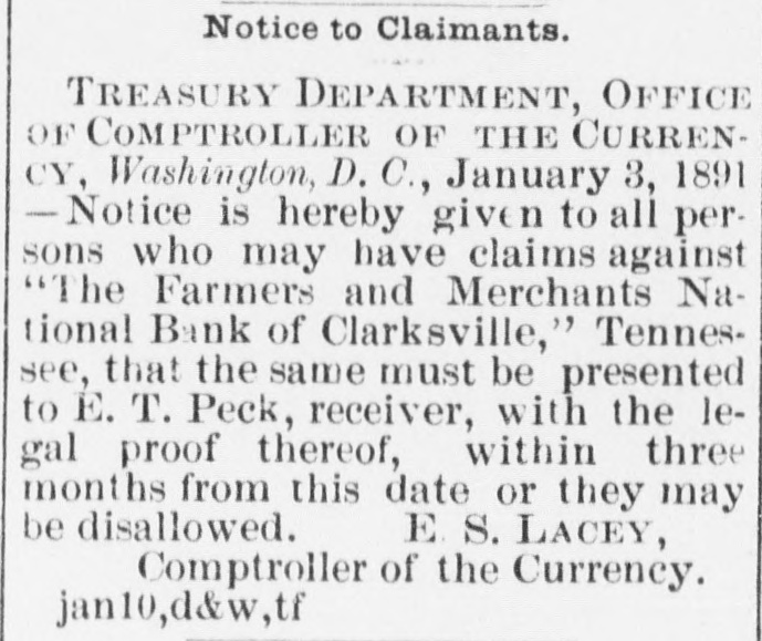 FINANCIAL AFFAIRS. Failures Reported in New York and other Parts of the Country. The New York clearing-house issued $500,000 additional certificates. The total now outstanding is $15,025,000. There has been some discussion of the wisdom of banks buying bills of exchange at the low rates now prevailing and importing gold against them. It is announced that the directors of the Bank of Commerce authorized the purchase of a large amount of sterling ex. change and to take out clearing-house certificates for this purchase. Advices from London says: "Bullion to he amount of £350,000 was withdrawn from the Bank of England for shipment to America." Charles H. Hamilton and William F. Bishop comprising the firm of Hamilton & Bishop, stock brokers and bankers of 96 Broadway, made an assignment to Harman Aaran. Assignee Aaron says the liabilities of the suspended firm would amount to about $75,000 Their assets are not as yet known. Tarlow & Hutshing, manufacturers of knit goods at 34 Walker ssreet, have been closed by thesheriff. Richard D. Young, perfumer at 100 William street, made an as ignment. CLARKSVILLE, TENN.-Tne Franklin Bank of this city, has suspended payment. The failure was caused by the recent failure of Henry Seafert, of New York, a large tobacconist, with whom the Franklin had been doing H large credit business. The Franklin Bank is a private bank, its capital stock is $50,000. The assets and liabilities of the bank are not known as yet. Kendrick, Pettus & Co., a large tobacco firm, made an assignment. The suspension of the bank, in which the firm had large deposits, and the stringency of the money market made it impossible for the firm to meet their obligations, and in order to protect all their creditors alike they assigned. The liabilities are $41,000. A statement of the assets has not been made. The liabilities of the Franklin Bank amount to over $200,000, and assets exceed the liabilities by about $50,000. The liabilities of Kendrick, Pettus & Co., areover $400,000; nominal e-sets exceed this amount. A run' on the Farmers and Mechants' National Bank followed, and the doors were closed. This was caused by the other failures, but that institution will probably resume business in a day or two. Great excitement exists in business circles. MEMPHIS, TENN.-N. L. Avery and Raphael Simmes, conducting business under the firm name of N. L. Avery & Co., at Osceola, Ark.; Avery & Simmes, at Blytheville, Ark.,. and N. L Avery, at Frenchman's Bayou, Ark., made an assignment at Osceola, Ark. They were the principal merchants of that town. Liabilities $60,000, due principally to Memphis and St. Louis creditors. Assets nominally $60,000. The failure is attributed to poor crops and inability to make collections. ARKANSAS CITY, KAN.-The information is given out that the American Bank, will not resume bu iness. A bank inspector and United States marshal will take charge of the bank and close up itsbusiness. There is about $190,000 due depositors. DENVER, CoL-The grocery and importing house of John H. Carleton was closed on attachments of $20,000. The liabilities are $24,000; assets unknown.