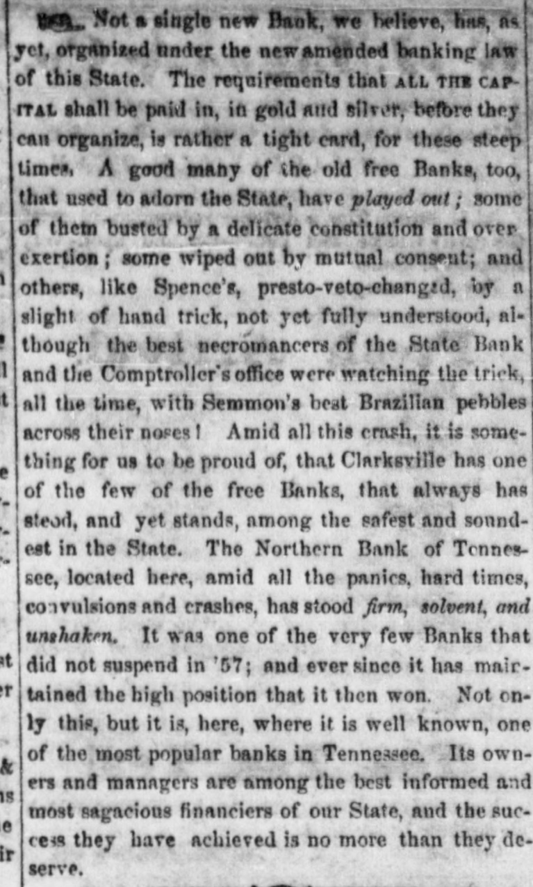 The old Northern Bank, as it is generally known, has the most interesting history of any bank in the south. It was established by D. N. Kennedy and Jas. L. Glenn the 7th of September, 1854, the two gentlemen owning all of the stock, and have continued to operate it to the present date on a capital stock of $50,000. And no bank has maintained more universal confidence in its sound policy and stability of character. During the panic of 1857, every bank in the State except this and two others, the Merchants Bank of Nashville and Buck's Bank of McMinnville, suspended payment. A run was made on this bank, when it paid off its depositors and established itself thoroughly in the confidence of the people, which confidence it has since maintained. At the breaking out of the war it had out a large circulation of its own currency, which it commenced redeeming, and at the fall of Fort Donelson, February, 1862, Mr. Kennedy went South with the assets of the bank, where they were converted into gold and the money shipped to Europe. Mr. Glenn remained here with gold enough to pay off the depositors, which he did, many of them declining to take it. But Mr. Glenn's bank was in the earth; he had the money in gold and buried in the ground, and he was also afraid to keep it.