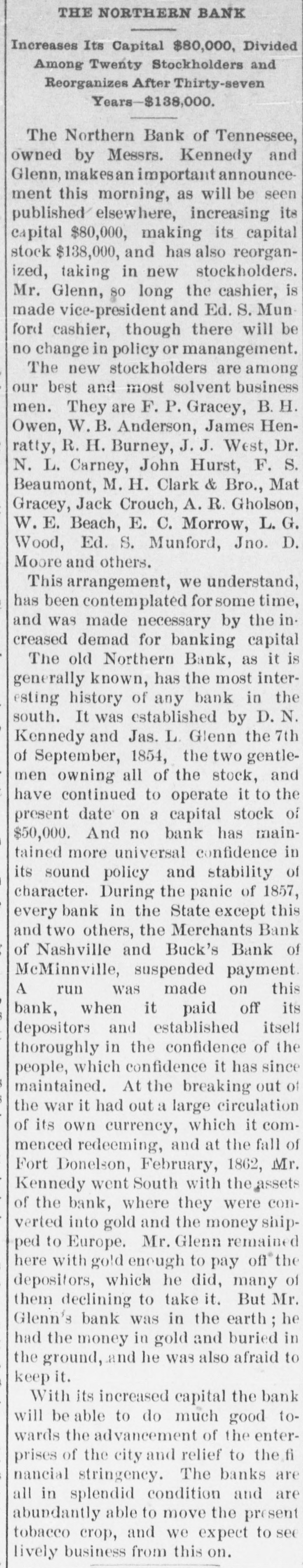 The Northern Bank of Tennessee, owned by Messrs. Kennedy and Glenn, makes an important announcement this morning, as will be seen published elsewhere, increasing its capital $80,000, making its capital stock $138,000, and has also reorganized, taking in new stockholders. Mr. Glenn, so long the cashier, is made vice-president and Ed. S. Munford cashier, though there will be no change in policy or manangement. The new stockholders are among our best and most solvent business men. They are F. P. Gracey, B. H. Owen, W. B. Anderson, James Henratty, R. H. Burney, J. J. West, Dr. N. L. Carney, John Hurst, F. S. Beaumont, M. H. Clark & Bro., Mat Gracey, Jack Crouch, A. R. Gholson, W. E. Beach, E. C. Morrow, L. G. Wood, Ed. S. Munford, Jno. D. Moore and others.