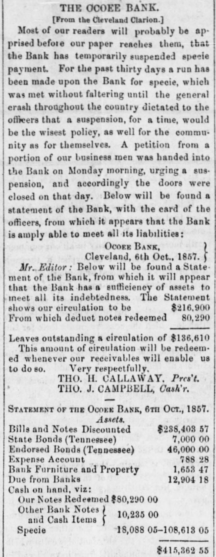 THE OCOEE BANK. [From the Cleveland Clarion.] Most of our readers will probably be apprised before our paper reaches them, that the Bank has temporarily suspended specie payment. For the past thirty days a run has been made upon the Bank for specie, which was met without faltering until the general erash throughout the country dictated to the officers that a suspension, for a time, would be the wisest policy, as well for the community as for themselves. A petition from a portion of our business men was handed into the Bank on Monday morning, urging a suspension, and accordingly the doors were closed on that day. Below will be found a statement of the Bank, with the card of the officers, from which it appears that the Bank is amply able to meet all its liabilities: OCOEE BANK, Cleveland, 6th Oct., 1857. Mr. Editor: Below will be found a Statement of the Bank, from which it will appear that the Bank has a sufficiency of assets to meet all its indebtedness. The Statement shows our circulation to be $216,900 From which deduct notes redeemed 80,290 Leaves outstanding a circulation of $136,610 This amount of circulation will be redeemed whenever our receivables will enable us to do so. Very respectfully, THO. H. CALLAWAY. Pres't. THO. J. CAMPBELL, Cash'r. STATEMENT OF THE OCOEE BANK, 6TH Oct., 1857. Assets. Bills and Notes Discounted $238,403.57 7,000.00 State Bonds (Tennessee) 46,000.00 Endorsed Bonds (Tennessee) 788 28 Expense Account 1,653 Bank Furniture and Property Due from Banks 12,904 18 Cash on hand, viz: Our Notes Redeemed $80,290.00 Other Bank Notes 10,235 00 and Cash Items 18,088 05-108,613 05 Specie $415,362.55