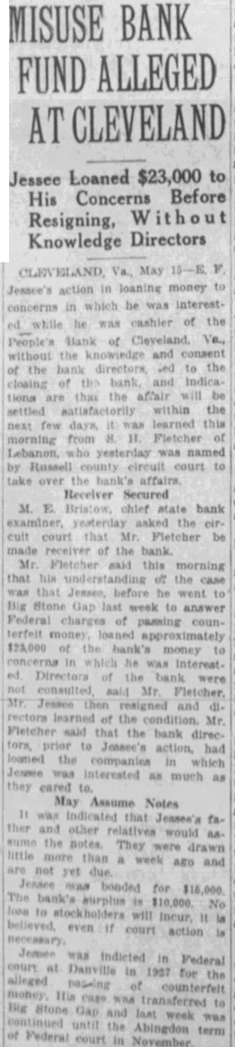 MISUSE BANK FUND ALLEGED CLEVELAND Jessee Loaned $23,000 to His Concerns Before Resigning, Without Knowledge Directors May Jessee's loaning money he the People's without the consent the the of and the affair will settled within the learned this next morning H. Fletcher of yesterday was named by Russell court over Receiver Secured bank asked Fletcher be made receiver the bank. Mr. this morning that case before to Gap last week to Federal of terfeit the bank were not Mr. and rectors of the Mr. Fletcher that the bank prior to action. had the as much as they cared May Assume Notes other would as. the They were drawn little week and bonded No to Federal for the alleged His Big was Abingdon term of Federal November