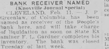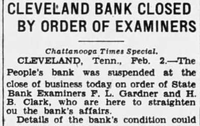 CLEVELAND BANK CLOSED BY ORDER OF EXAMINERS Special. CLEVELAND, Tenn., Feb. People's bank suspended at the close business today on order of State Bank F. are here to straighten Details of the bank's condition could
