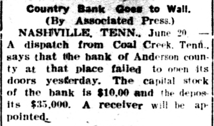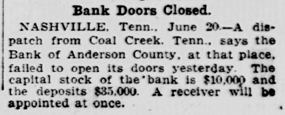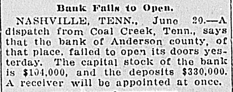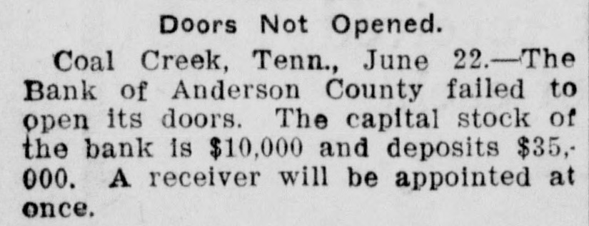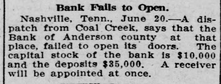 Bank Fails to Open. Nashville, Tenn., June 20.-A dispatch from Coal Creek, says that the Bank of Anderson county at that place, failed to open its doors. The capital stock of the bank is $10,000 and the deposits $35,000. A receiver will be appointed at once.