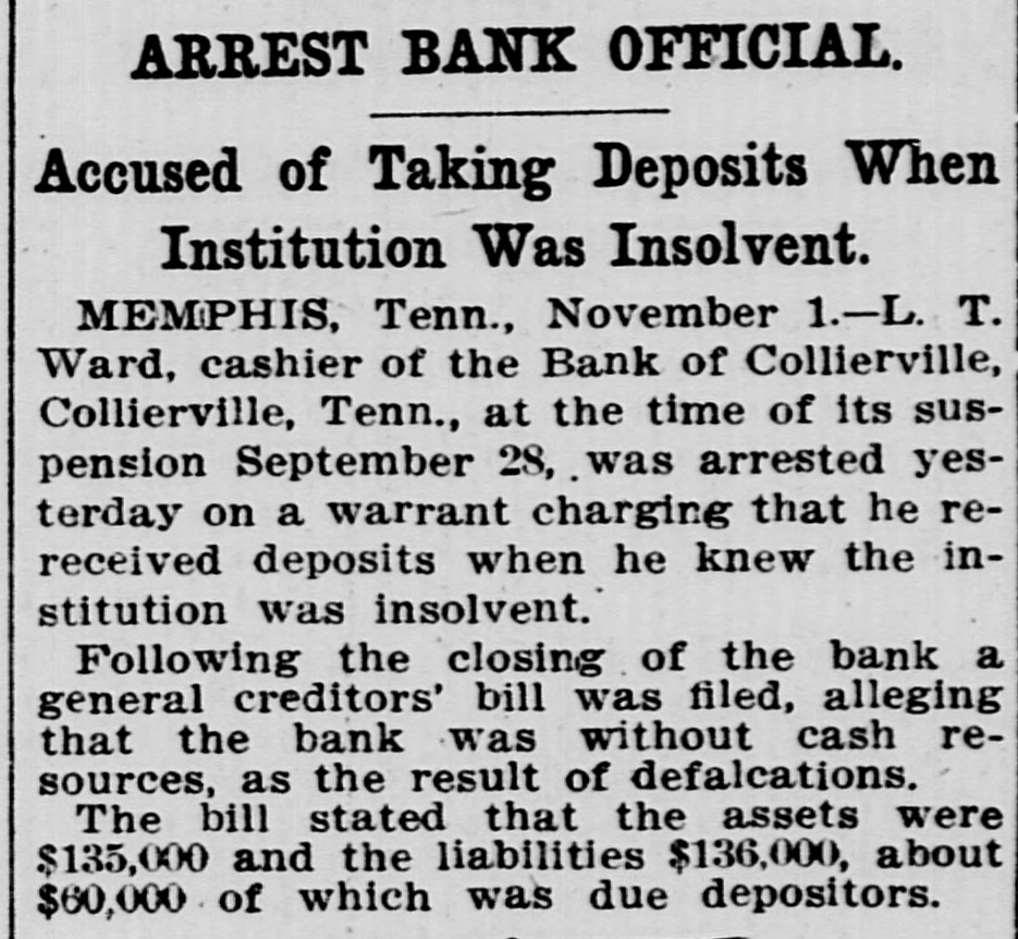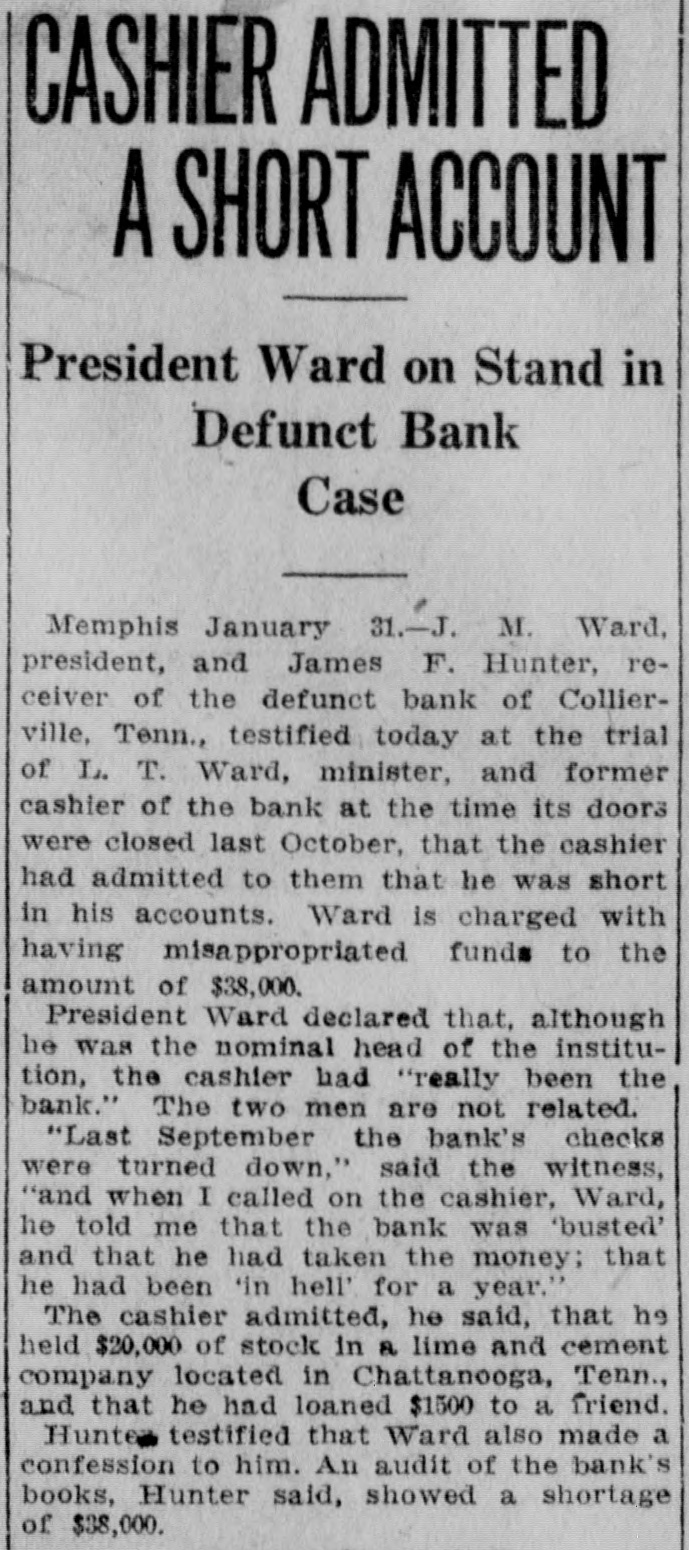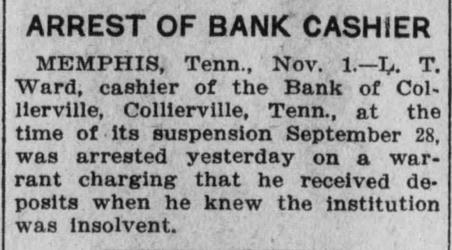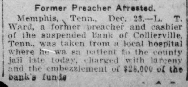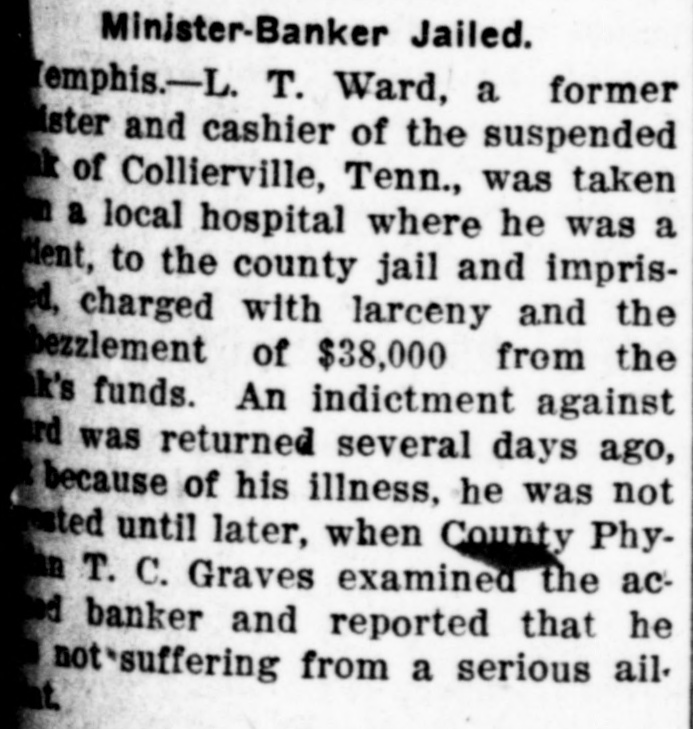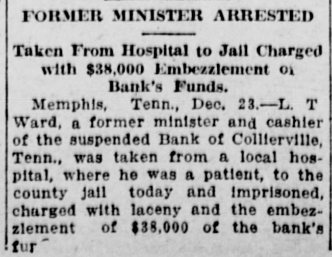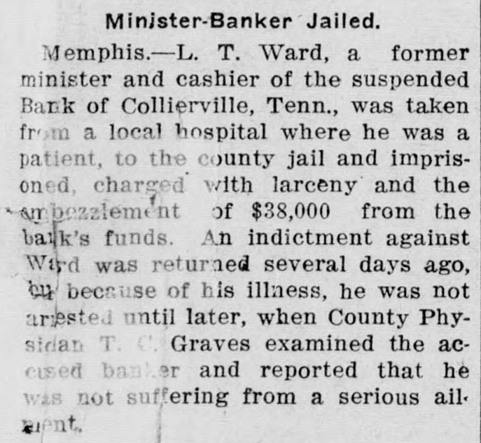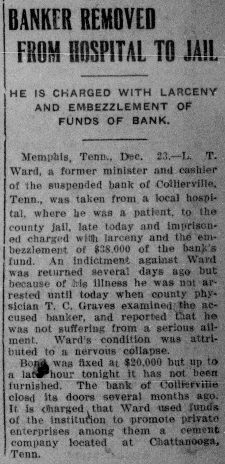 L. T. Ward, a former preacher and cashier of the suspended bank of Collierville, Tenn., was taken from a hospital, at Memphis, where he was a patient, to the county jail, late Monday, charged with larceny and embezzlement of $38,000 of the bank's funds. An indictment against him was returned, several days ago, but because of his illness he was not arrested until Monday. Ward's condition was attributed to nervous collapse. Bond was fixed at $20,000, but has not been obtained. The bank of Collierville closed its doors, several months ago. An indictment charging that he accepted deposits at a time he knew the bank to be insolvent is also pending against Ward.