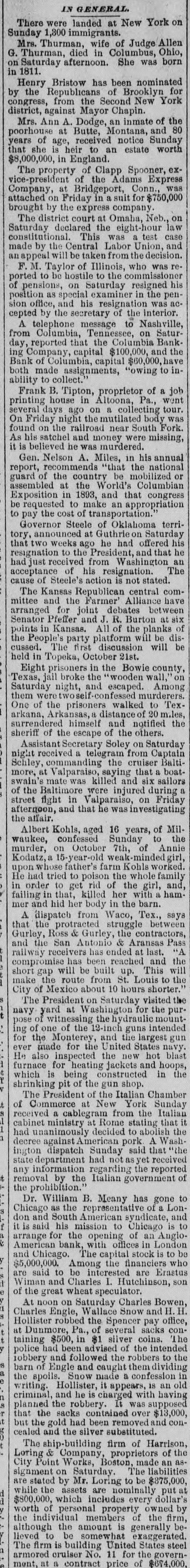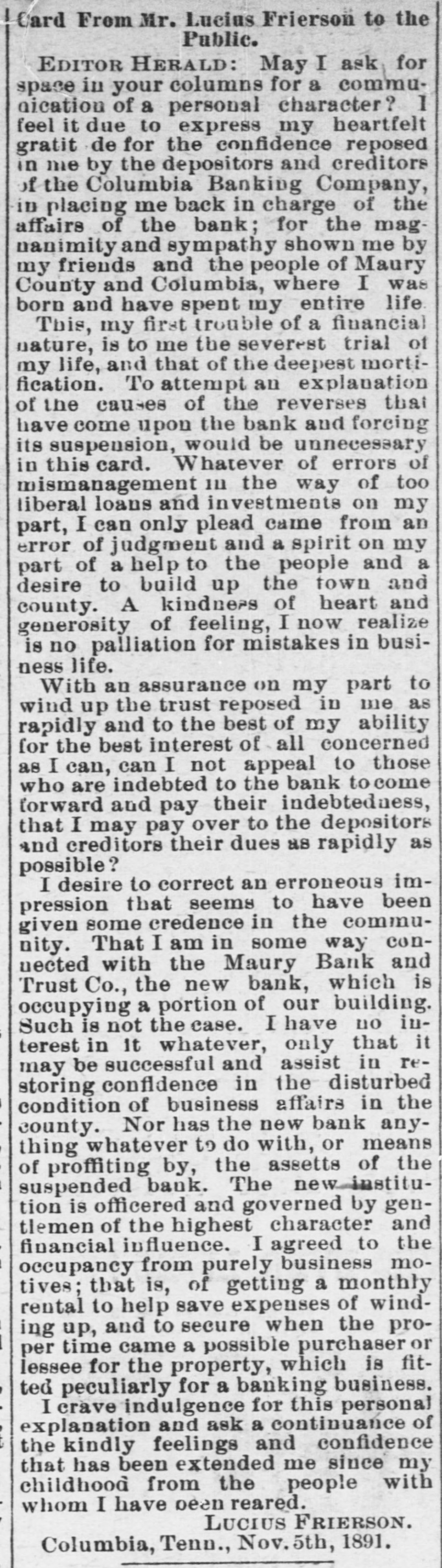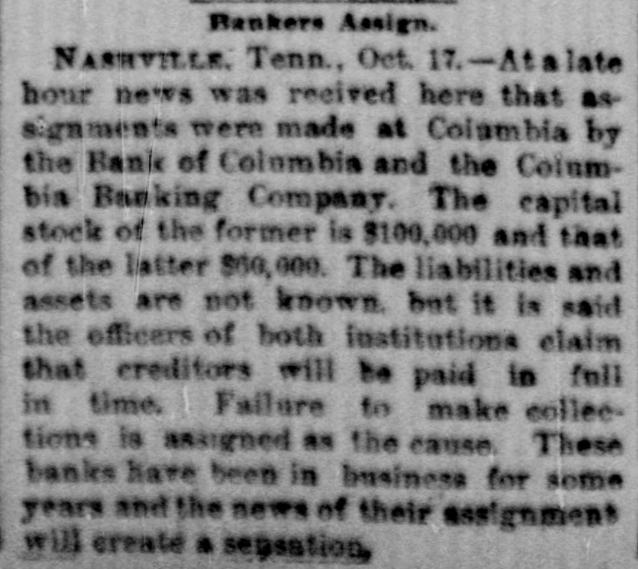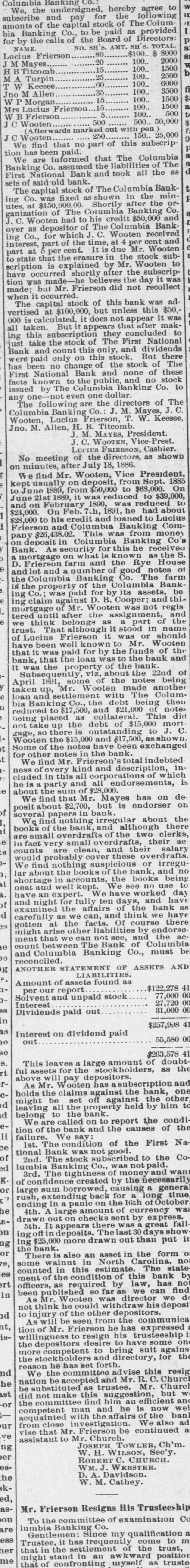Banking Co. assumed the liabilities of The First National Bank and took all the as sets of said old bank. The capital stock of The Columbia Banking Co. was fixed as shown in the minutes, at $150,000.00 Shortly after the organization of The Columbia Banking Co. J. C. Wooten had to his credit $50,000 and over as depositor of The Columbia Banking Co., for which J. C. Wooten received interest, part of the time, at 4 per cent and part at 5 per cent. It is due Mr. Wooten to state that the erasure in the stock subscription is explained by Mr. Wooten to have occurred shortly after the subscription was made-h believes the day it was made; but Mr. Frierson did not recollect when it occurred. The capital stock of this bank was advertised at $100,000, but unless this $50,000 is calculated, it does not appear it was all taken. But it appears that after making this subscription they concluded to just take the stock of The First National Bank and count this only, and dividends were paid only on this stock. But there has been no change of the stock of The First National Bank and none of these facts known to the public, and no stock issued by The Columbia Banking Co. to any one-not even one dollar. The following are the directors of The Columbia Banking Co.: J. M. Mayes, J. C. Wooten, Lucius Frierson, T. W. Keesee, Jno. M. Allen, H. B. Titcomb. J. M. MAYES, President. J.C. WOOTEN, Vice- Prest. LUCIUS FRIERSON, Cashier. No meeting of the directors, as shown on minutes, after July 18, 1886. W 0 find Mr. Wooten, Vice President. kept usually on deposit, from Sept. 1885 to June 1889, from $50,000 to $68,000. On June 21st 1889, it was reduced to $39,000, and on February 1890, was reduced to $24,000. On Feb. 7th, 1891, he had about $28,000 to his credit and loaned to Lucius Frierson and Columbia Banking Company $26,438.02. This was from money on deposit in Columbia Banking Co's Bank. As security for this he received a mortgage on what is known as the S. D. Frierson farm and the Rye House and lot and a number of good notes of the Columbia Banking Co. The farm is the property of the Columbia Banking Co.; was paid for by its assets, be ing claim against D. B. Cooper; and this mortgage of Mr. Wooten was not regis tered until after the assignment, and we think belongs as a part of the trust. That although it stood in name of Lucius Frierson it was or should have been well known to Mr. Wooten that it was paid for by the funds of the bank, that the loan was to the bank and it was the property of the bank. Subsequently, viz, about the 22nd of April 1891, some of the notes being taken up, Mr. Wooten made another loan and settlement with The Columbia Banking Co., the debt being then reduced to $17,500, and $21,000 of notes being placed as collateral. This did not take up the debt of $15,000 mort rage, SO there is outstanding to J. C. Wooten the $15,000 and $17,500, as shown it Some of the notes have been exchanged for other notes in the bank. We find Mr. Frierson' 8 total indebted ness of every kind and description, included in this all corporations of which he is a party and all endorsements, is e about the sum of $28,000. We find that Mr. Mayes has on deposit about $2,700, but is endorser on f several papers in bank. We find nothing irregular about the books of the bank, and although there are small overdrafts of the two clerks, e in fact very small overdrafts, their ac 8 counts are clean, and their salary would probably cover these overdrafts. We find nothing suspicious or irregular about the books of the bank, and no at shortage in accounts, the books being neat and well kept. We see no use to have an expert. We have worked day of and night for fully ten days, and have examined the affairs of the bank as d carefully as we can, and think we have gotten at the facts. Of course there might arise other liabilities by endorse ment that we can not see, and the ac10 count between The Bank of Columbia 00 reconciled. and Columbia Banking Co., must be g ANOTHER STATEMENT OF ASSETS AND LIABILITIES. Amount of assets found as $122,278 41 aper our report 77,000 27,720 Solvent Interest and unpaid stock 88 31,000 Dividends paid out n $257,998 as Interest on dividend paid 55,580 00 10 out se $263,578 41 S. This leaves a large amount of doubtrt ful assets for the stockholders, as the above will pay depositors. rAs Mr. Wooten has asubscription and holds the claims against the bank, one might be set off against the other d leaving all the property held by him to d belong to the bank. We are called on to report the condition of the bank and the causes of the 11 failure. We say: ce 1st. The condition of the First National Bank was not good. of 2nd. The stock subscribed to the Coed lumbia Banking Co., was not paid. 3rd. The tightness of money and want bc of confidence created by the necessarily or large sum borrowed, causing a general rush, extending back for a long time. ending in a panic on the 16th of October he 4th. A large amount of currency was drawn out on checks sent by express. 5th. It appears there was a great fallon ing off in deposits. The last 30 days show ng the ing $25,000 bank. more drawn out than put in or There is also an asset in the form of 78, some walnut in North Carolina, not es counted in this estimate. The state ment of the condition of this bank by rt officers, as required by law, has not in been published so far as we can find As Mr. Wooten was director we do not think he could withdraw his deposit nd to injury of the other depositors. As will be seen from the communica nt, tion of Mr. Frierson he has expressed iswillingness to resign his trusteeship the depositors desire to have some on more competent to bring suit against the stockholders and directory, for the reason he has set forth. nd We the committee advise this resig he nation be accepted and Mr. R. C. Church be substituted as trustee. Mr. Church ast did not make this suggestion, but W or the committee find him an efficient and competent man and he is now
