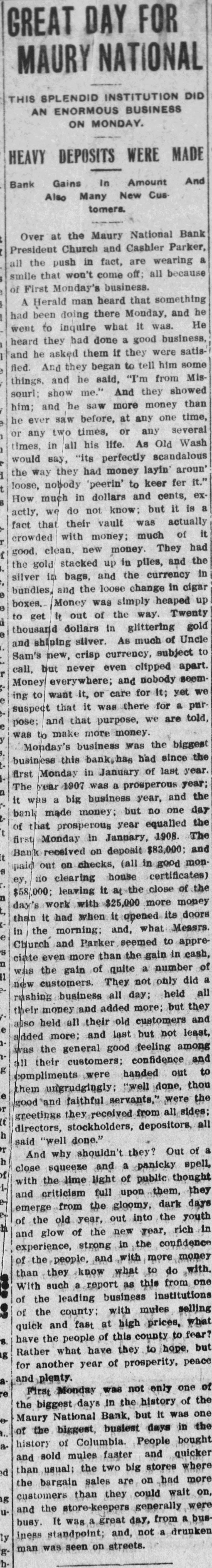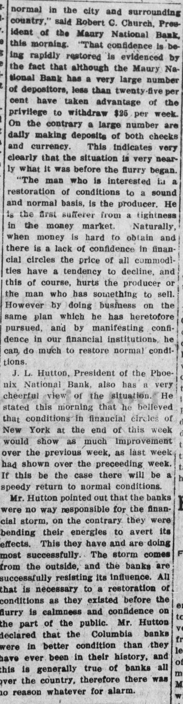 normal in the city and surrounding country," said Robert C. Church, President of the Maury National Bank, this morning. "That confidence is being rapidly restored is evidenced by the fact that although the Maury National Bank has a very large number of depositors, less than twenty-five per cent have taken advantage of the privilege to withdraw $25 per week. On the contrary a large number are daily making deposits of both checks and currency. This indicates very clearly that the situation is very nearly what it was before the flurry began. "The man who is interested in a restoration of conditions to a sound and normal basis, is the producer. He is the first sufferer from a tightness in the money market. Naturally, when money is hard to obtain and there is a lack of confidence in financial circles the price of all commodities have a tendency to decline, and this of course, hurts the producer or the man who has something to sell. However by doing business on the same plan which he has heretofore pursued, and by manifesting confidence in our financial institutions, he can do much to restore normal conditions. J. L. Hutton, President of the Phoenix National Bank, also has a very cheerful view of the situation. He stated this morning that he believed that conditions in financial circles of New York at the end of this week would show as much Improvement over the previous week, as last week had shown over the preceeding week. If this be the case there will be a speedy return to normal conditions. Mr. Hutton pointed out that the banks were no way responsible for the financial storm, on the contrary they were bending their energies to avert its effects. This they have and are doing most successfully. The storm comes from the outside, and the banks are successfully resisting its influence. All that is necessary to a restoration of conditions as they existed before the er flurry is calmness and confidence on to the part of the public. Mr. Hutton vo declared that the Columbia banks were in better condition than they le have ever been in their history, and of this is generally true of banks all over the country, therefore there was 10 reason whatever for alarm.