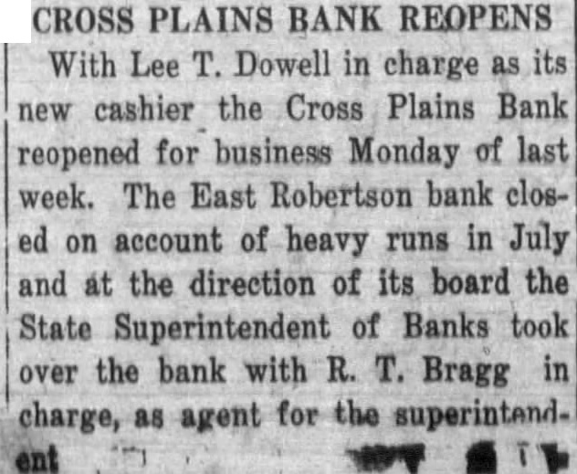 CROSS PLAINS BANK REOPENS With Lee Dowell in charge its new cashier the Cross Plains Bank reopened for business Monday of last week. The East Robertson bank closon account of heavy runs in July and at the direction of its board the State Superintendent of Banks took over the bank with Bragg as for the superintendcharge, agent