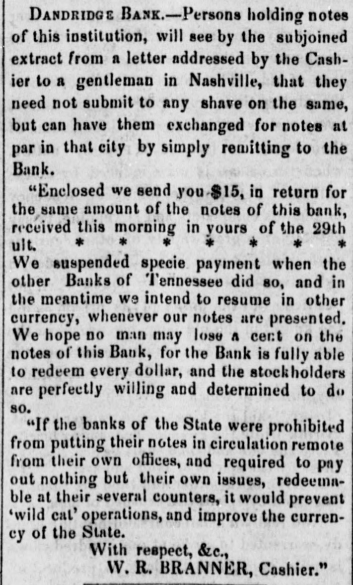 DANDRIDGE BANK.-Persons holding notes of this institution, will see by the subjoined extract from a letter addressed by the Cashier to a gentleman in Nashville, that they need not submit to any shave on the same, but can have them exchanged for notes at par in that city by simply remitting to the Bank. "Enclosed we send you $15, in return for the same amount of the notes of this bank, received this morning in yours of the 29th ult. We suspended specie payment when the other Banks of Tennessee did so, and in the meantime we intend to resume in other currency, whenever our notes are presented. We hope no man may lose a cent on the notes of this Bank, for the Bank is fully able to redeem every dollar, and the stockholders are perfectly willing and determined to do so. "If the banks of the State were prohibited from putting their notes in circulation remote from their own offices, and required to pay out nothing but their own issues, redeemable at their several counters, it would prevent 'wild cat' operations, and improve the currency of the State. With respect, &c., W. R. BRANNER, Cashier."