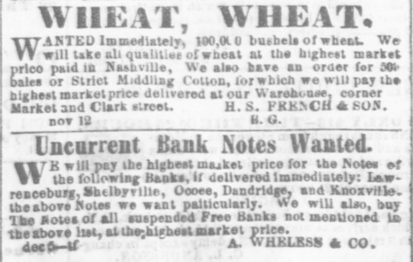 WHEAT. WHEAT, ANTED Immediately, 100, al 0 bushels of whent. We W will take all qualities of wheat at the highest market price paid in Nashville, We also have an order for 500 bales or Strict Middling Cotton, for which we will pay the highest market price delivered at our Warehouse, corner H. S. FRENCH & SON. Market and Clark street. B.G. nov 12 Uncurrent Bank Notes Wanted. R will pay the highest market price for the Notes of W the following Banks, if delivered immediately: Lawrenceburg, Shelbyville, Occee, Dandridge, and Knoxville. the above Notes we want particularly. We will also, buy The Notes of all suspended Free Banks not mentioned in the above list, at the ;highest market price. A. WHELESS & CO. dec 6 s