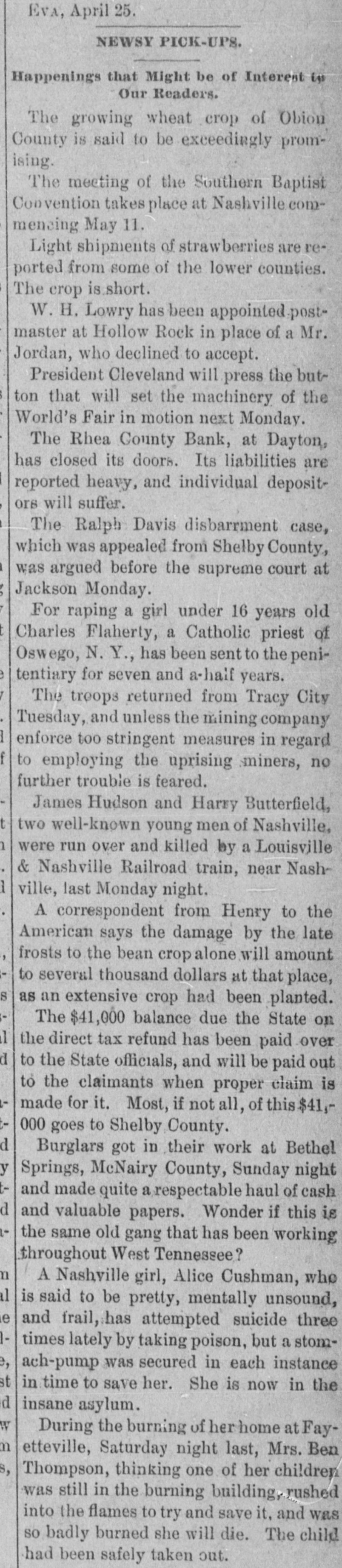 EVA, April 25. NEWSY PICK-UPS. Happenings that Might be of Interest is Our Readers. The growing wheat crop of Obion County is said to be exceedingly promising. The meeting of the Southern Baptist Convention takes place at Nashville commencing May 11. Light shipments of strawberries are reported from some of the lower counties. The crop is short. W. H. Lowry has been appointed postmaster at Hollow Rock in place of a Mr. Jordan, who declined to accept. President Cleveland will press the button that will set the machinery of the World's Fair in motion next Monday. The Rhea County Bank, at Dayton, has closed its doors. Its liabilities are reported heavy, and individual depositors will suffer. The Ralph Davis disbarrment case, which was appealed from Shelby County, was argued before the supreme court at Jackson Monday. For raping a girl under 16 years old Charles Flaherty, a Catholic priest of Oswego, N. Y., has been sent to the penitentiary for seven and a-half years. The troops returned from Tracy City Tuesday, and unless the mining company enforce too stringent measures in regard to employing the uprising sminers, no further trouble is feared. James Hudson and Harry Butterfield, two well-known young men of Nashville, 1 were run over and killed by a Louisville & Nashville Railroad train, near NashI ville, last Monday night. A correspondent from Henry to the American says the damage by the late frosts to the bean cropalone will amount to several thousand dollars at that place, S as an extensive crop had been planted. The $41,000 balance due the State on the direct tax refund has been paid over to the State officials, and will be paid out to the claimants when proper claim is made for it. Most, if not all, of this $41, 000 goes to Shelby County. Burglars got in their work at Bethel Springs, McNairy County, Sunday night and made quite a respectable haul of cash d and valuable papers. Wonder if this is the same old gang that has been working throughout West Tennessee? A Nashville girl, Alice Cushman, who is said to be pretty, mentally unsound, le and frail, has attempted suicide three times lately by taking poison, but a stomach-pump was secured in each instance in time to save her. She is now in the insane asylum. During the burning of her home at Fayetteville, Saturday night last, Mrs. Ben Thompson, thinking one of her children was still in the burning building, rushed into the flames to try and save it, and was SO badly burned she will die. The child had been safely taken out.