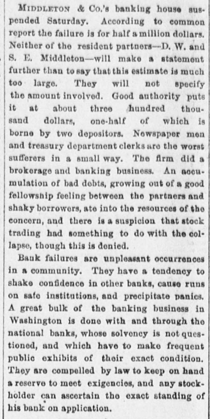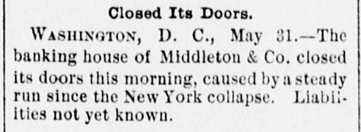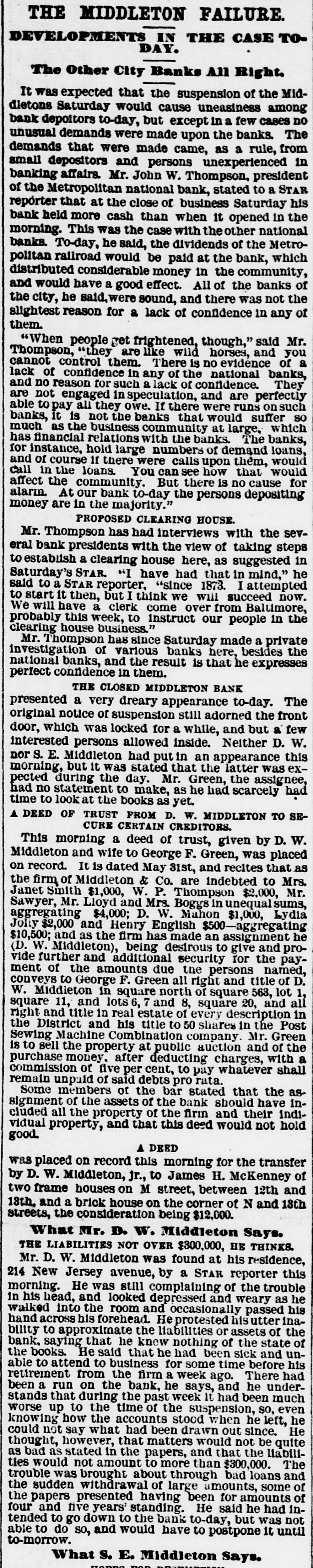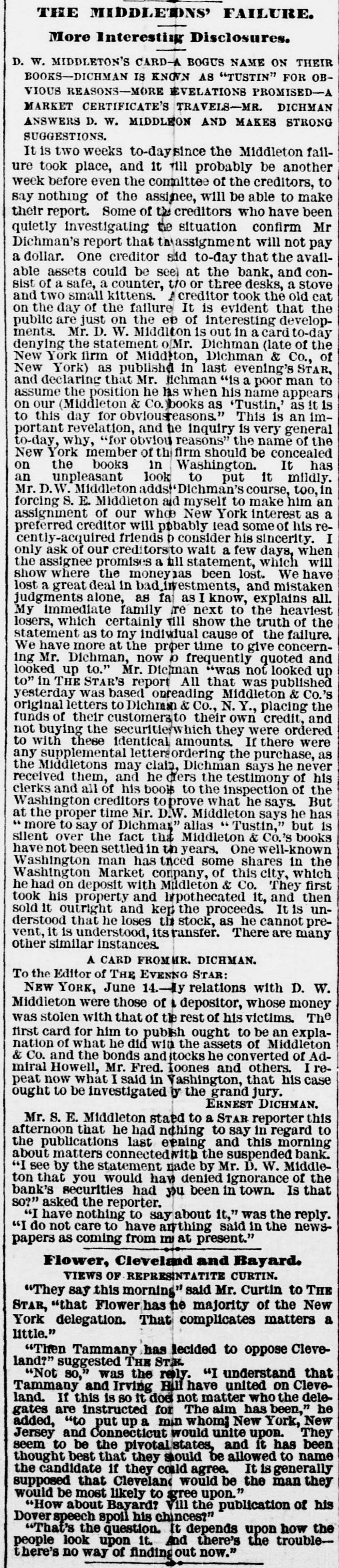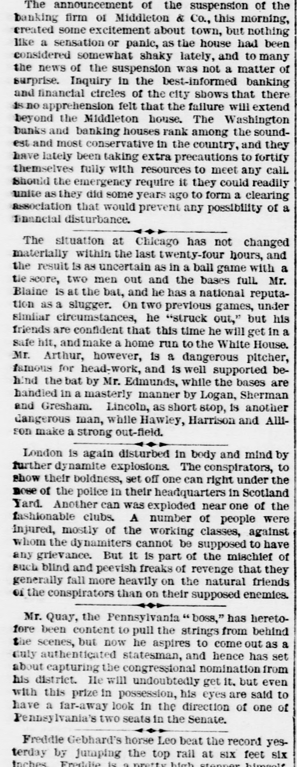 The announcement of the suspension of the banking firm of Middleton & Co., this morning, created some excitement about town, but nothing like a sensation or panic, as the house had been considered somewhat shaky lately, and to many the news of the suspension was not a matter of surprise. Inquiry in the best-informed banking and financial circles of the city shows that there IS no apprehension felt that the failure will extend beyond the Middleton house. The Washington banks and banking houses rank among the soundest and most conservative in the country, and they have lately been taking extra precautions to fortify themselves fully with resources to meet any call. Should the emergency require it they could readily unite as they did some years ago to form a clearing association that would prevent any possibility of a Inancial disturbance. The situation at Chicago has not changed materially within the last twenty-four hours, and the result is as uncertain as in a ball game with a tie score, two men out and the bases full. Mr. Blaine is at the bat, and he has a national reputation as a slugger. On two previous games, under similar circumstances, he "struck out," but his friends are confident that this time he will get in a safe hit, and make a home run to the White House. Mr. Arthur, however, is a dangerous pitcher, famous for head-work, and is well supported behind the bat by Mr. Edmunds, while the bases are handled in a masterly manner by Logan, Sherman and Gresham. Lincoln, as short stop, is another dangerous man, while Hawley, Harrison and Allison make a strong out-field. London is again disturbed in body and mind by further dynamite explosions. The conspirators, to show their boldness, set off one can right under the nose of the police in their headquarters in Scotland Yard. Another can was exploded near one of the fashionable clubs. A number of people were injured, mostly of the working classes, against whom the dynamiters cannot be supposed to have any grievance. But it is part of the mischief of such blind and peevish freaks of revenge that they generally fall more heavily on the natural friends of the conspirators than on their supposed enemies. Mr. Quay, the Pennsylvania "boss," has heretofore been content to pull the strings from behind the scenes, but now he aspires to come out as a duly authenticated statesman, and hence has set about capturing the congressional nomination from his district. He will undoubtedly get it. but even with this prize in possession, his eyes are said to have a far-away look in the direction of one of Pennsy Ivania's two seats in the Senate. Freddie Gebhard's horse Leo beat the record yesterday by jumping the top rall at SIX feet six Inches. Freddie is a pretty bigh stenner himanle