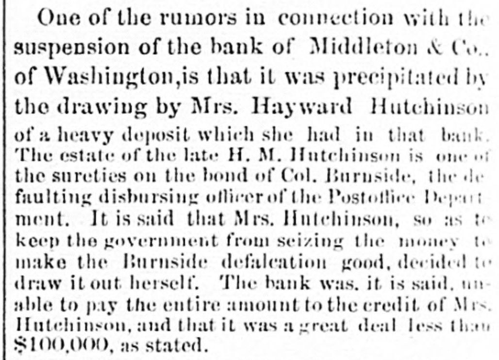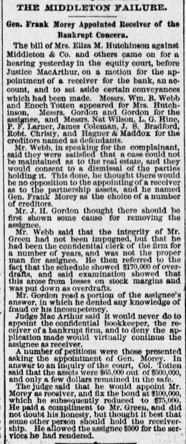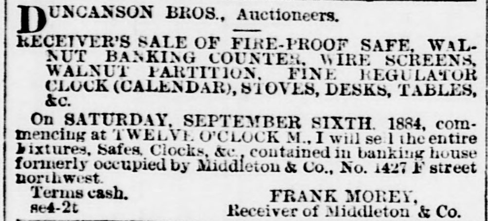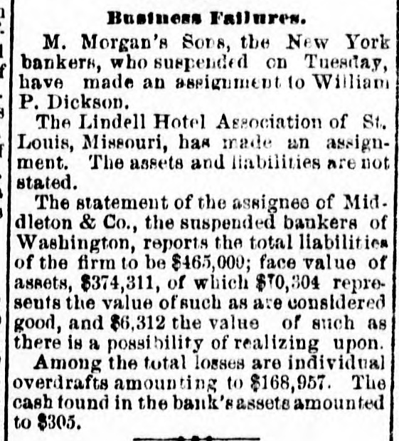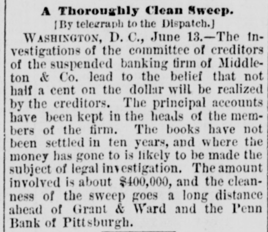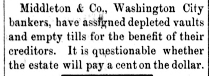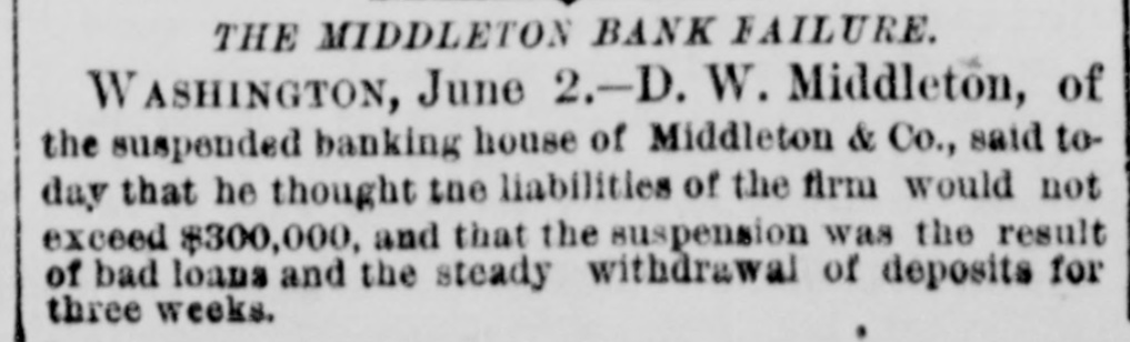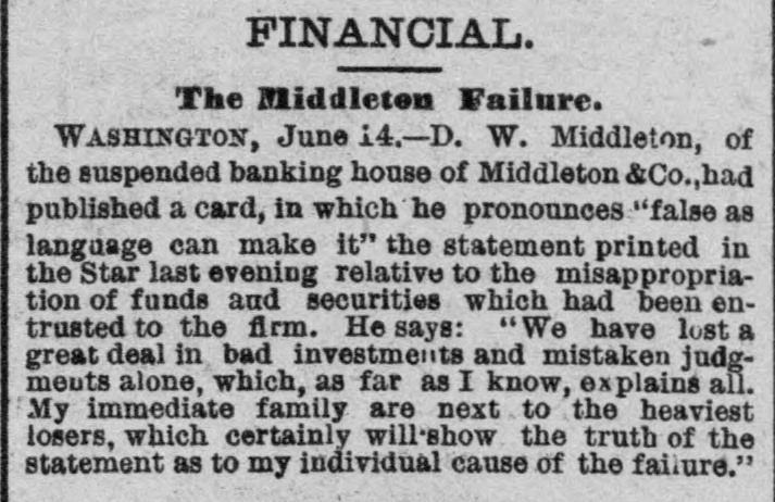 The announcement of the suspension of the banking firm of Middleton & Co., this morning, created some excitement about town, but nothing like a sensation or panic, as the house had been considered somewhat shaky lately, and to many the news of the suspension was not a matter of surprise. Inquiry in the best-informed banking and financial circles of the city shows that there IS no apprehension felt that the failure will extend beyond the Middleton house. The Washington banks and banking houses rank among the soundest and most conservative in the country, and they have lately been taking extra precautions to fortify themselves fully with resources to meet any call. Should the emergency require it they could readily unite as they did some years ago to form a clearing association that would prevent any possibility of a Inancial disturbance. The situation at Chicago has not changed materially within the last twenty-four hours, and the result is as uncertain as in a ball game with a tie score, two men out and the bases full. Mr. Blaine is at the bat, and he has a national reputation as a slugger. On two previous games, under similar circumstances, he "struck out," but his friends are confident that this time he will get in a safe hit, and make a home run to the White House. Mr. Arthur, however, is a dangerous pitcher, famous for head-work, and is well supported behind the bat by Mr. Edmunds, while the bases are handled in a masterly manner by Logan, Sherman and Gresham. Lincoln, as short stop, is another dangerous man, while Hawley, Harrison and Allison make a strong out-field. London is again disturbed in body and mind by further dynamite explosions. The conspirators, to show their boldness, set off one can right under the nose of the police in their headquarters in Scotland Yard. Another can was exploded near one of the fashionable clubs. A number of people were injured, mostly of the working classes, against whom the dynamiters cannot be supposed to have any grievance. But it is part of the mischief of such blind and peevish freaks of revenge that they generally fall more heavily on the natural friends of the conspirators than on their supposed enemies. Mr. Quay, the Pennsylvania "boss," has heretofore been content to pull the strings from behind the scenes, but now he aspires to come out as a duly authenticated statesman, and hence has set about capturing the congressional nomination from his district. He will undoubtedly get it. but even with this prize in possession, his eyes are said to have a far-away look in the direction of one of Pennsy Ivania's two seats in the Senate. Freddie Gebhard's horse Leo beat the record yesterday by jumping the top rall at SIX feet six Inches. Freddie is a pretty bigh stenner himanle