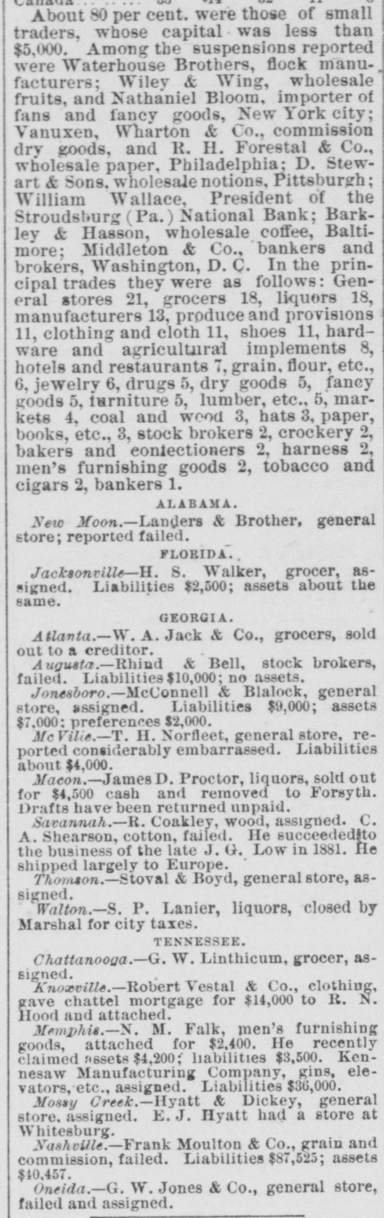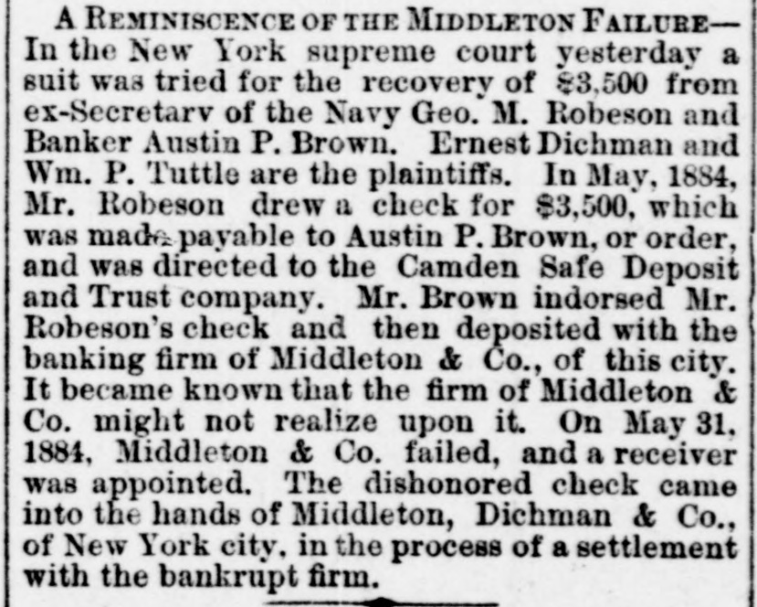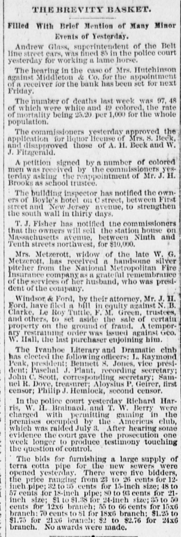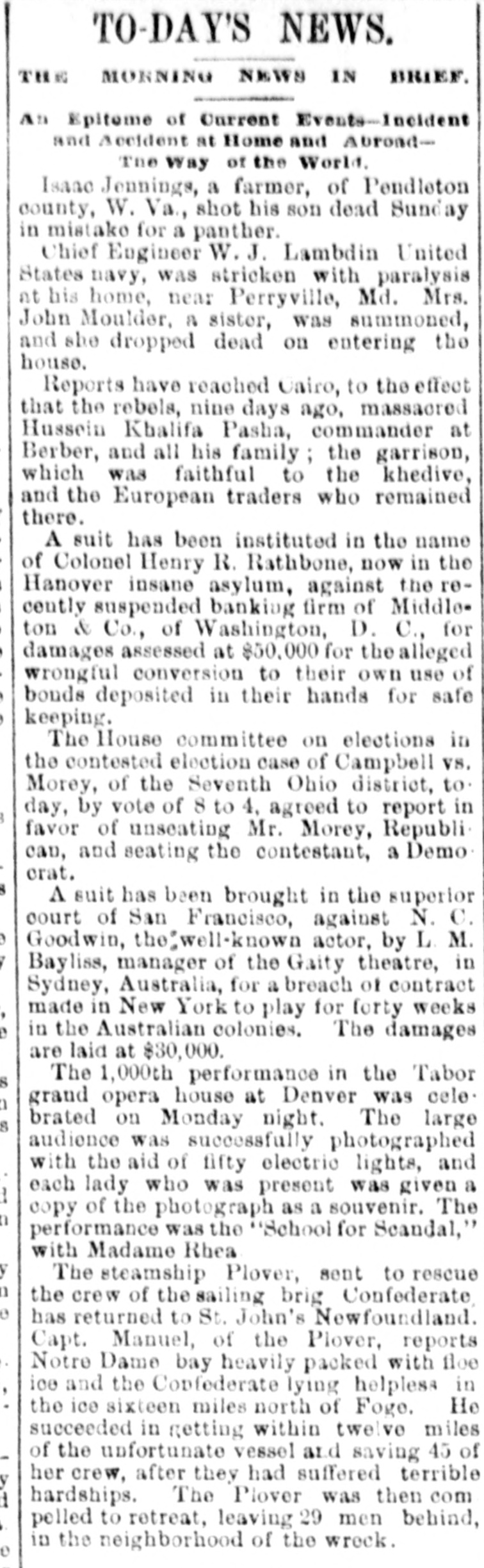 The announcement of the suspension of the banking firm of Middleton & Co., this morning, created some excitement about town, but nothing like a sensation or panic, as the house had been considered somewhat shaky lately, and to many the news of the suspension was not a matter of surprise. Inquiry in the best-informed banking and financial circles of the city shows that there IS no apprehension felt that the failure will extend beyond the Middleton house. The Washington banks and banking houses rank among the soundest and most conservative in the country, and they have lately been taking extra precautions to fortify themselves fully with resources to meet any call. Should the emergency require it they could readily unite as they did some years ago to form a clearing association that would prevent any possibility of a Inancial disturbance. The situation at Chicago has not changed materially within the last twenty-four hours, and the result is as uncertain as in a ball game with a tie score, two men out and the bases full. Mr. Blaine is at the bat, and he has a national reputation as a slugger. On two previous games, under similar circumstances, he "struck out," but his friends are confident that this time he will get in a safe hit, and make a home run to the White House. Mr. Arthur, however, is a dangerous pitcher, famous for head-work, and is well supported behind the bat by Mr. Edmunds, while the bases are handled in a masterly manner by Logan, Sherman and Gresham. Lincoln, as short stop, is another dangerous man, while Hawley, Harrison and Allison make a strong out-field. London is again disturbed in body and mind by further dynamite explosions. The conspirators, to show their boldness, set off one can right under the nose of the police in their headquarters in Scotland Yard. Another can was exploded near one of the fashionable clubs. A number of people were injured, mostly of the working classes, against whom the dynamiters cannot be supposed to have any grievance. But it is part of the mischief of such blind and peevish freaks of revenge that they generally fall more heavily on the natural friends of the conspirators than on their supposed enemies. Mr. Quay, the Pennsylvania "boss," has heretofore been content to pull the strings from behind the scenes, but now he aspires to come out as a duly authenticated statesman, and hence has set about capturing the congressional nomination from his district. He will undoubtedly get it. but even with this prize in possession, his eyes are said to have a far-away look in the direction of one of Pennsy Ivania's two seats in the Senate. Freddie Gebhard's horse Leo beat the record yesterday by jumping the top rall at SIX feet six Inches. Freddie is a pretty bigh stenner himanle