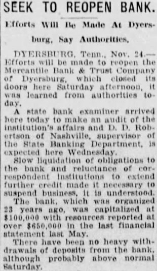 SEEK TO REOPEN BANK. Efforts will Be Made At Dyers- Tenn. Nov. 24 Efforts will be made to reopen the Mercantile Bank & Trust Company of Dyersburg, which closed its doors here afternoon was learned from authorities to day. state bank examiner arrived here today to make an audit of the institution's affairs and D. D. Rob. ertson of Nashville, supervisor of the State Banking Department, is here Slow liquidation of obligations to the bank and reluctance of cor respondent Institutions to extend further credit made it necessary to suspend business, It is understood The bank was organized 23 years ago, was capitalized with reported at over $650,000 in the last financial statement last There been no heavy with drawals of deposits from the bank, although probably above normal Saturday