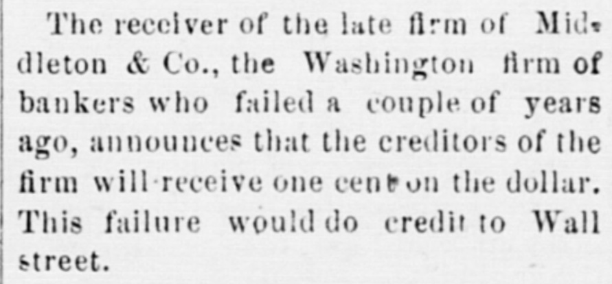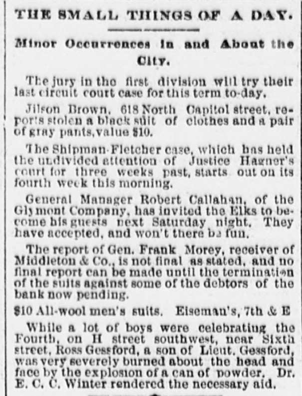 # THE SMALL THINGS OF A DAY. Minor Occurrences in and About the City. The jury in the first division will try their last circuit court case for this term to-day. Jilson Brown, 618 North Capitol street, reports stolen a black suit of clothes and a pair of gray pants, value $10. The Shipman-Fletcher case, which has held the undivided attention of Justice Hagner's court for three weeks past, starts out on its fourth week this morning. General Manager Robert Callahan, of the Glymont Company, has invited the Elks to become his guests next Saturday night. They have accepted, and won't there be fun. The report of Gen. Frank Morey, receiver of Middleton & Co., is not final as stated, and no final report can be made until the termination of the suits against some of the debtors of the bank now pending. $10 All-wool men's suits. Eiseman's, 7th & E While a lot of boys were celebrating the Fourth, on H street southwest, near Sixth street, Ross Gessford, a son of Lieut. Gessford, was very severely burned about the head and face by the explosion of a can of powder. Dr. E. C. C. Winter rendered the necessary aid.