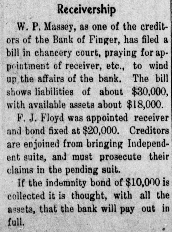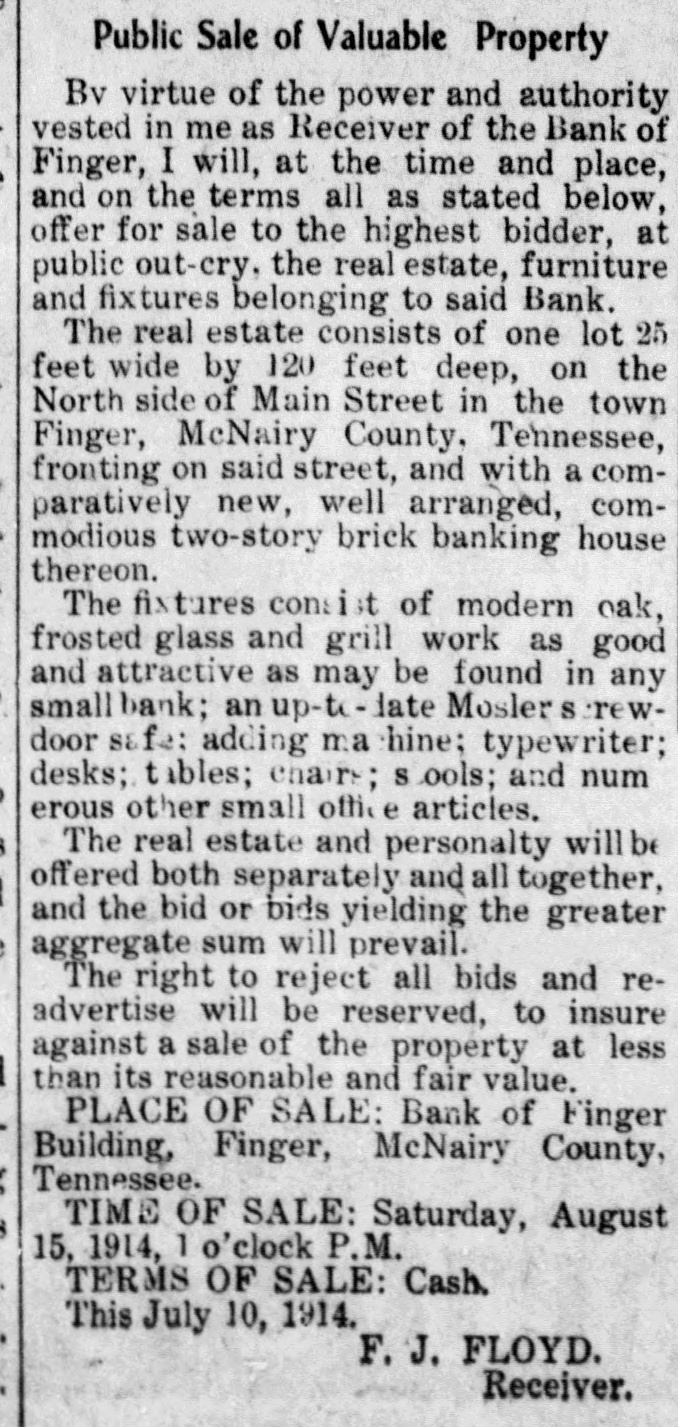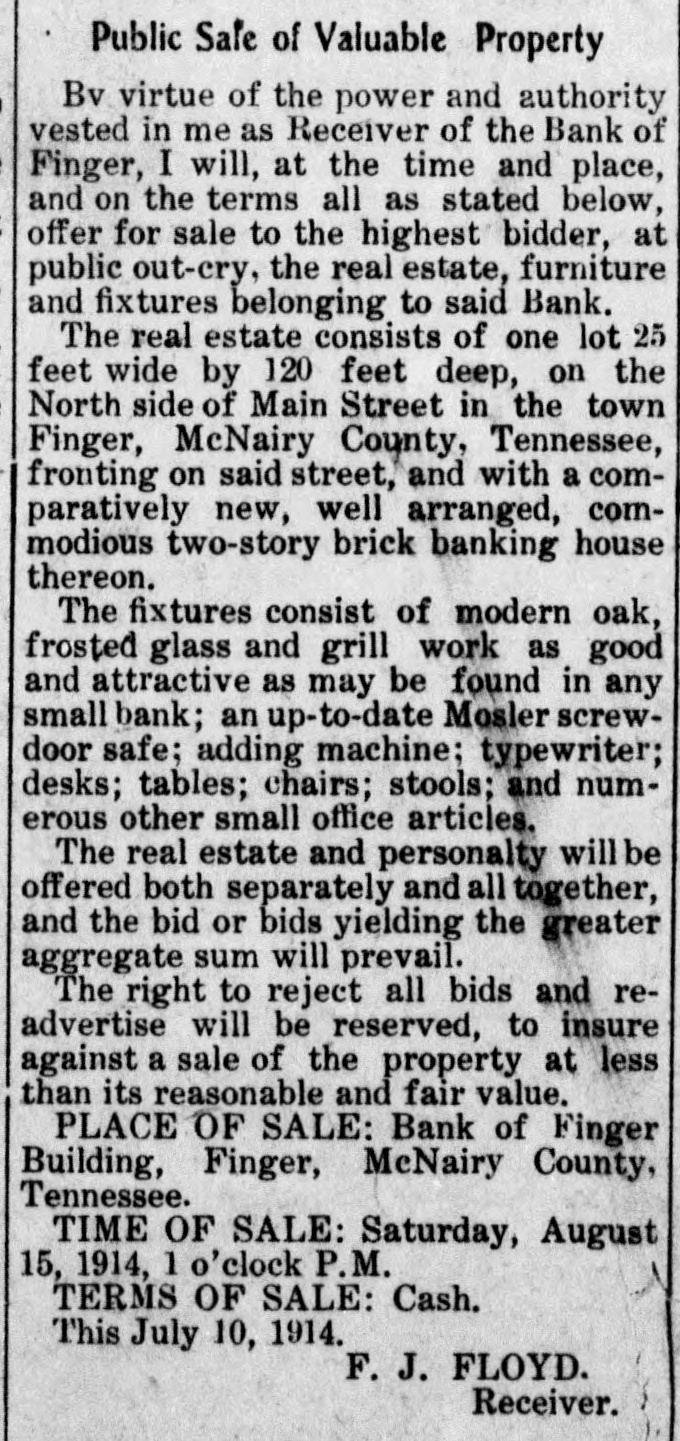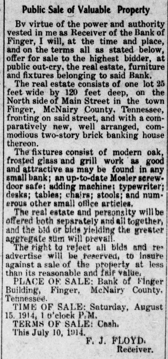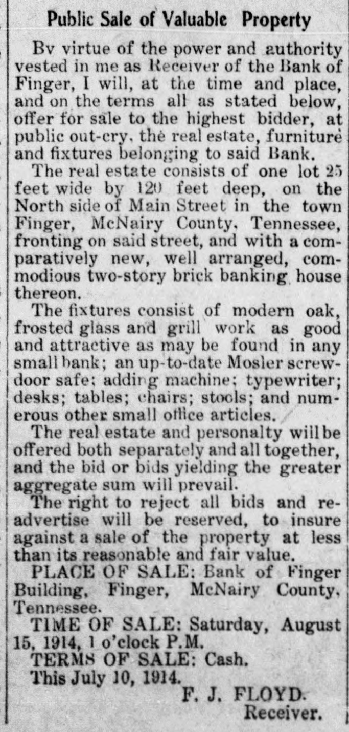 PERSONALS F. S. Elgin, of Memphis, was here professionally Monday. BARGAINS IN SLIPPERS: We are selling all of our slippers at cost. E. F. Hendrix & Sons. F. J. Floyd, receiver of the Bank of Finger, was here Monday in the interest of the bank's business. All our slippers will be sold at cost E. F. Hendrix & Sons. Albert Brint, of Cleburn. Texas has been visiting relatives here for a week. He is a nephew of Mrs. M. L. Robinson, of Selmer. Bring us your shelled corn; we have what you want. Bryant, Richardson & Co. John Struder has been on the sick list two or three weeks at home. He expects to go to East St. Louis with his carpenter crew next week. We sell and buy all kinds of nice seed and eating potatoes. Bryant. Richardson & Co. Capt. H. A. Hunter passed the 9 )th milestone last Monday. He is somewhat feeble but able to come down town almost every day. Next to R. K. Hendrix of Bethel he is perhaps the oldest man in the county. "We all wish him still many natal days. We have the most complete line of groceries and feedstuff in town. Telephone us your wants, both phones. 444. Bryant, Richardson & Co. Mr. and Mrs. D. F. Dillon, of Cairo, are spending several days with McNairy relatives and friends. Mr. Dillon spent a pleasant social hour with us Monday. We have nice meat from 121 to 23c, and lard for everybody. Bryant, Richardson & Co. Miss Mary Lea Rice, making her home with her uncle A. C. Lea at Shreveport, La., came last week to spend some time with her grandmother, Mrs. Jane Lea. We have just began handling "Thompson's Light Bread", which is the best on the market. Bryant, Richardson & Co. Miss Vessie Carothers left last Sunday to visit relatives in Memphis. To the Voters of McNairy County: I am a candidate for the office of Sheriff. Your vote and influence solicited. Respectfully, J. H. HILL. adv July 15, 1914. FOR SALE-My place known as the West Emming or Jim Tally place, on the Corinth and Selmer read, near Gravelhiil. For particulars write Wm. Harrison, care Box 254, West Point, Miss.