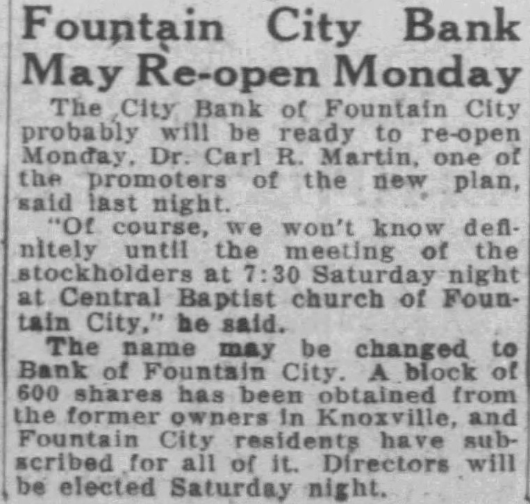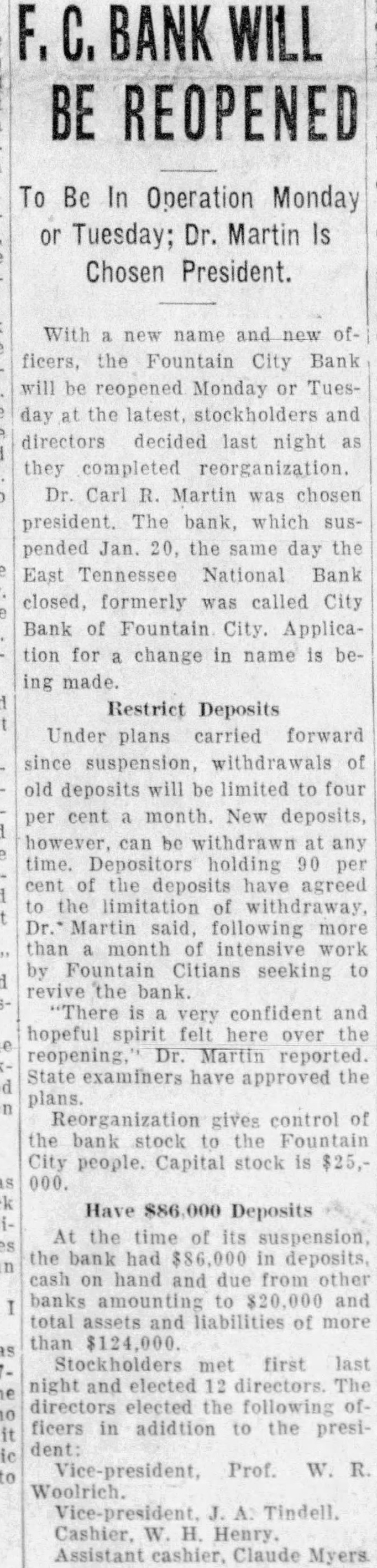 With new name ficers, the Fountain City Bank be reopened Monday or Tuesday the latest, stockholders and directors decided last night they completed reorganization. Dr. Carl Martin was chosen president. The bank, which suspended Jan. 20, the same day the East Tennessee National Bank closed, formerly was called City Bank of Fountain City. Application for change in name is being made.