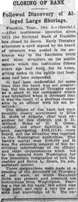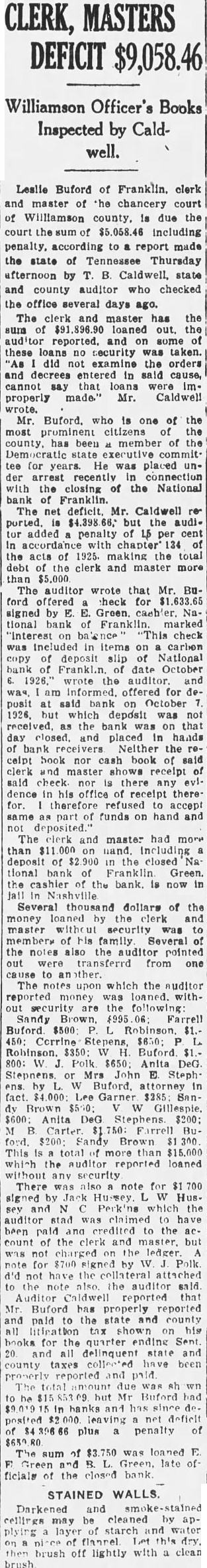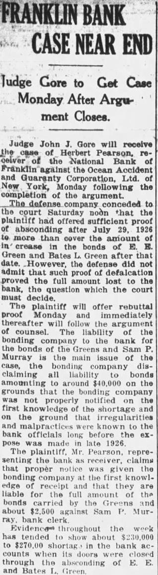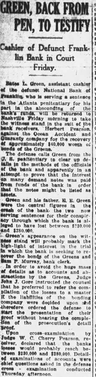 Seeking the recovery from 68 @tockholders of the National Bank of Franklin of $50,654, alleged to have been wrongfully paid to them as dividends of the bank at a time when the institution is said to have been insolvent, bill of equity was filed by Herbert Pearson, receiver for the defunct bank, with the clerk of the United States district court Thursday. The bill sets out the history of the failure of the National Bank of Franklin which resulted in the indictment and later the imprisonment of E E. Green, cashier of the bank. and his son, Bates Green. It sets out that Herbert Pearson was appointed receiver for the bank October 19, 1926, by the comptroller of currency at Washington, following the discovery that the bank was insolvent and the closing of its doors week prior to that time. At the time that the shortage was found the elder Green entered plea of guilty in federal court and received long term in the Atlanta prison. His son likewise pleaded guilty to violation of the national banking laws and was sent to prison. The shortage, which was first reported as being about half milllion dollars. was later placed at about $150,000. In his bill the receiver, Mr. Pearson, prays recovery of the amount dividends which had been paid to the 68 stockholders since 1921 when the bank is said to have become insolvent. These amounts with interest accrued since May 4, 1927 amount to $50,564. At the time that these amounts were paid, the bill sets forth, the bank had no earnings although these sums were alleged to have come out of surplus profits and Both sections 5199 and 5204 of the revised statutes of the United States were violated according to the bill drawn up for the receiver Bass, Berry and Sims, his attornoys Section 5199 provides: "The directors of any association may, declare divIdend of 80 much of the net profits of the association as they shall judge expedient, but each association shall, before the declaration of dididend, carry one tenth part of its net profits of the preceding half year to its surplus fund until the same shall amount to 20 per centum of its capital stock. Section 5204 states: "No association, or any member thereof, shall, during the time it shall continue its banking operations. withdraw, or permit to be withdrawn, either in the form of dividends otherwise any portion of its capital. If losses have at any time been sustained by any such association, equal to or exceeding its undivided profts, then on hand, no dividend shall be made; and no dividend shall ever be made by any association, while continues its banking operations, to an amount greater than its net profits then on hand, deducting therefrom its losses and bad debta. within two weeks. They are now roughly 1,300, mostly in these sufficiently well forward for us to counties, will be planted so late as to be doubtful in result. There make rough estimate and we have to set aside the necessary funds likely to be an array of difficulties cover the cost of the rehabitation. In some of these counties even beThe remaining 20 counties are yond winter food, such as inability most difficult problem- They to meet levee and other taxes and still largely under water and to its depth and the second flood, ELECTRICIAN KILLED these counties will not be clear water until it is too late for safe (By Associated Press) Memphis, Tenn., June planting of normal crops. Lammons, 35, was electrocuted to"This means that harvest results day while fixing wire on an elecwill be most uncertain. We have set trfe drill at the plant of the Christie aside funds which will cover the Cut Stone company. He died while necessities of these 20 counties unon the way to hospital til the end of October next, when the result of the harvest will be PATOU FROCK known. It will then be necessary A Patou frock is sailor dress of entirely review the situation. TakIng the valley as a whole, approxi- heavy white crepe marocain. The mately 3,500,000 acres of crops were jumper is straight and short-sleeved these, and the skirt has cluster pleats. originally flooded out.