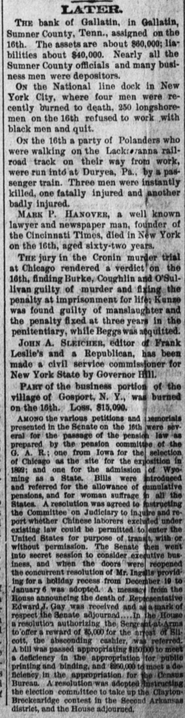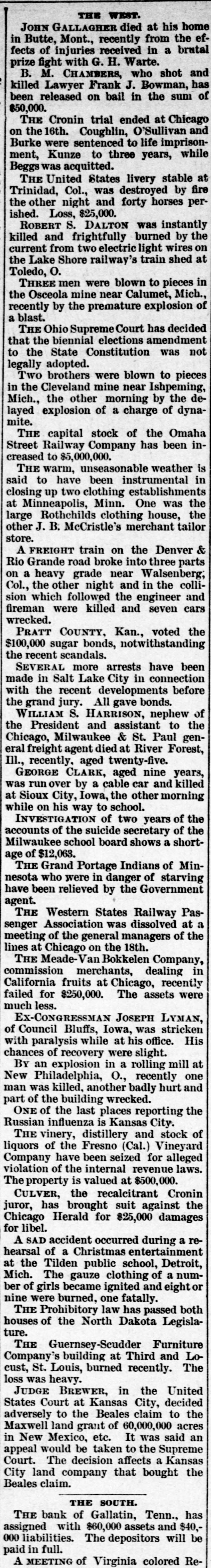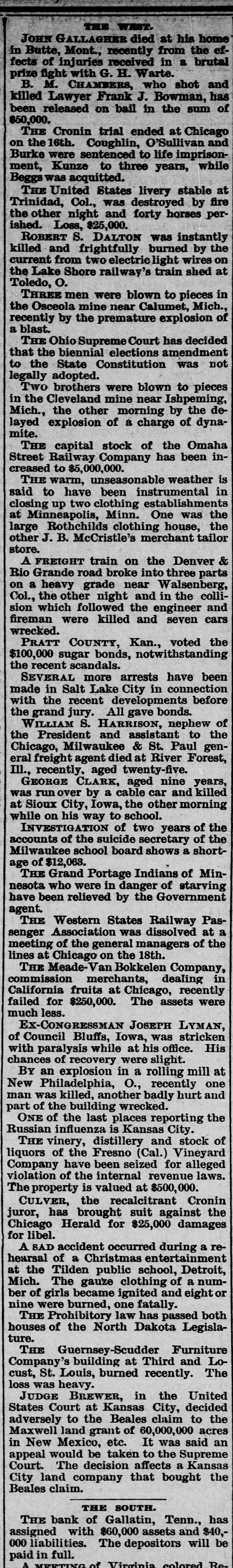 "ISMM SHE JOHN GALLAGHER died at his home in Butte, Mont., recently from the effects of injuries received in a brutal prize fight with G. H. Warte. B. M. CHAMBERS, who shot and killed Lawyer Frank J. Bowman, has JO uns the up neq uo released been $50,000. THE Cronin trial ended at Chicago on the 16th. Coughlin, O'Sullivan and Burke were sentenced to life imprisonment, Kunze to three years, while Beggs was acquitted. THE United States livery stable at Trinidad, Col., was destroyed by fire the other night and forty horses perished. Loss, $25,000. ROBERT S. DALTON was instantly killed and frightfully burned by the current from two electriclight wires on the Lake Shore railway's train shed at O Tolled THREE men were blown to pieces in the Osceola mine near Calumet, Mich., recently by the premature explosion of blast B THE Ohio Supreme Court has decided that the biennial elections amendment to the State Constitution was not legally adopted. Two brothers were blown to pieces in the Cleveland mine near Ishpeming, Mich., the other morning by the delayed explosion of a charge of dynamite. THE capital stock of the Omaha Street Railway Company has been increased to $5,000,000. THE warm, unseasonable weather is said to have been instrumental in closing up two clothing establishments at Minneapolis, Minn. One was the large Rothchilds clothing house, the other J. B. McCristle's merchant tailor store. A FREIGHT train on the Denver & Rio Grande road broke into three parts on a heavy grade near Walsenberg, Col., the other night and in the collision which followed the engineer and fireman were killed and seven cars wrecked. PRATT COUNTY, Kan., voted the $100,000 sugar bonds, notwithstanding the recent scandals. SEVERAL more arrests have been made in Salt Lake City in connection with the recent developments before the grand jury. All gave bonds. WILLIAM S. HARRISON, nephew of the President and assistant to the Chicago, Milwaukee & St. Paul general freight agent died at River Forest, Ill., recently, aged twenty-five. GEORGE CLARK, aged nine years, was run over by a cable car and killed at Sioux City, Iowa, the other morning while on his way to school. INVESTIGATION of two years of the accounts of the suicide secretary of the Milwaukee school board shows a short$12,098 JO ese THE Grand Portage Indians of Minnesota who were in danger of starving have been relieved by the Government agent. THE Western States Railway Passenger Association was dissolved at a meeting of the general managers of the lines at Chicago on the 18th. THE Meade-Van Bokkelen Company, commission merchants, dealing in California fruits at Chicago, recently failed for $250,000. The assets were much less. Ex-CONGRESSMAN JOSEPH LYMAN, of Council Bluffs, Iowa, was stricken with paralysis while at his office. His chances of recovery were slight. By an explosion in a rolling mill at New Philadelphia, O., recently one man was killed, another badly hurt and part of the building wrecked. ONE of the last places reporting the Russian influenza is Kansas City. THE vinery, distillery and stock of liquors of the Fresno (Cal.) Vineyard Company have been seized for alleged violation of the internal revenue laws. The property is valued at $500,000. CULVER, the recalcitrant Cronin juror, has brought suit against the Chicago Herald for $25,000 damages for libel. -0.1 e Supmp accident avs V hearsal of a Christmas entertainment at the Tilden public school, Detroit, Mich. The gauze clothing of a number of girls became ignited and eight or nine were burned, one fatally. THE Prohibitory law has passed both houses of the North Dakota Legislature. THE Guernsey-Scudder Furniture Company's building at Third and Locust, St. Louis, burned recently. The loss was heavy. JUDGE BREWER, in the United States Court at Kansas City, decided adversely to the Beales claim to the Maxwell land grant of 60,000,000 acres in New Mexico, etc. It was said an appeal would be taken to the Supreme Court. The decision affects a Kansas City land company that bought the Beales claim. 'HLNOS THE THE bank of Gallatin, Tenn., has assigned with $60,000 assets and $40,000 liabilities. The depositors will be paid in full. Virginia de