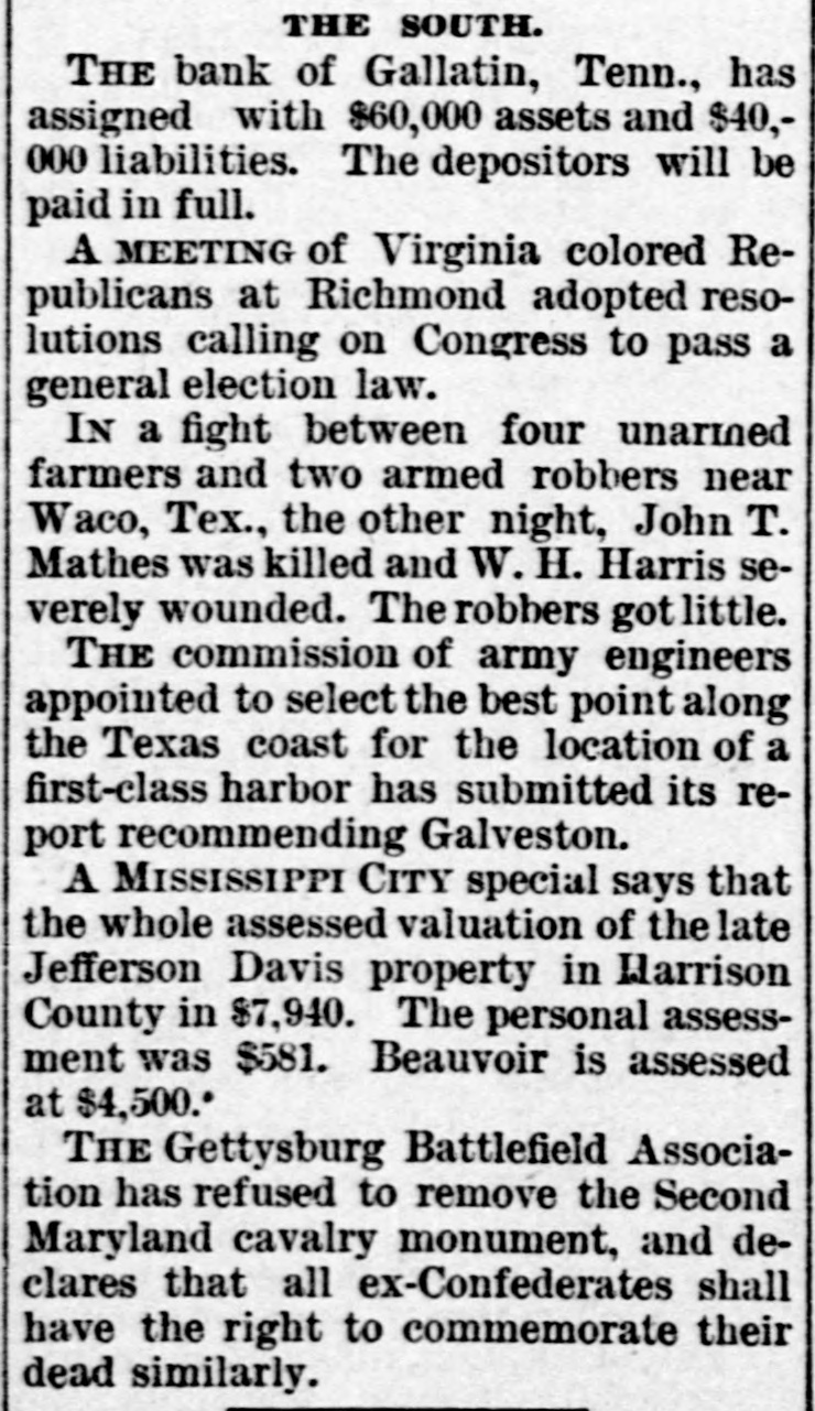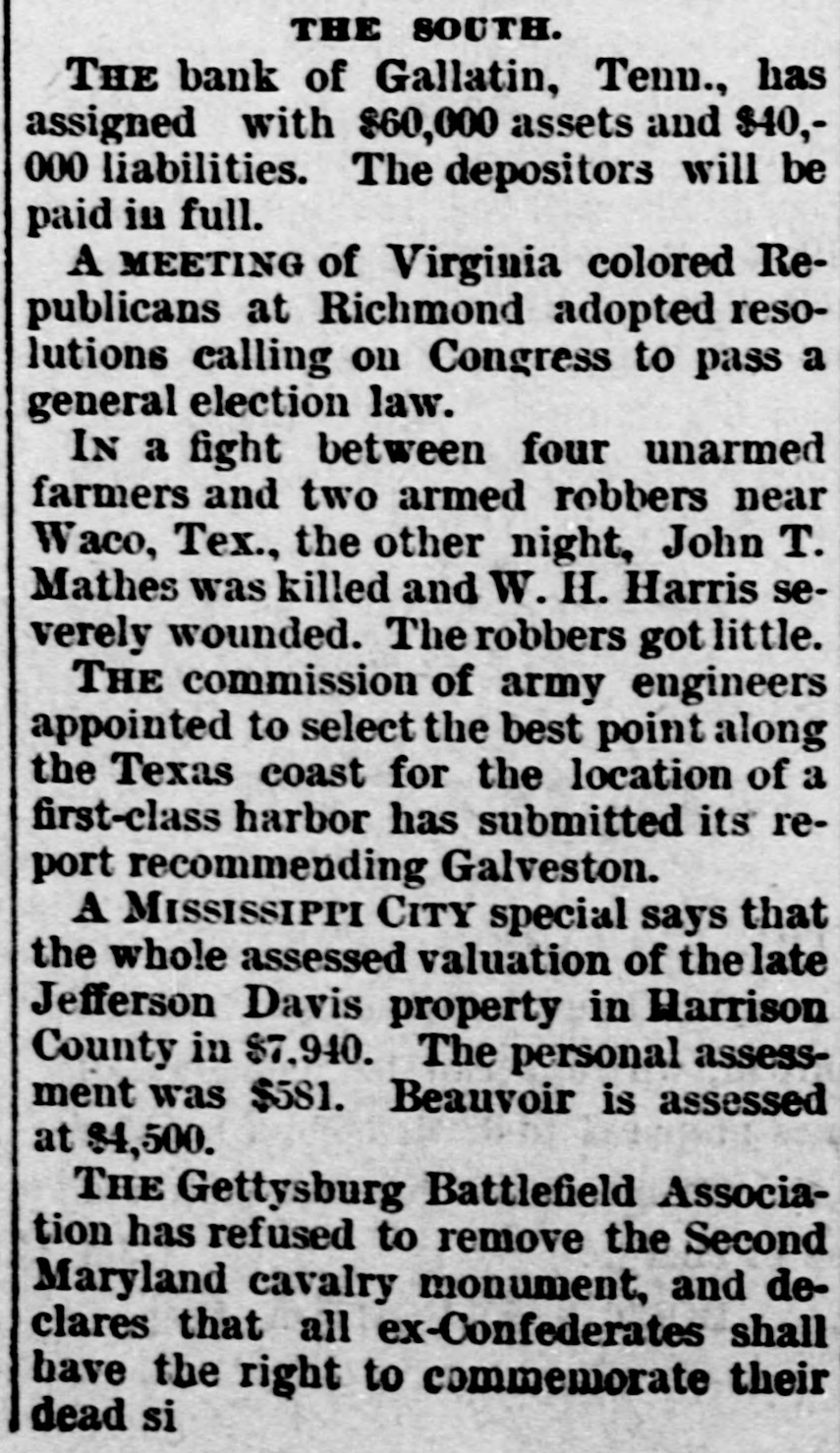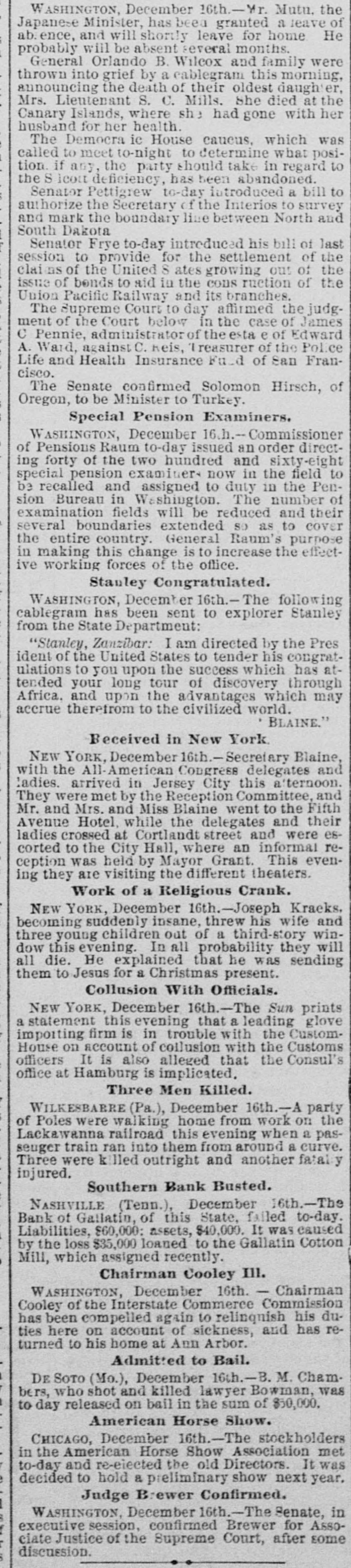 "ISMM SHE JOHN GALLAGHER died at his home in Butte, Mont., recently from the effects of injuries received in a brutal prize fight with G. H. Warte. B. M. CHAMBERS, who shot and killed Lawyer Frank J. Bowman, has JO uns the up neq uo released been $50,000. THE Cronin trial ended at Chicago on the 16th. Coughlin, O'Sullivan and Burke were sentenced to life imprisonment, Kunze to three years, while Beggs was acquitted. THE United States livery stable at Trinidad, Col., was destroyed by fire the other night and forty horses perished. Loss, $25,000. ROBERT S. DALTON was instantly killed and frightfully burned by the current from two electriclight wires on the Lake Shore railway's train shed at O Tolled THREE men were blown to pieces in the Osceola mine near Calumet, Mich., recently by the premature explosion of blast B THE Ohio Supreme Court has decided that the biennial elections amendment to the State Constitution was not legally adopted. Two brothers were blown to pieces in the Cleveland mine near Ishpeming, Mich., the other morning by the delayed explosion of a charge of dynamite. THE capital stock of the Omaha Street Railway Company has been increased to $5,000,000. THE warm, unseasonable weather is said to have been instrumental in closing up two clothing establishments at Minneapolis, Minn. One was the large Rothchilds clothing house, the other J. B. McCristle's merchant tailor store. A FREIGHT train on the Denver & Rio Grande road broke into three parts on a heavy grade near Walsenberg, Col., the other night and in the collision which followed the engineer and fireman were killed and seven cars wrecked. PRATT COUNTY, Kan., voted the $100,000 sugar bonds, notwithstanding the recent scandals. SEVERAL more arrests have been made in Salt Lake City in connection with the recent developments before the grand jury. All gave bonds. WILLIAM S. HARRISON, nephew of the President and assistant to the Chicago, Milwaukee & St. Paul general freight agent died at River Forest, Ill., recently, aged twenty-five. GEORGE CLARK, aged nine years, was run over by a cable car and killed at Sioux City, Iowa, the other morning while on his way to school. INVESTIGATION of two years of the accounts of the suicide secretary of the Milwaukee school board shows a short$12,098 JO ese THE Grand Portage Indians of Minnesota who were in danger of starving have been relieved by the Government agent. THE Western States Railway Passenger Association was dissolved at a meeting of the general managers of the lines at Chicago on the 18th. THE Meade-Van Bokkelen Company, commission merchants, dealing in California fruits at Chicago, recently failed for $250,000. The assets were much less. Ex-CONGRESSMAN JOSEPH LYMAN, of Council Bluffs, Iowa, was stricken with paralysis while at his office. His chances of recovery were slight. By an explosion in a rolling mill at New Philadelphia, O., recently one man was killed, another badly hurt and part of the building wrecked. ONE of the last places reporting the Russian influenza is Kansas City. THE vinery, distillery and stock of liquors of the Fresno (Cal.) Vineyard Company have been seized for alleged violation of the internal revenue laws. The property is valued at $500,000. CULVER, the recalcitrant Cronin juror, has brought suit against the Chicago Herald for $25,000 damages for libel. -0.1 e Supmp accident avs V hearsal of a Christmas entertainment at the Tilden public school, Detroit, Mich. The gauze clothing of a number of girls became ignited and eight or nine were burned, one fatally. THE Prohibitory law has passed both houses of the North Dakota Legislature. THE Guernsey-Scudder Furniture Company's building at Third and Locust, St. Louis, burned recently. The loss was heavy. JUDGE BREWER, in the United States Court at Kansas City, decided adversely to the Beales claim to the Maxwell land grant of 60,000,000 acres in New Mexico, etc. It was said an appeal would be taken to the Supreme Court. The decision affects a Kansas City land company that bought the Beales claim. 'HLNOS THE THE bank of Gallatin, Tenn., has assigned with $60,000 assets and $40,000 liabilities. The depositors will be paid in full. Virginia de