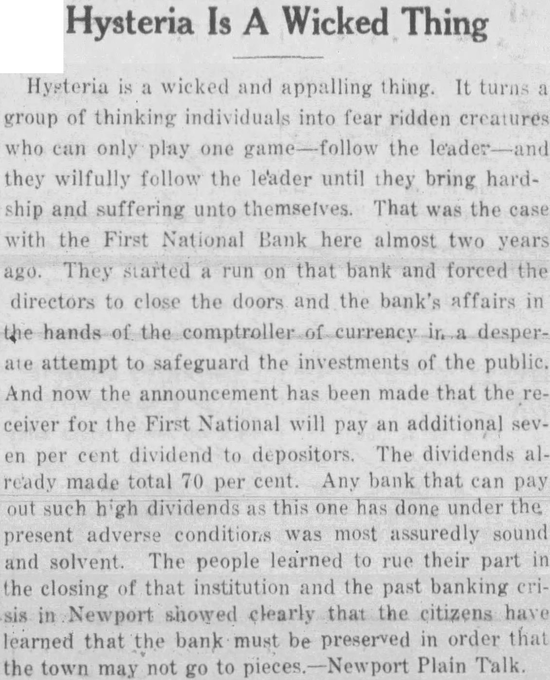 Hysteria Is A Wicked Thing Hysteria is a wicked and appalling thing. It turns a group of thinking individuals into fear ridden creatures who can only play one game-follow the leader-and they wilfully follow the leader until they bring hardship and suffering unto themselves. That was the case with the First National Bank here almost two years ago. They started a run on that bank and forced the directors to close the doors and the bank's affairs in the hands of the comptroller of currency desperate attempt to safeguard the investments of the public. And now the announcement has been made that the receiver for the First National will pay an additional seven per cent dividend to depositors. The dividends already made total 70 per cent. Any bank that can pay out such high dividends as this one has done under the present adverse conditions was most assuredly sound and solvent. The people learned to rue their part in the closing of that institution and the past banking crisis in Newport showed clearly that the citizens have learned that the bank must be preserved in order that the town may not go to pieces.-Newport Plain Talk.