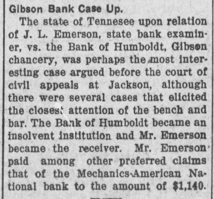 o GOOD SHOWING IN ANNUAL RE. PORT OF J. L. emerson, THE STATE superintendent. EMERSON SUBMITS REPORT 1 Few Failures Are for Most Part Quick. ly Adjusted to Satisfaction of Depositors-News at the State Capitol. S The report in part of J. -Nashville. L. Emerson, superintendent of state banks, to Gov. Rye is as follows: "Conditions were generally satisfactory during 1915. Directors and committees were more active, managers were more careful, and the banking business was more prosperous. There e eare now 399 state banks and eight y branch banks. Eight hundred and thirty-eight examinations were made 0 during the year. Two published statements were called for, one on March g e 30 and the other on Nov. 10. A com e parison of the March and November figures shows that the total resources of the banks increased $7,990,006.58. -deposits increaserd $6,810,914.38, and e reserve increased $1,085,490.78. ts "With reference to the bank failures er during the year, the following encoure aging facts are to be noted: The ePlanters Bank and Trust Company, of oTullahoma, failed, but depositors were ls paid in full within a very short time, en and a trustee representing the stock he holders is now liquidating the remain eing assets. On Feb. 4 the Peoples ne bank, Collierville, became involved in on some difficulties and closed its doors. Its troubles were soon adjusted, how ever, and it reported on Feb. 18, in ut volving no loss to depositors. he "Early in January the Citizens Bank his Maury City, failed. Every effort was he at once made to secure rapid liquida at tion, but since some unusual local contht ditions made it seem probable that his long and expensive litigation would be on necessary, it was the choice of the de. ent positors that a compromise settlement bse of 70 per cent be effected. This plan en was carried out after being submitted en to and approved by the court. led "There are some unfinished matters the ved in connection with banks that failed during 1914. ver les"The assets of the Citizens' bank owHuntingdon, were sold to the Farmers the State bank, the latter assuming the ose payment of depositors. Fifty per cent joy already has been paid, another divi imdend will be paid soon, and the pay tenment of the full amount due creditors inwill unoubtedly be made within the ace. course of a few months. "Another dividend of 12 per cent any making a total of 87 per cent, ha of been paid the creditors of the Van Bu ere ren bank, Spencer, and there is a sat ons isfactory prospect that payment of th able remaining 13 per cent will be mad verthis year. and "I am still acting as receiver of th the Mercantile bank, Memphis, and suit It pending. for the recovery of large sums are stil of "In the case of the Bank of Hun nce boldt, liquidation is very slow, but su in has been brought and is now pendin that against the directors for an amount hall sufficient to pay all creditors in ful the "The personnel of the departmer has had no changes and is composed hod of J. L. Emerson, superintendent; John Heflin, assistant; D. C. Borden, A. emWilliams, J. F. Joyner, H C Crumblis be and N B. Gentry, examiners; J. 1 Turrentine, secretary."