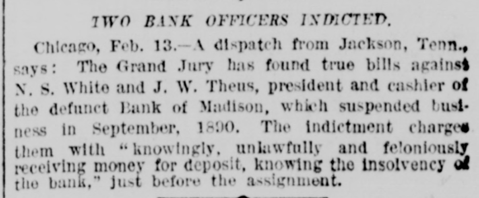 TWO BANK OFFICERS INDICTED. Chicago, Feb. 13.-A dispatch from Jackson, Tenn., says: The Grand Jury has found true bills against N. S. White and J. W. Theus, president and cashier of the defunct Bank of Madison, which suspended bustness in September, 1890. The indictment charges them with "knowingly, unlawfully and feloniously of receiving money for deposit, knowing the insolvency the bank," just before the assignment.