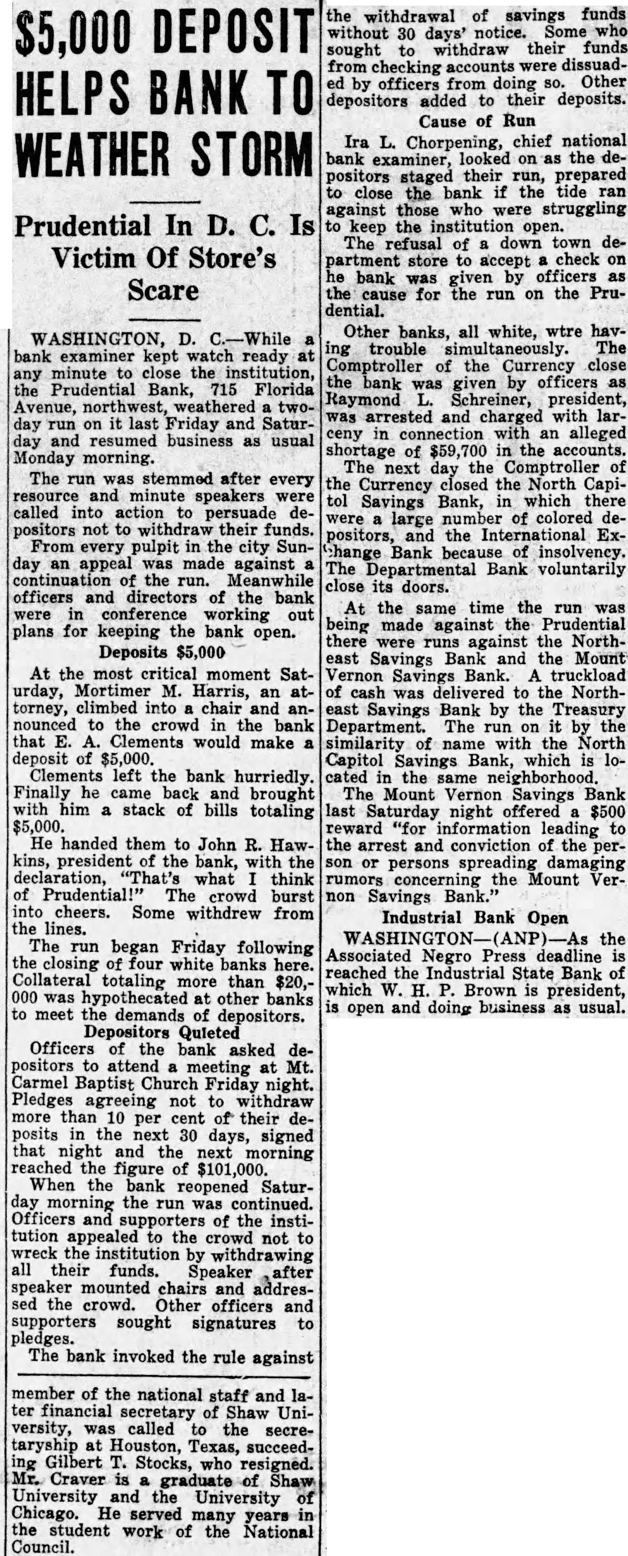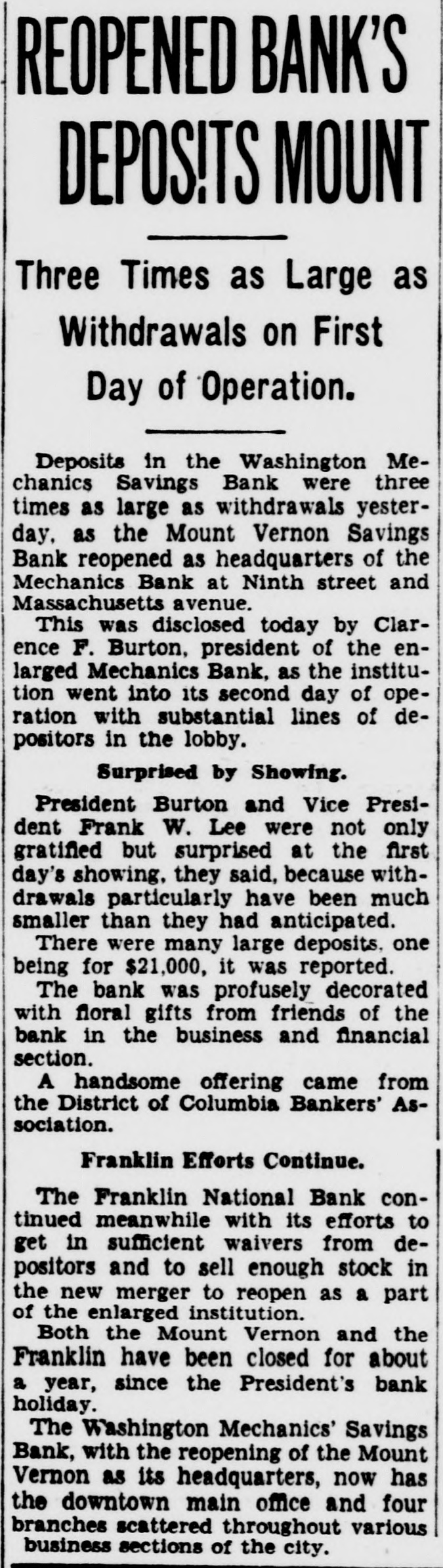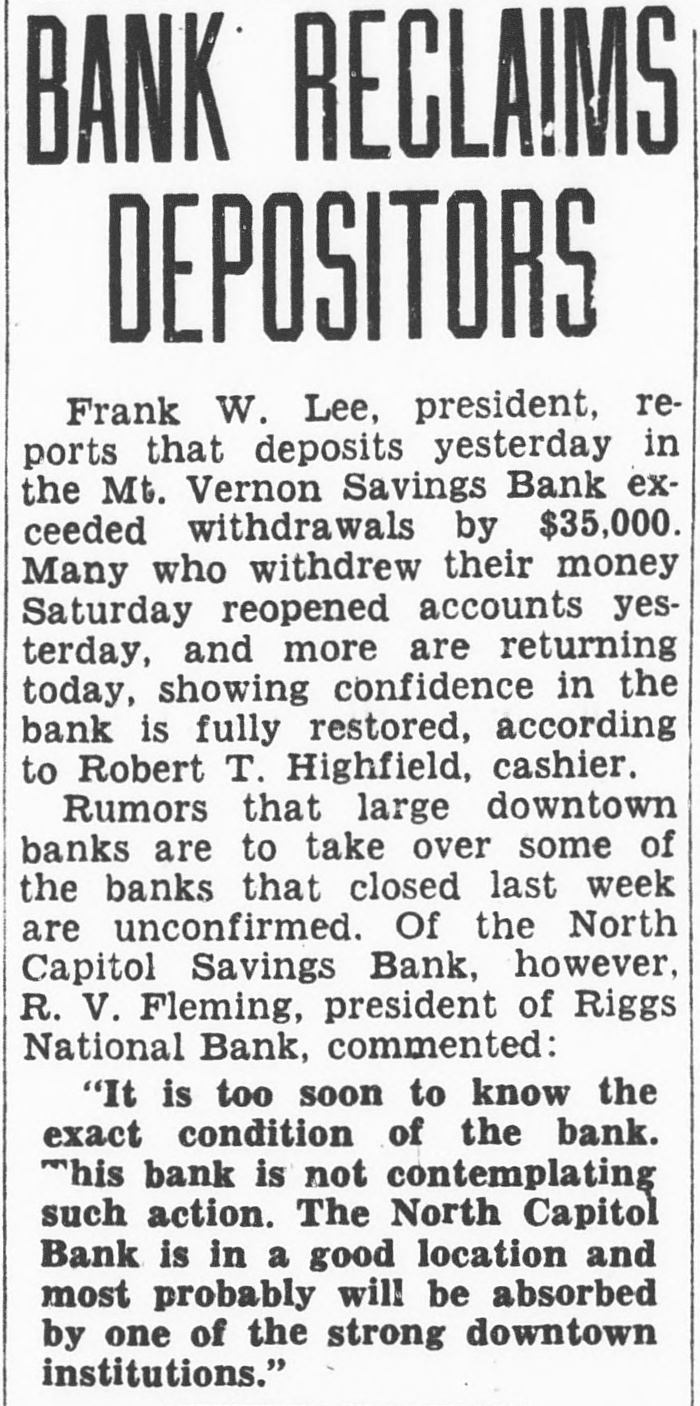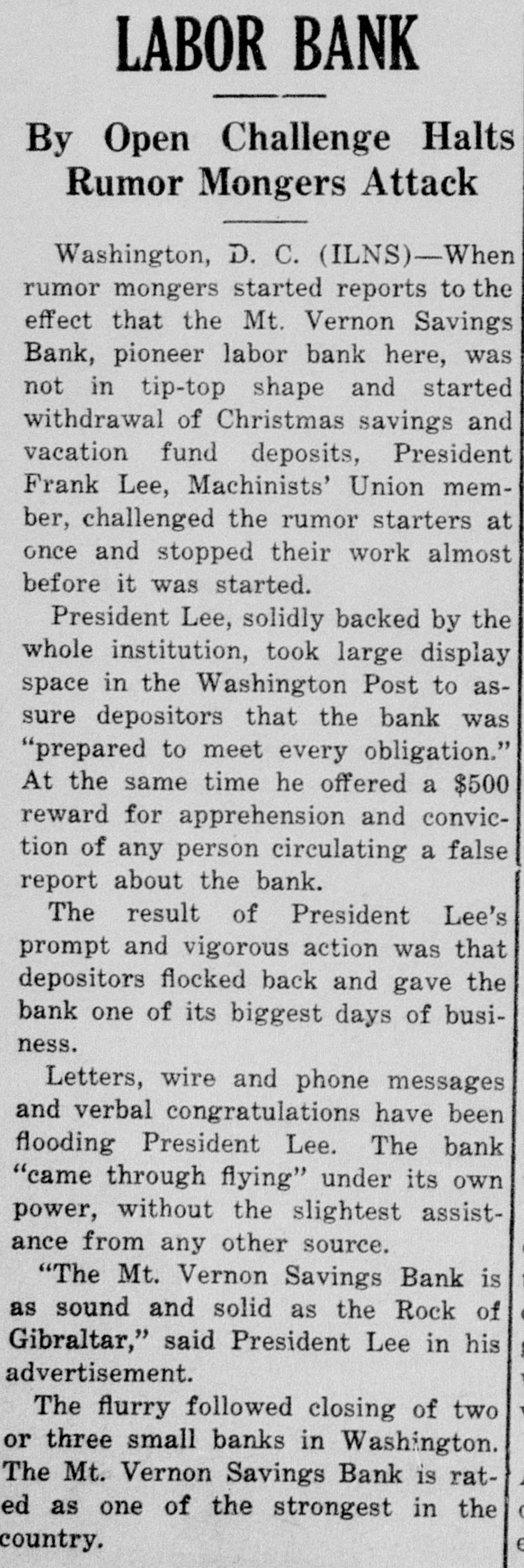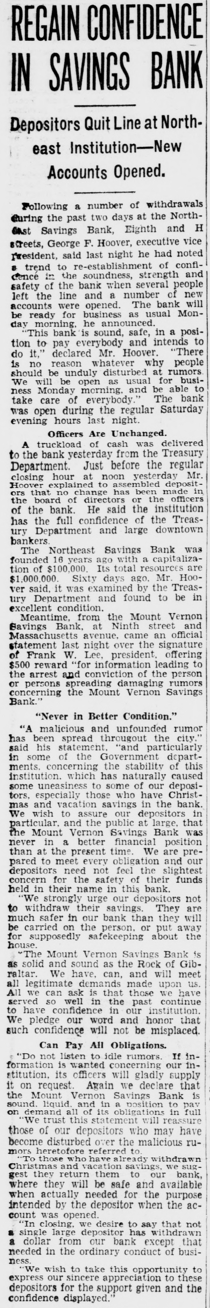 REGAIN CONFIDENCE IN SAVINGS BANK Depositors Quit Line at Northeast Institution-New Accounts Opened. Following a number of withdrawals during the past two days at the North- H east Savings Bank, Eighth and streets, George F. Hoover, executive vice resident, said last night he had noted trend to re-establishment of confi- and dencé a in the soundness, strength safety of the bank when several people left the line and a number of new will accounts were opened. The bank Monbe ready for business as usual day morning, he announced. This bank is sound, safe, in a posi- to tion to pay everybody and intends "There do it," declared Mr. Hoover. is no reason whatever why people be unduly disturbed at rumors will be open as able to morning, and ness should We Monday usual be The for busi- bank take care of everybody. was open during the regular Saturday evening hours last night. Officers Are Unchanged. truckload of cash was delivered to A the bank yesterday from the Treasury Department. Just before the regular Mr. hour at noon yesterday depositclosing to assembled in ors no change has officers Hoover the that board explained of directors or been the made of the bank. He said the institution the full confidence of the Treashas ury Department and large downtown bankers. Northeast Savings Bank was The 16 years ago with a capitaliza- are Its total Sixty days ago, $1,000,000. tion founded of $100,000. resources Mr. Treas- Hooit was examined by in and ury ver said, Department found the to be excellent condition. Meantime, from the Mount Vernon and Bank, at Ninth street official Savings avenue, came an last night over the of W. Lee, president, to statement Massachusetts Frank leading signature offering reward "for information and conviction of spreading the $500 persons arrest damaging the Savings rumors person or concerning the Mount Vernon Bank. "Never in Better Condition." malicious and unfounded rumor has "A been spread througout the city, his statement. "and of the Government in the stability said some concerning particularly depart- of this which has uneasiness to some of our ments. institution. some naturally have Christ- deposi- caused those who bank. vacation savings in in to assure our tors, mas We wish and especially depositors the that particular. and the public at large, was the Mount Vernon Savings Bank in a better financial position never than at the present time. We are pre- our pared to meet every obligation and depositors need not feel the slightest funds concern for the safety of their held in their name in this bank. We strongly urge our depositors not their savings. in our bank than much to withdraw safer They put they away will are carried on the person. or the for be supposedly safekeeping about house. Vernon Savings Bank is and sound as the Rock raltar. as We have, can, and solid The Mount will of meet Gib- us All demands made upon have ask is that those we all served legitimate we can so well in the past institution. continue have confidence in our that to pledge our word and honor such We confidence will not be misplaced. Can Pay All Obligations. not listen to idle rumors. If in- in'Do is wanted concerning our stitution. formation its officers will gladly supply that Again we declare is on Mount request. Bank to it Vernon Savings pav the liquid. and in a position in full sound. all of its obligations on We demand trust this statement will reassure have those of our depositors who may rubecome disturbed over the malicious mors heretofore who have referred already to. withdrawn sugTo those and vacation savings, we bank, gest will be safe and where Christmas they they return them to the our available purpose when actually needed for acintended by the depositor when the count 'In closing, was large opened. we depositor desire to has say withdrawn that that not a single dollar from our bank except busineeded a in the ordinary conduct of ness. wish to take this opportunity to these to We our sincere appreciation and the express depositors for the support " given confidence displayed.
