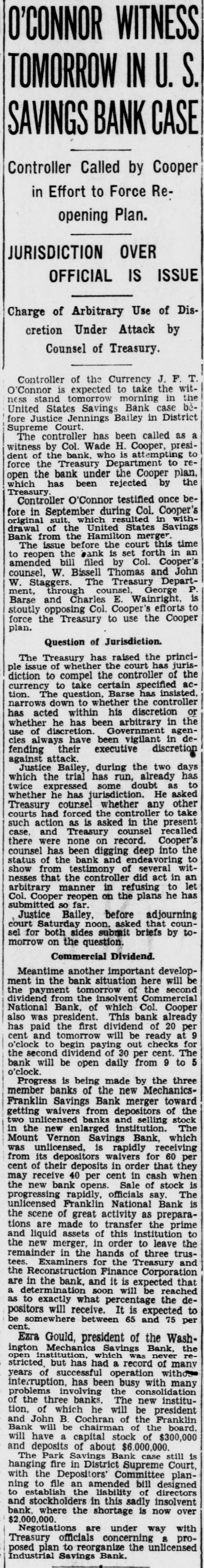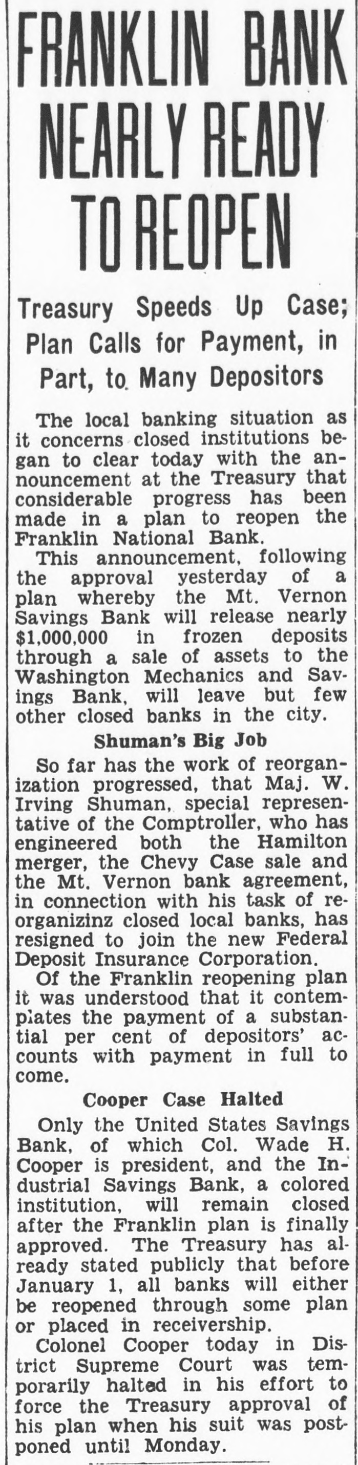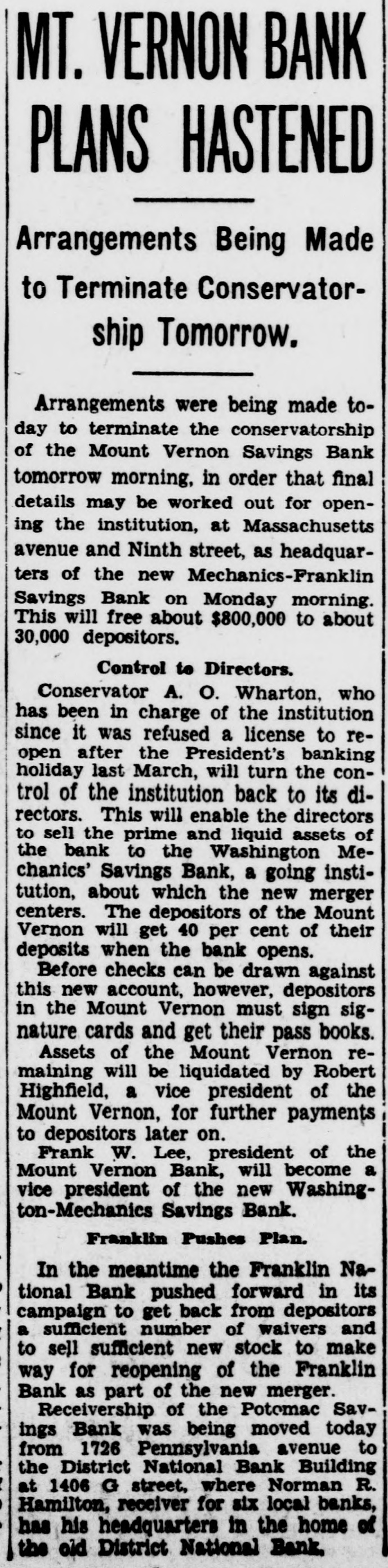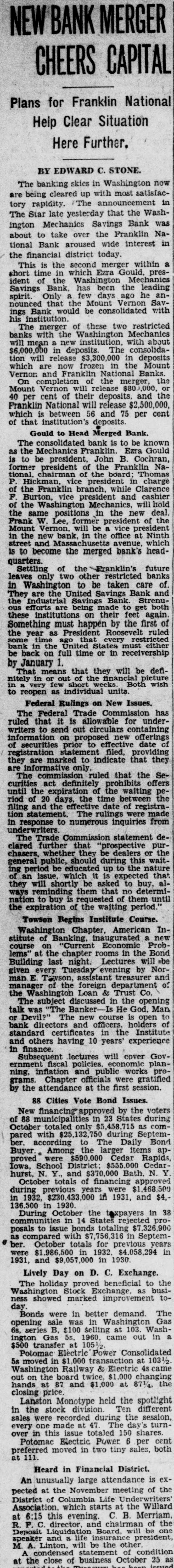REGAIN CONFIDENCE IN SAVINGS BANK Depositors Quit Line at Northeast Institution-New Accounts Opened. Following a number of withdrawals during the past two days at the North- H east Savings Bank, Eighth and streets, George F. Hoover, executive vice resident, said last night he had noted trend to re-establishment of confi- and dencé a in the soundness, strength safety of the bank when several people left the line and a number of new will accounts were opened. The bank Monbe ready for business as usual day morning, he announced. This bank is sound, safe, in a posi- to tion to pay everybody and intends "There do it," declared Mr. Hoover. is no reason whatever why people be unduly disturbed at rumors will be open as able to morning, and ness should We Monday usual be The for busi- bank take care of everybody. was open during the regular Saturday evening hours last night. Officers Are Unchanged. truckload of cash was delivered to A the bank yesterday from the Treasury Department. Just before the regular Mr. hour at noon yesterday depositclosing to assembled in ors no change has officers Hoover the that board explained of directors or been the made of the bank. He said the institution the full confidence of the Treashas ury Department and large downtown bankers. Northeast Savings Bank was The 16 years ago with a capitaliza- are Its total Sixty days ago, $1,000,000. tion founded of $100,000. resources Mr. Treas- Hooit was examined by in and ury ver said, Department found the to be excellent condition. Meantime, from the Mount Vernon and Bank, at Ninth street official Savings avenue, came an last night over the of W. Lee, president, to statement Massachusetts Frank leading signature offering reward "for information and conviction of spreading the $500 persons arrest damaging the Savings rumors person or concerning the Mount Vernon Bank. "Never in Better Condition." malicious and unfounded rumor has "A been spread througout the city, his statement. "and of the Government in the stability said some concerning particularly depart- of this which has uneasiness to some of our ments. institution. some naturally have Christ- deposi- caused those who bank. vacation savings in in to assure our tors, mas We wish and especially depositors the that particular. and the public at large, was the Mount Vernon Savings Bank in a better financial position never than at the present time. We are pre- our pared to meet every obligation and depositors need not feel the slightest funds concern for the safety of their held in their name in this bank. We strongly urge our depositors not their savings. in our bank than much to withdraw safer They put they away will are carried on the person. or the for be supposedly safekeeping about house. Vernon Savings Bank is and sound as the Rock raltar. as We have, can, and solid The Mount will of meet Gib- us All demands made upon have ask is that those we all served legitimate we can so well in the past institution. continue have confidence in our that to pledge our word and honor such We confidence will not be misplaced. Can Pay All Obligations. not listen to idle rumors. If in- in'Do is wanted concerning our stitution. formation its officers will gladly supply that Again we declare is on Mount request. Bank to it Vernon Savings pav the liquid. and in a position in full sound. all of its obligations on We demand trust this statement will reassure have those of our depositors who may rubecome disturbed over the malicious mors heretofore who have referred already to. withdrawn sugTo those and vacation savings, we bank, gest will be safe and where Christmas they they return them to the our available purpose when actually needed for acintended by the depositor when the count 'In closing, was large opened. we depositor desire to has say withdrawn that that not a single dollar from our bank except busineeded a in the ordinary conduct of ness. wish to take this opportunity to these to We our sincere appreciation and the express depositors for the support " given confidence displayed.